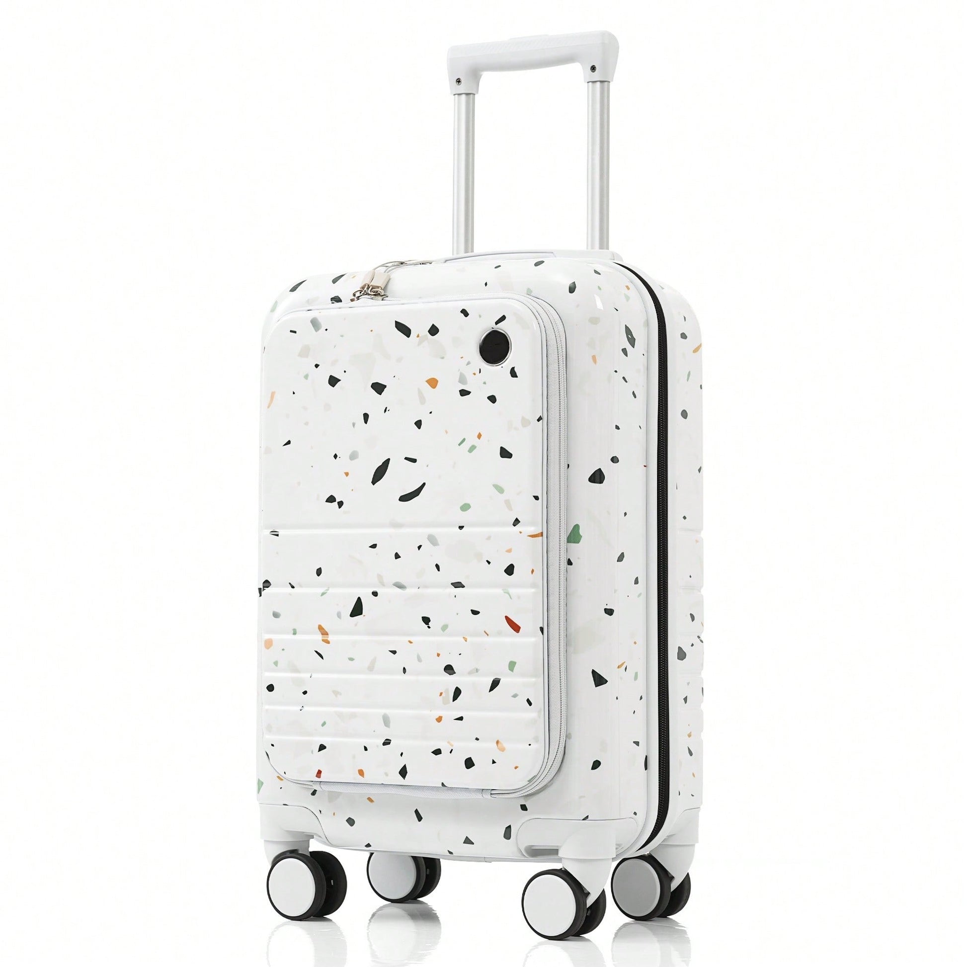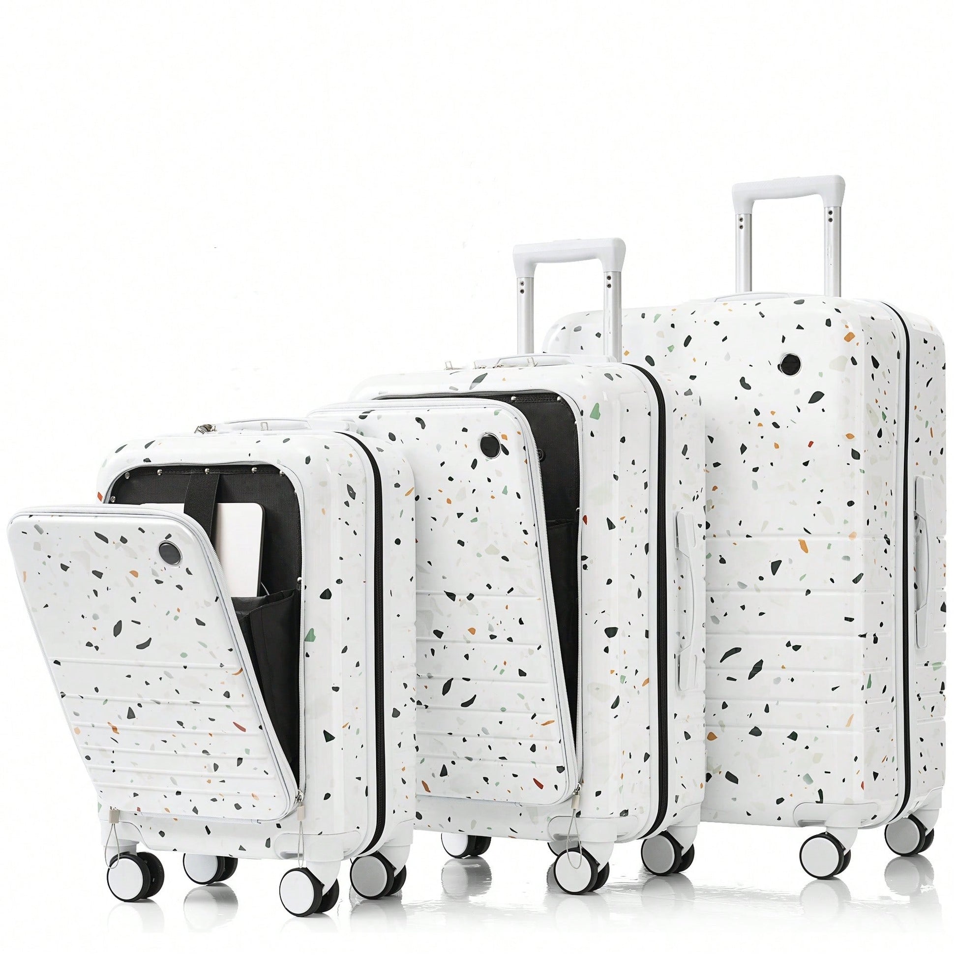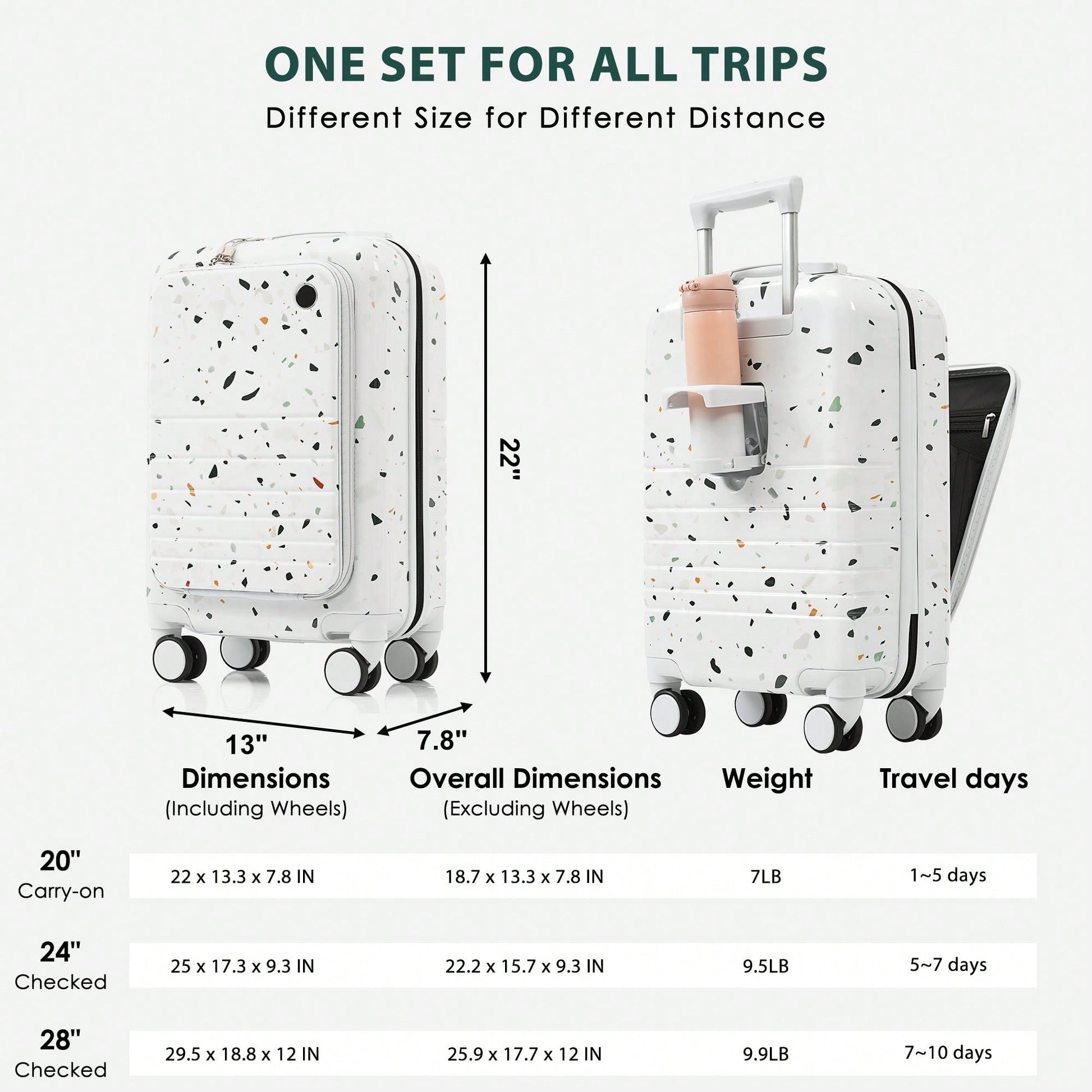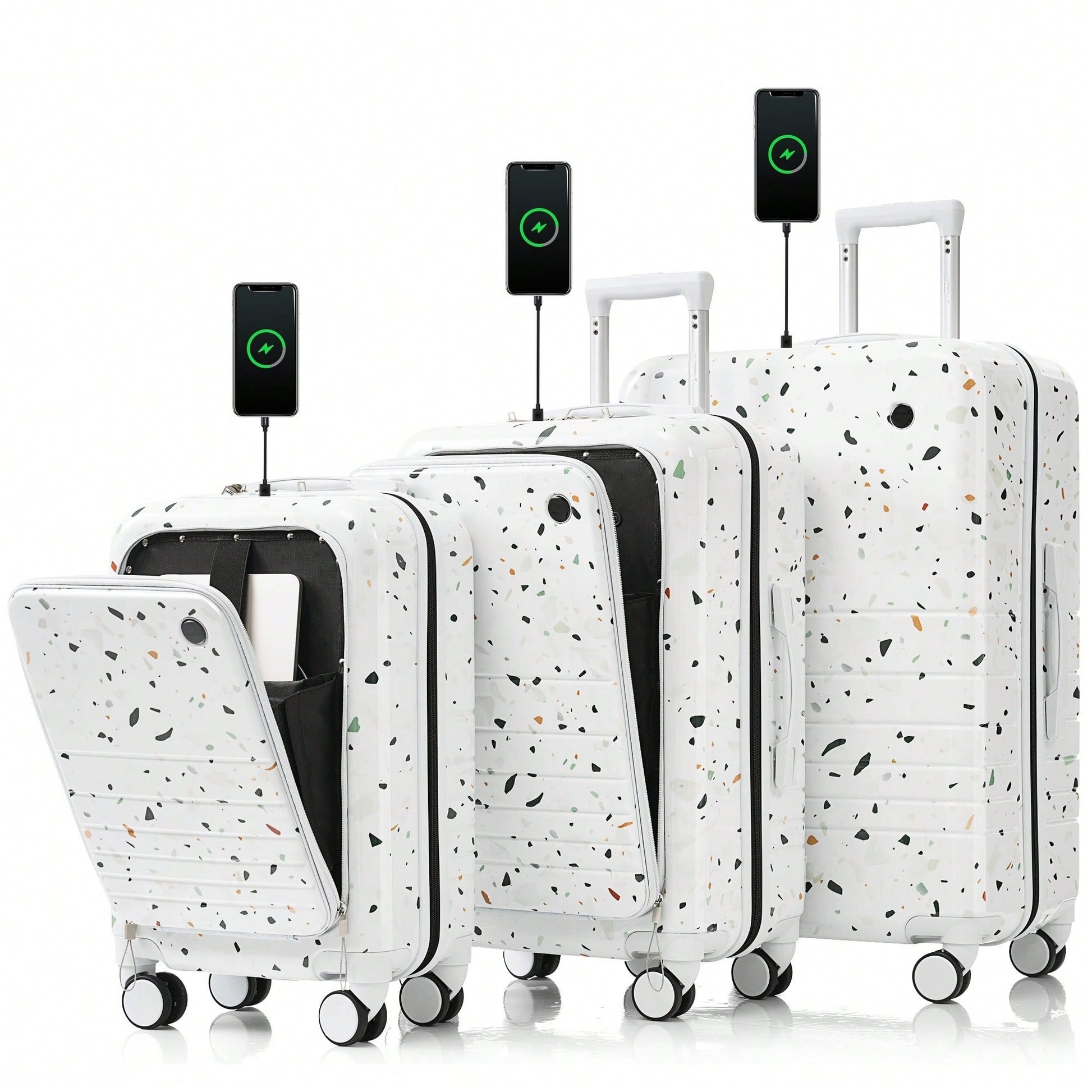 3-Piece Airline Approved Luggage Set with USB Port, Front Opening, Cup Holder, Durable ABS+PC Hard Shell, Spinner Wheels, Starry Sky White