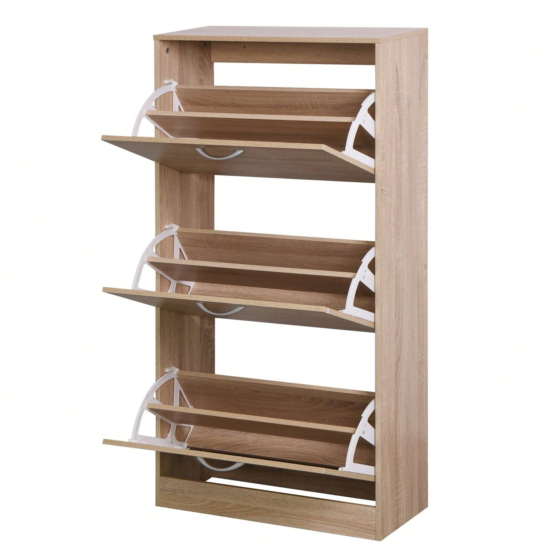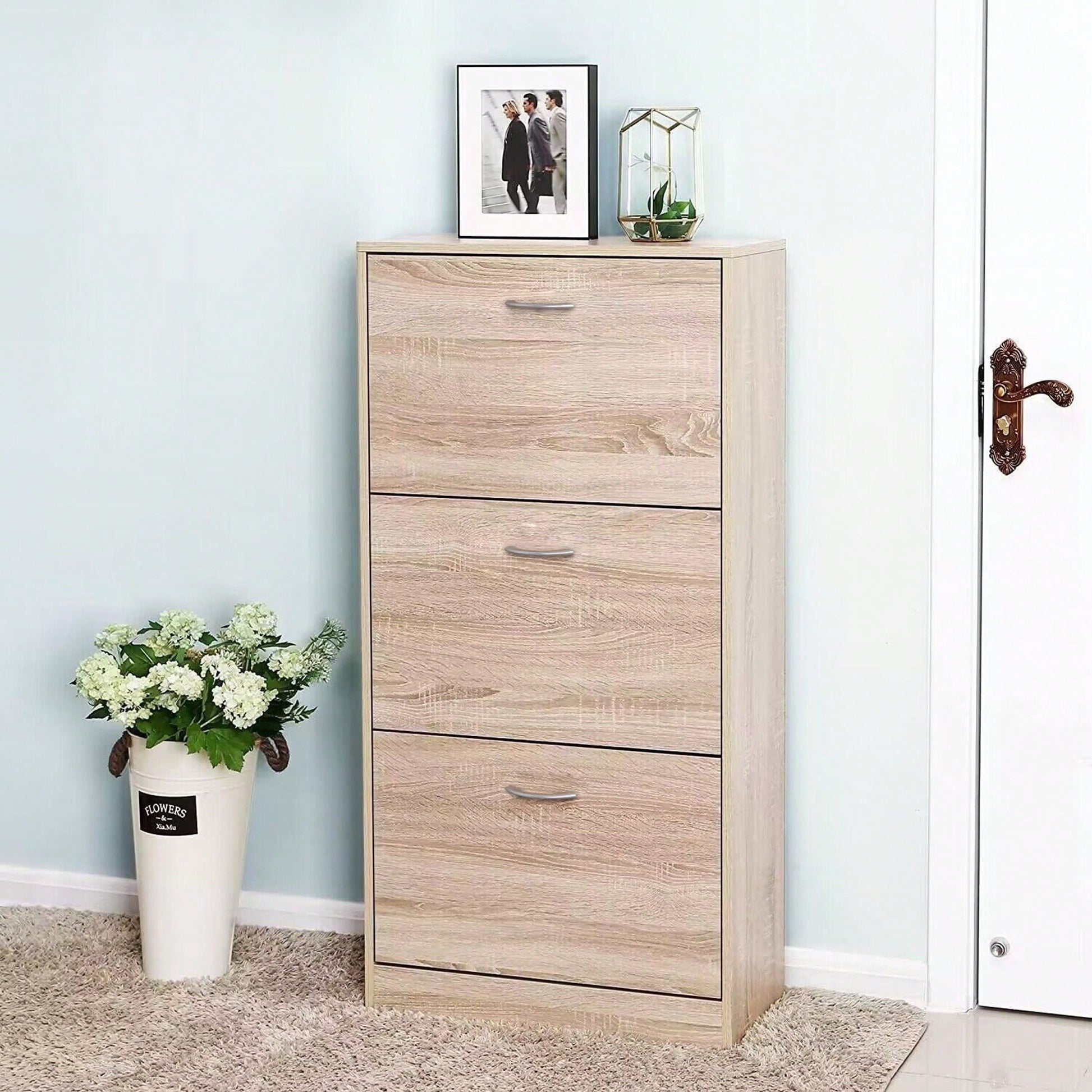 2. Large capacity: This wood shoe cabinet provides sufficient space for shoes, each of the 3 flip down drawers contains 2 layers to store shoes, the cabinet top can be used to store daily essentials, shoe polish, decorative crafts, bags, hats and so on