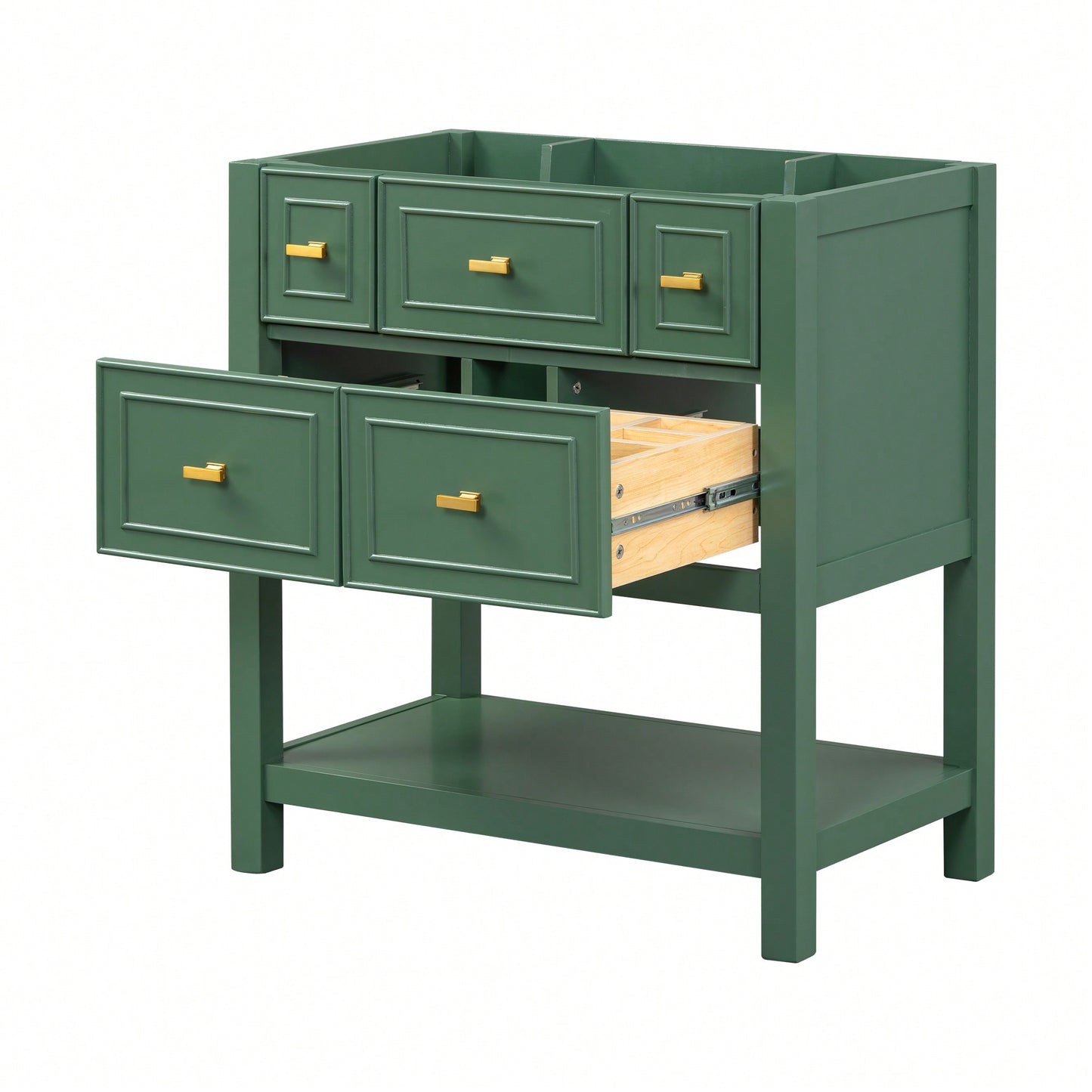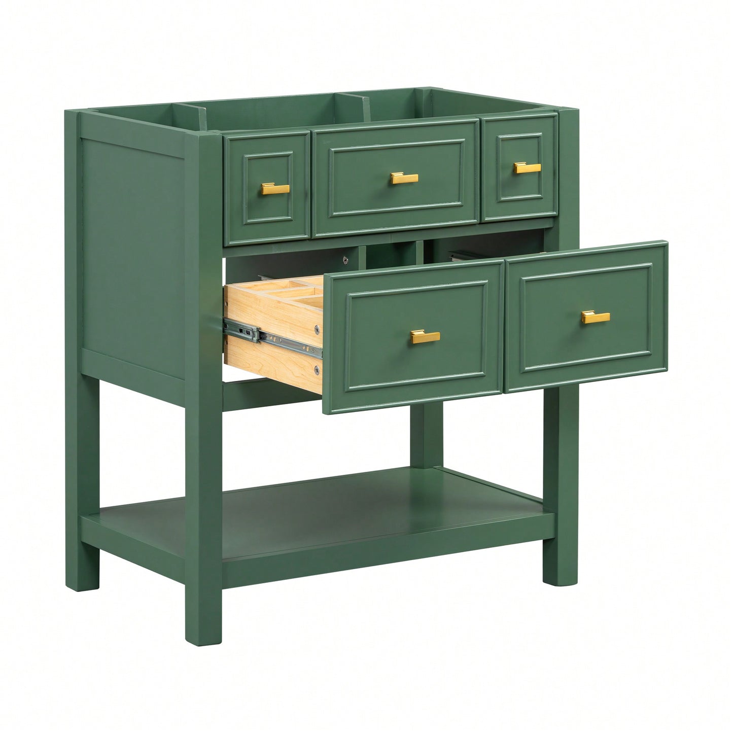 1. Features: - 30-inch bathroom vanity without sink - Modern green and gold design enhances bathroom aesthetics - Features 5 drawers for concealed storage - Made from high-quality MDF boards for durability - Easy assembly with marked parts and included hardware 2. Product Description: This 30-inch free-standing bathroom vanity offers a stylish and functional storage solution for your bathroom. The unique green and gold design provides a sophisticated look that shines under bathroom lighting. Equipped with 5 drawers, this vanity allows for organized storage of your bathroom essentials while effectively blocking dust and water stains when closed. Crafted from high-quality MDF boards, it ensures durability and friendliness, making it an ideal addition to any bathroom. Assembly is straightforward, with all parts marked and hardware included for your convenience. Specifications: - Dimensions: 30 inches - Material: High-quality MDF boards - Number of Drawers: 5 - Assembly: Easy with marked parts and instructions