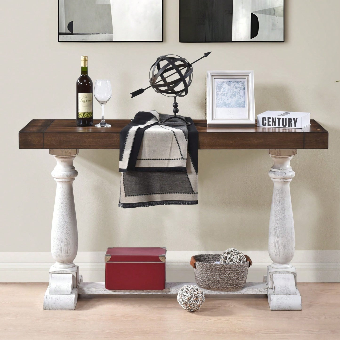 This pedestal table combines elegant farmhouse design with rustic charm, making it a perfect addition to any living room, dining area, or kitchen space. Crafted from weathered wood, it features a distressed white base paired with an antique dark oak wood-finish tabletop. The wide surface offers ample space for decor items or everyday essentials, while the two turned pedestal legs provide stability and a classic look. With durable construction, this table ensures long-lasting use and adds warmth and character to your home.
