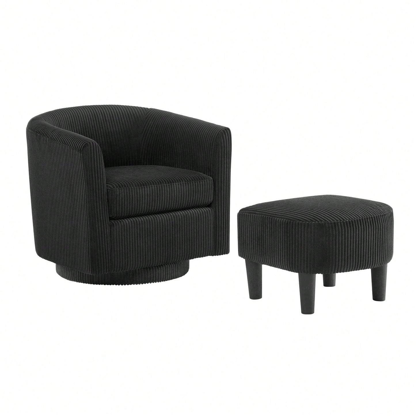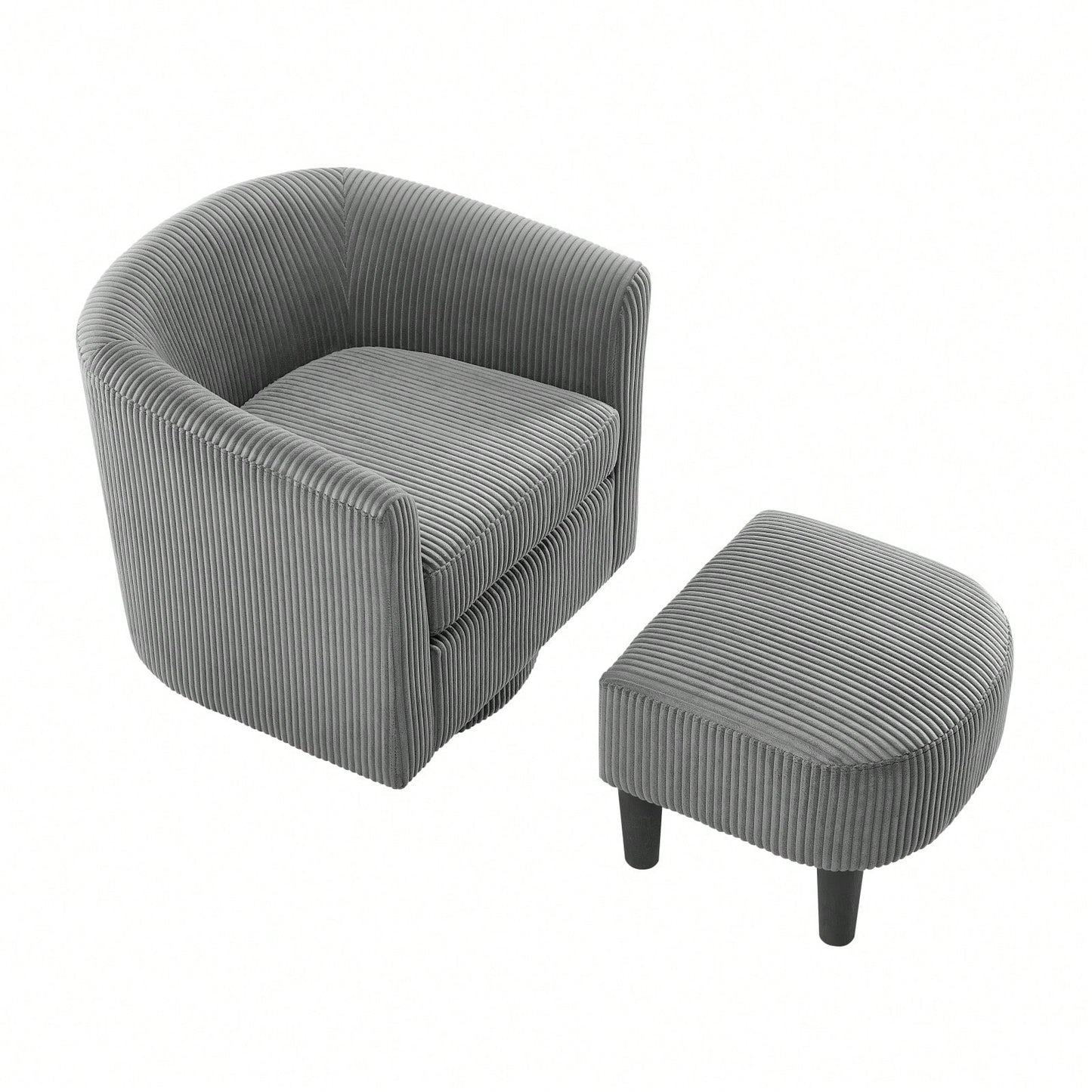 Accent swivel chair designed for living rooms, bedrooms, or studies for moments of relaxation and rest. Made with skin-friendly corduroy fabric and sturdy rubber wood plywood frame. Features a modern design with a mid-height backrest and an extra ottoman for added comfort. The base of the chair matches the color of the chair for a fashionable look. Carefully crafted with curved armrests, well-sewn finish, and protective foot pads.
