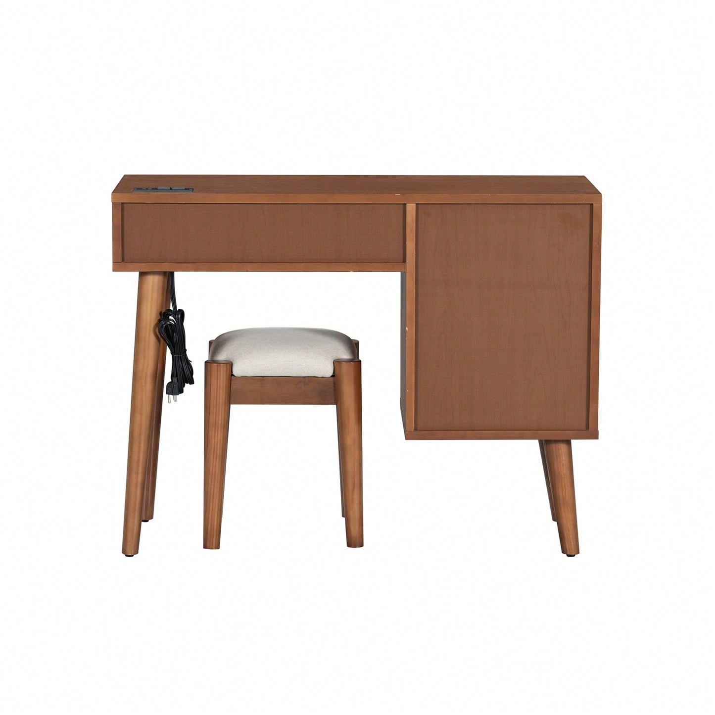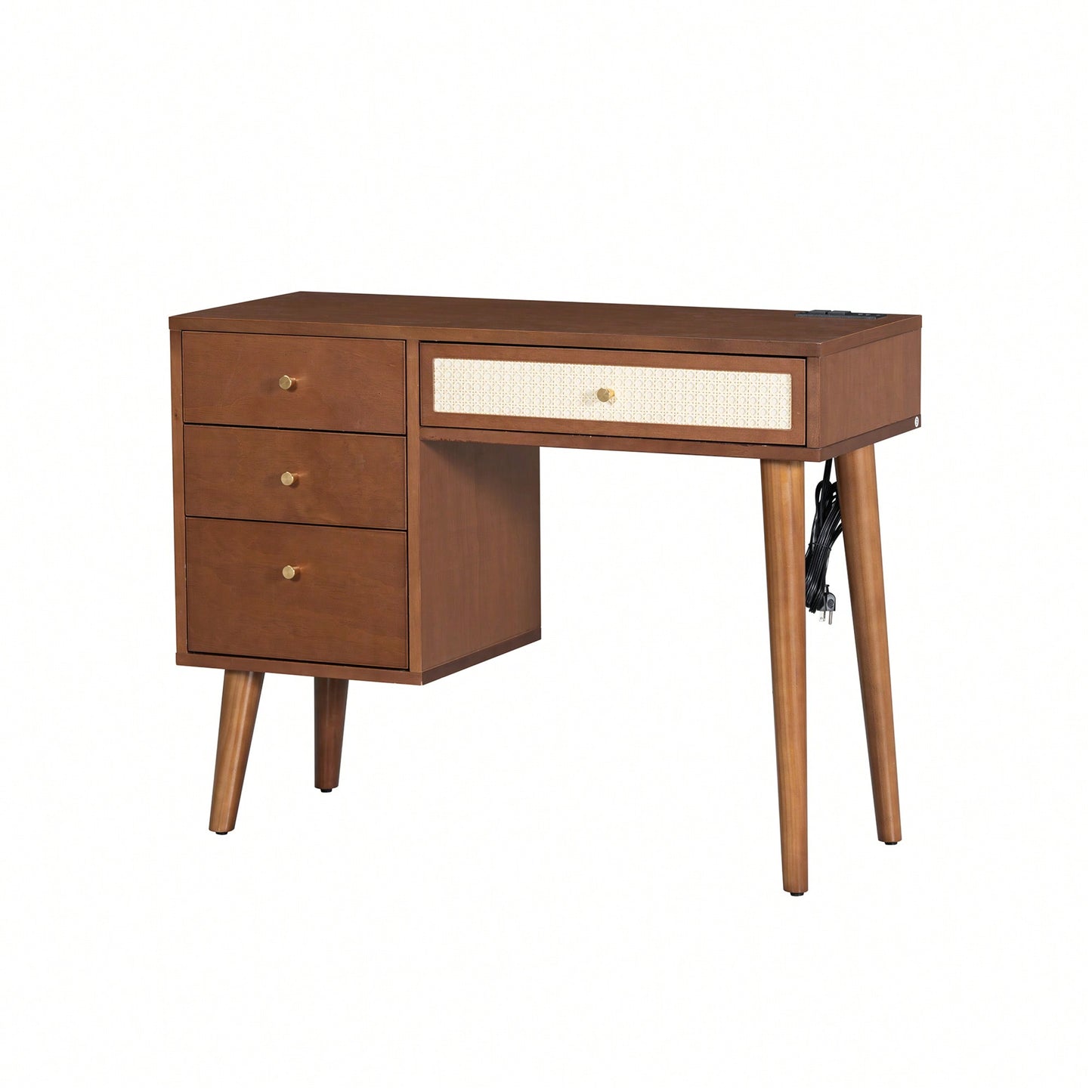 39 Inch Retro Bohemian Wooden Makeup Vanity Set With Charging Plug USB Port And Stool 3 Storage Drawers And Rattan Drawer Walnut Finish