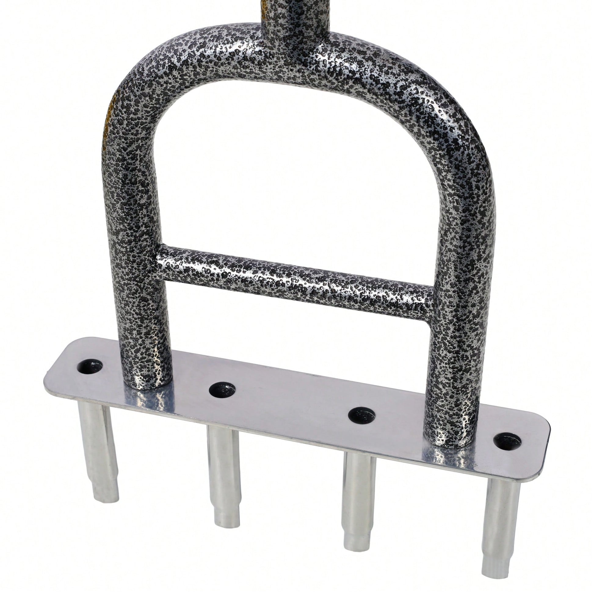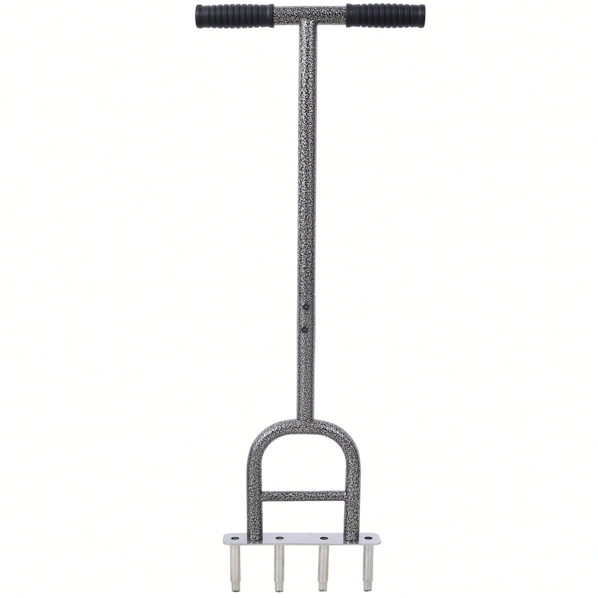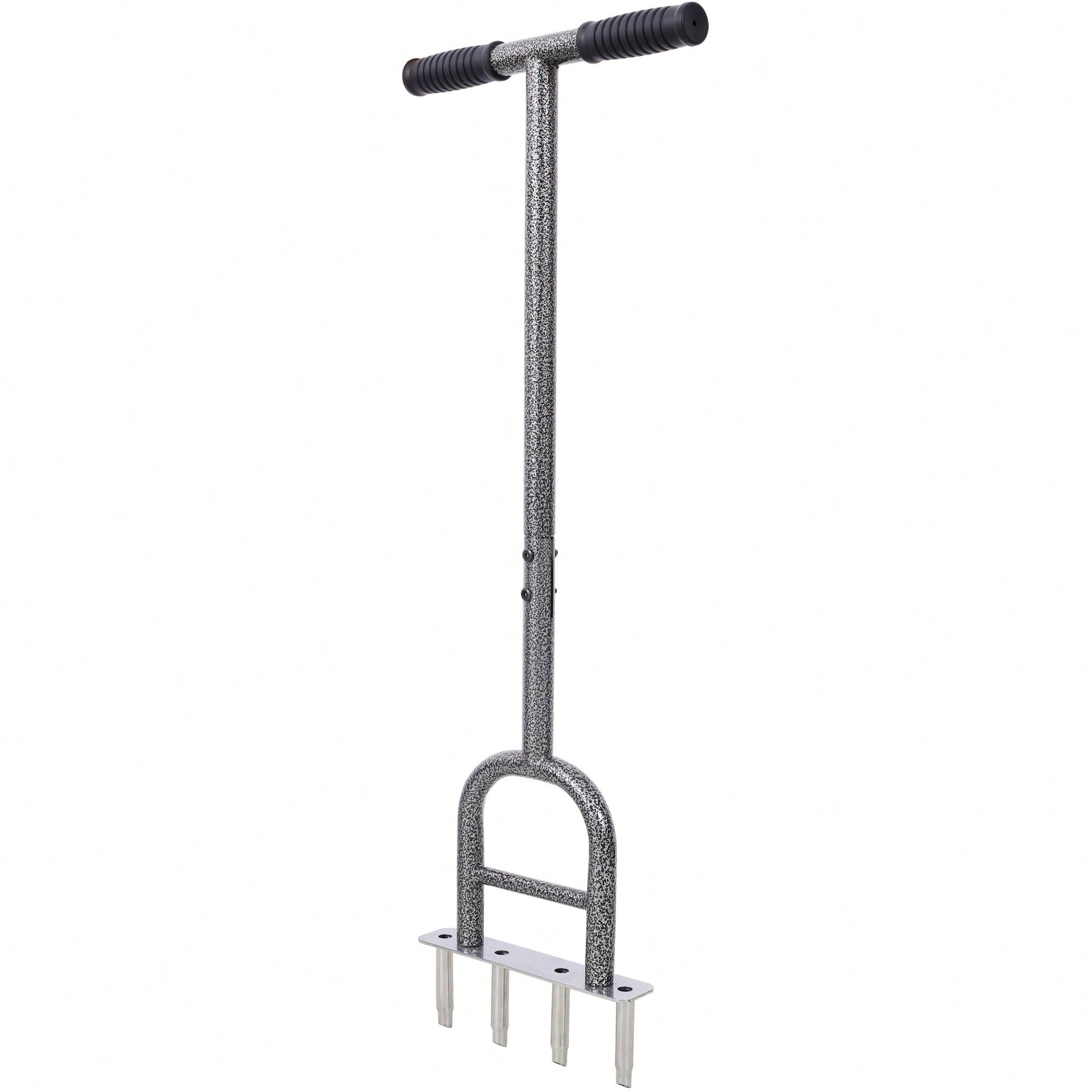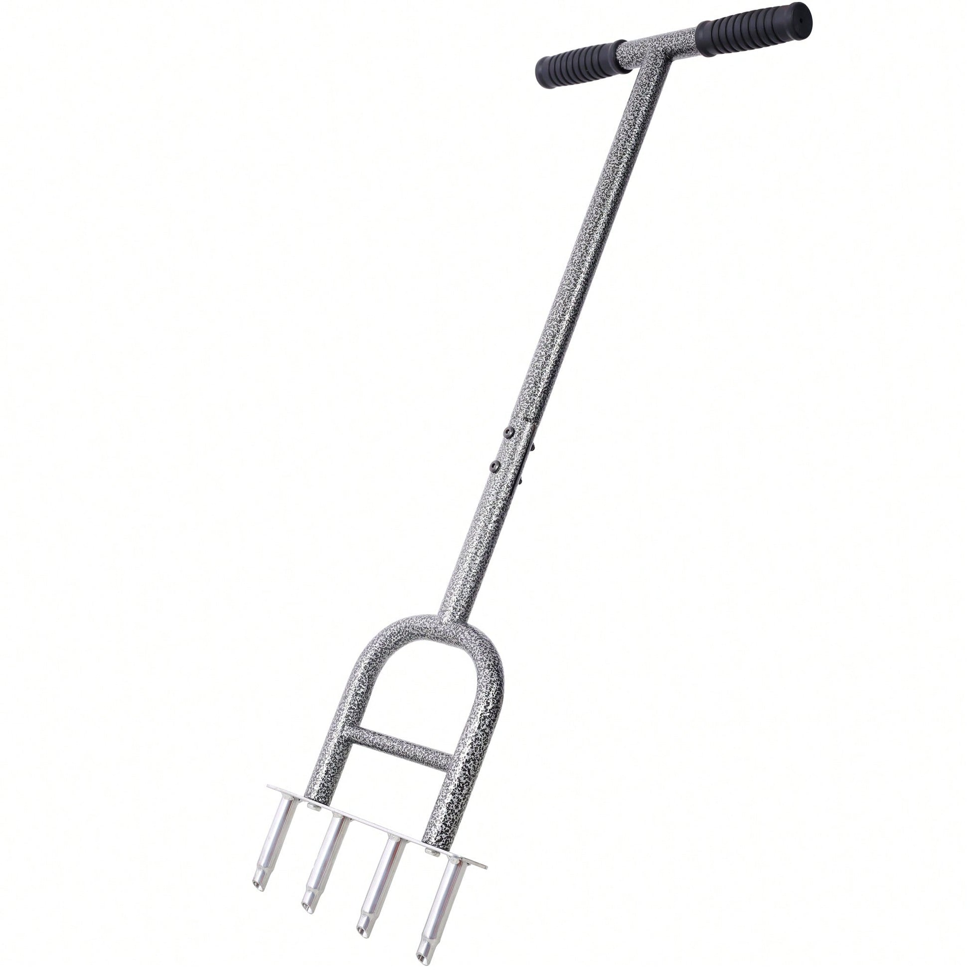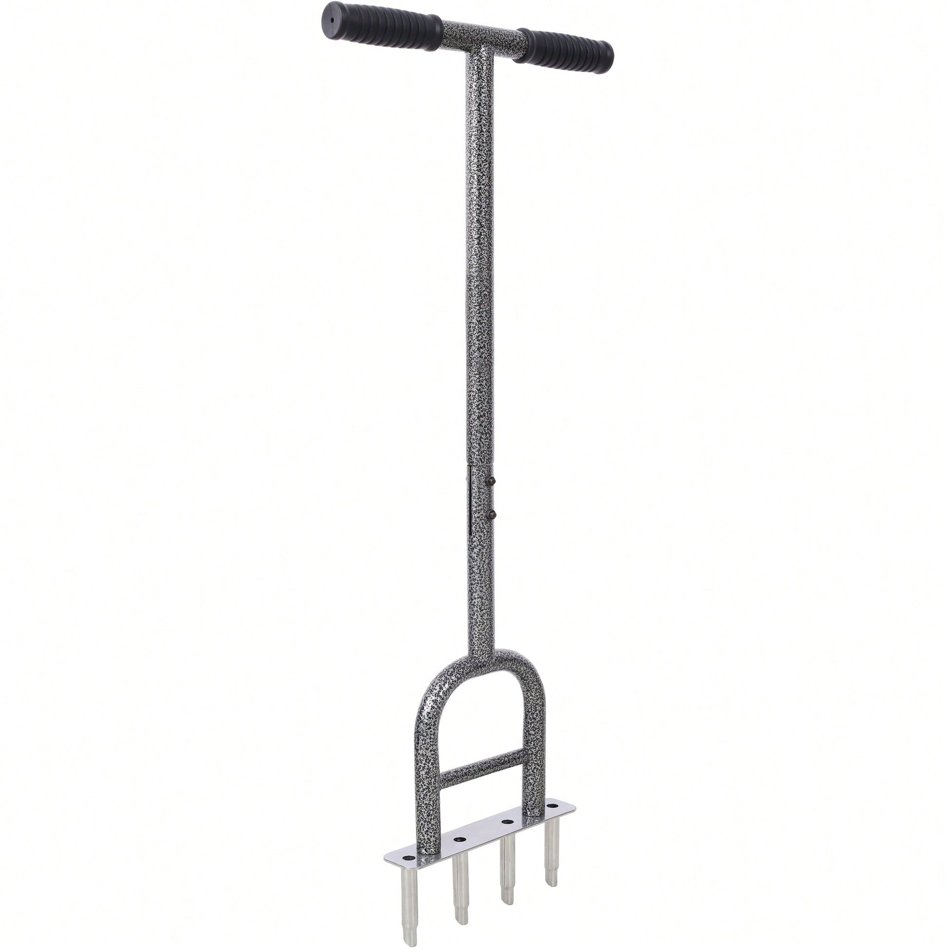 **Key Features** - Durable all-steel frame with black powder-coated finish for enhanced durability - Corrosion-resistant corer plug for long-lasting performance - Ergonomic design with soft rubber grip to reduce hand fatigue - Foot bar for easy pressing and smooth core ejection - Includes a versatile 12" weeder tool for various gardening tasks **Product Description** This lawn coring aerator is designed to improve soil and lawn health by loosening compacted soil. With a sturdy construction, it features a durable all-steel frame and a corrosion-resistant corer plug for reliable performance over time. The ergonomic design includes a soft rubber grip to minimize hand fatigue, while the foot bar allows for easy pressing, ensuring smooth core ejection. The aerator effectively creates deep, narrow soil plugs, promoting air, water, and nutrient penetration to support stronger grass growth and reduce soil erosion. Additionally, a 12" hand tool is included for cleaning, transplanting seedlings, or weeding, making it a versatile addition to any gardening toolkit. **Specifications** - Corer plug length: 3.8 inches - Corer plug diameter: 0.5 inches - Total number of corer plugs: 4