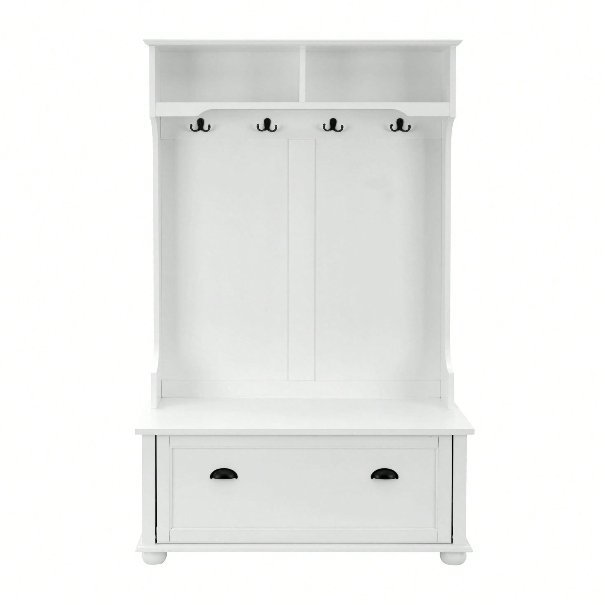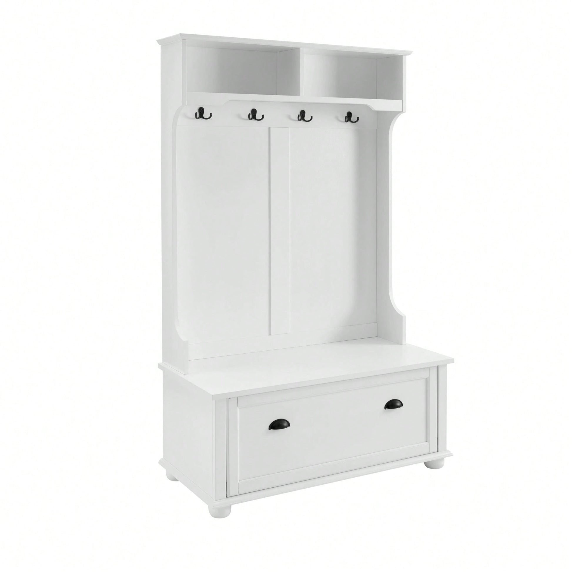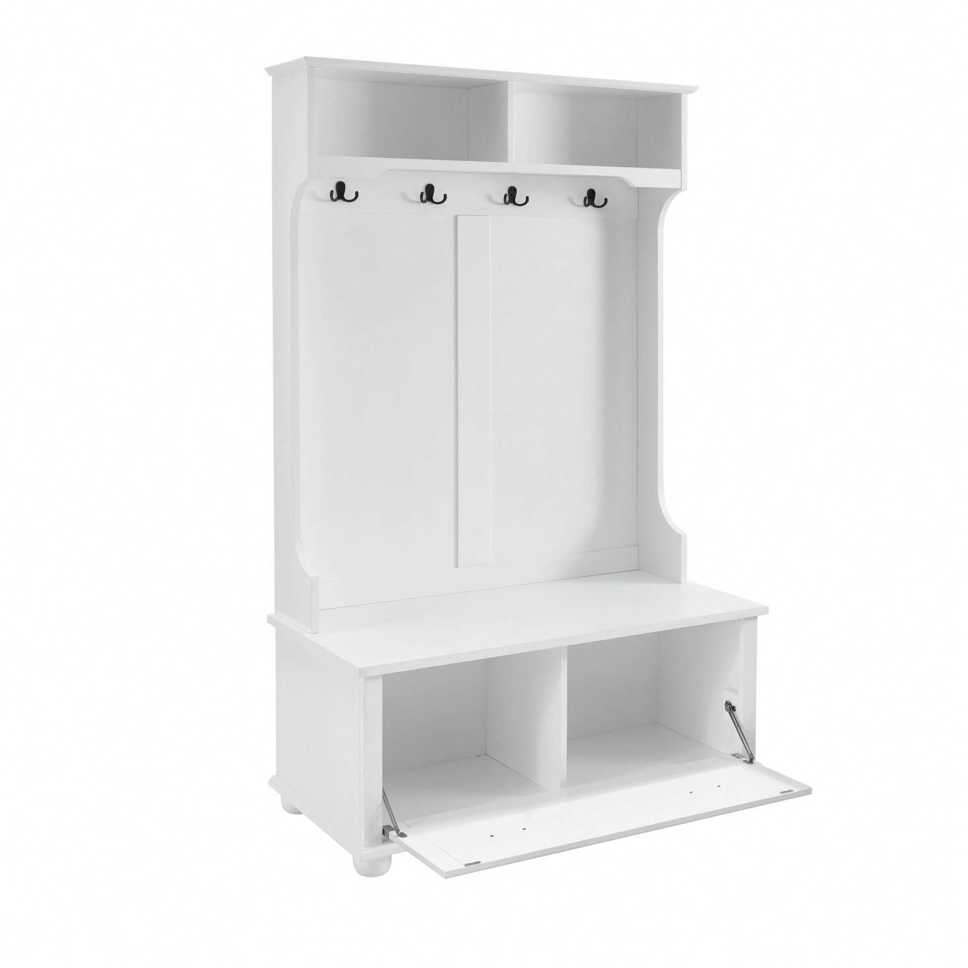 1. Practical 4-in-1 design, this hall tree offers shoe bench, large storage compartment, coat rack, and open shelves.
