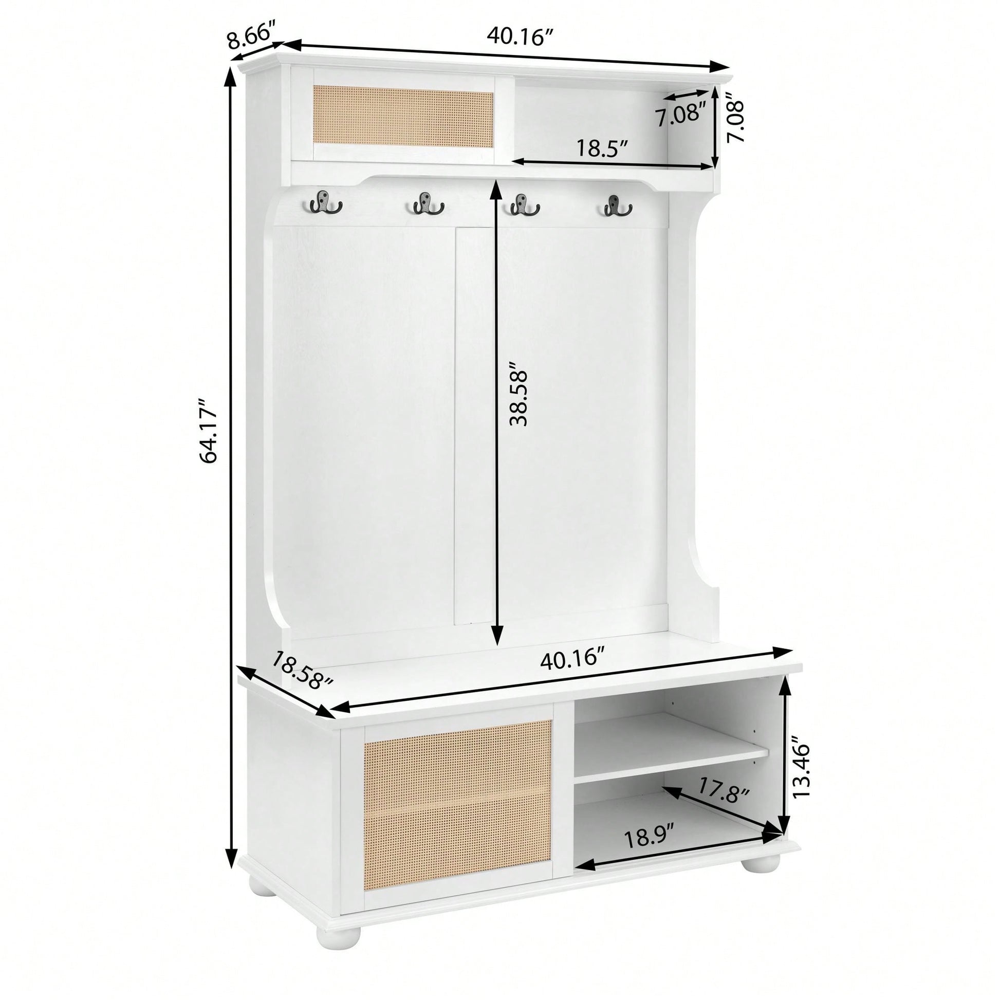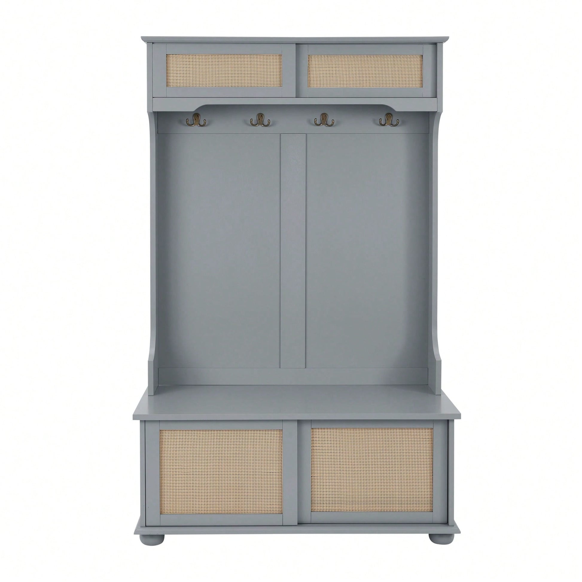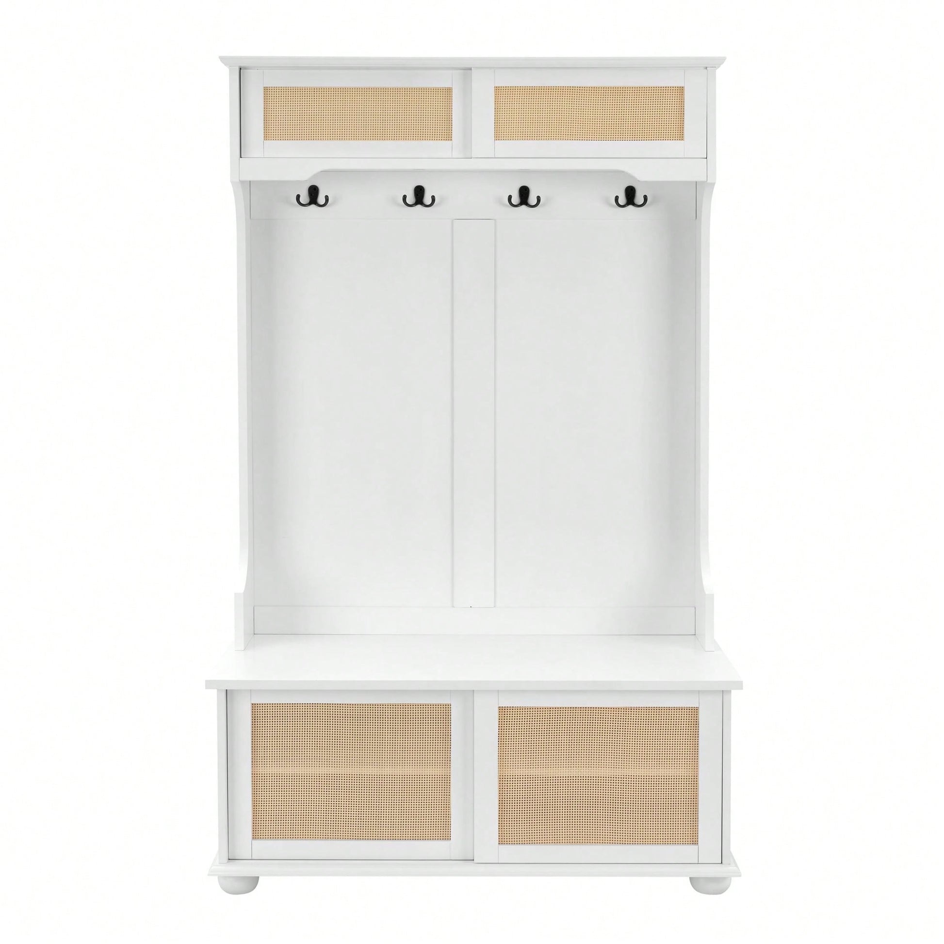 4-In-1 Hall Tree Entryway Bench With Rattan Door Shelves And Shoe Cabinets, SOLID WOOD Feet