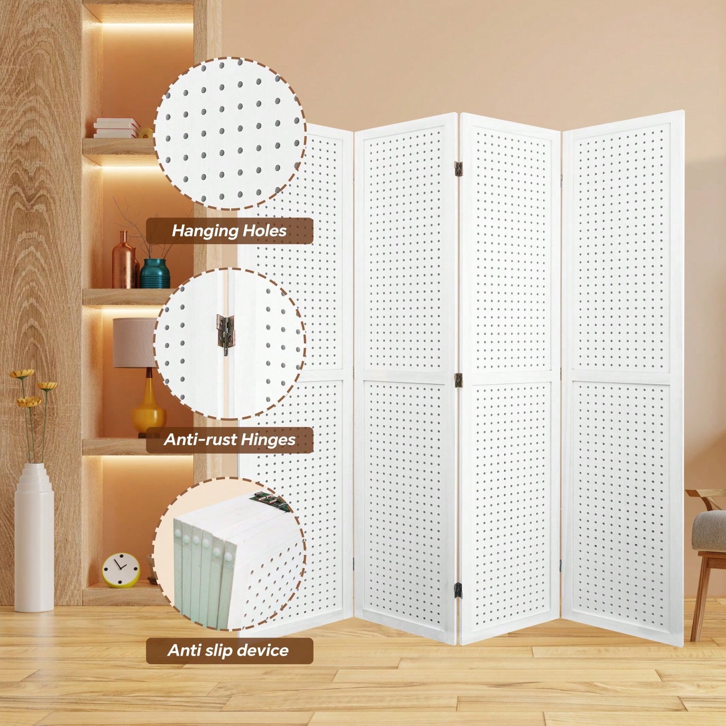 4 Panel Wooden Pegboard Room Divider 5.6ft Folding Privacy Screen Freestanding Display for Trade Shows and Home Organization
