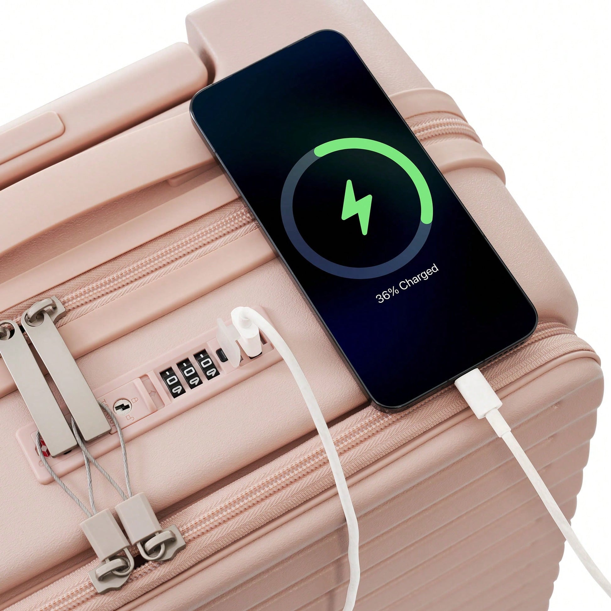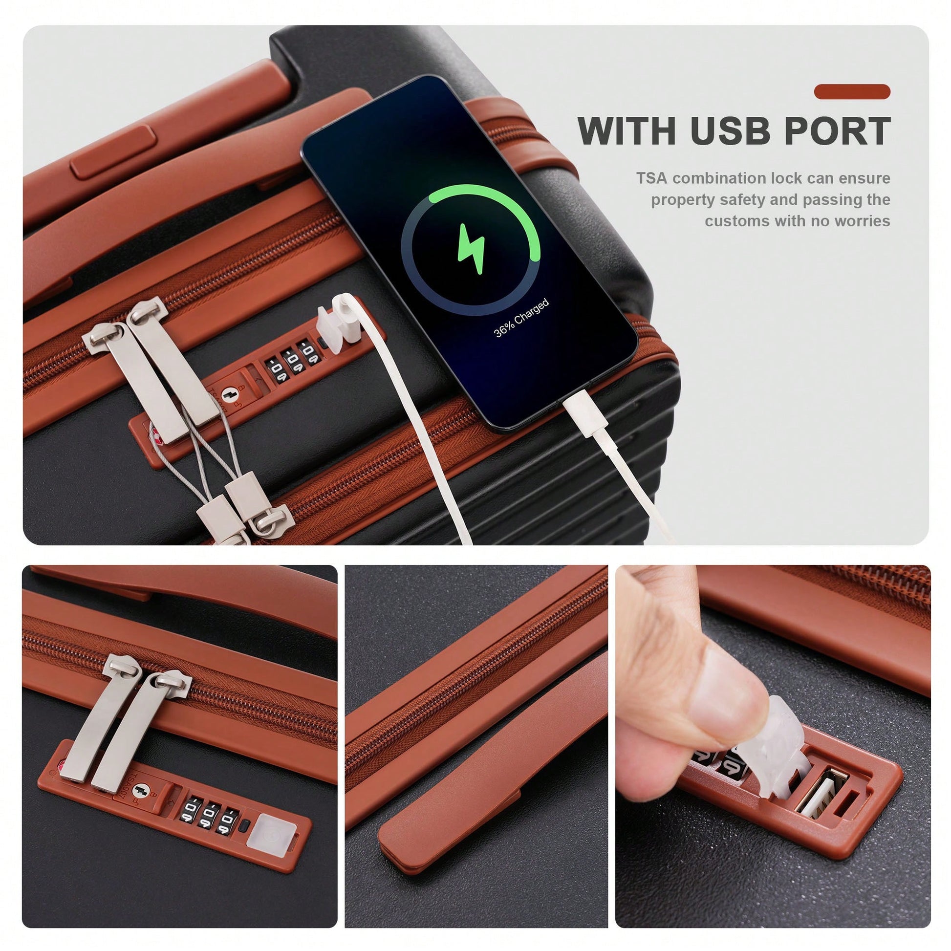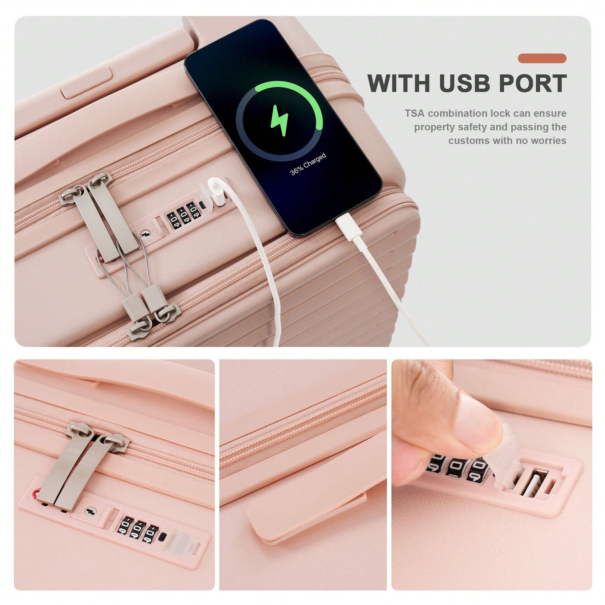 4 Piece Hard Shell Luggage Set With Front Pocket TSA Lock USB Port Universal Wheels Black Carry-On Bags 20 24 28 Inch