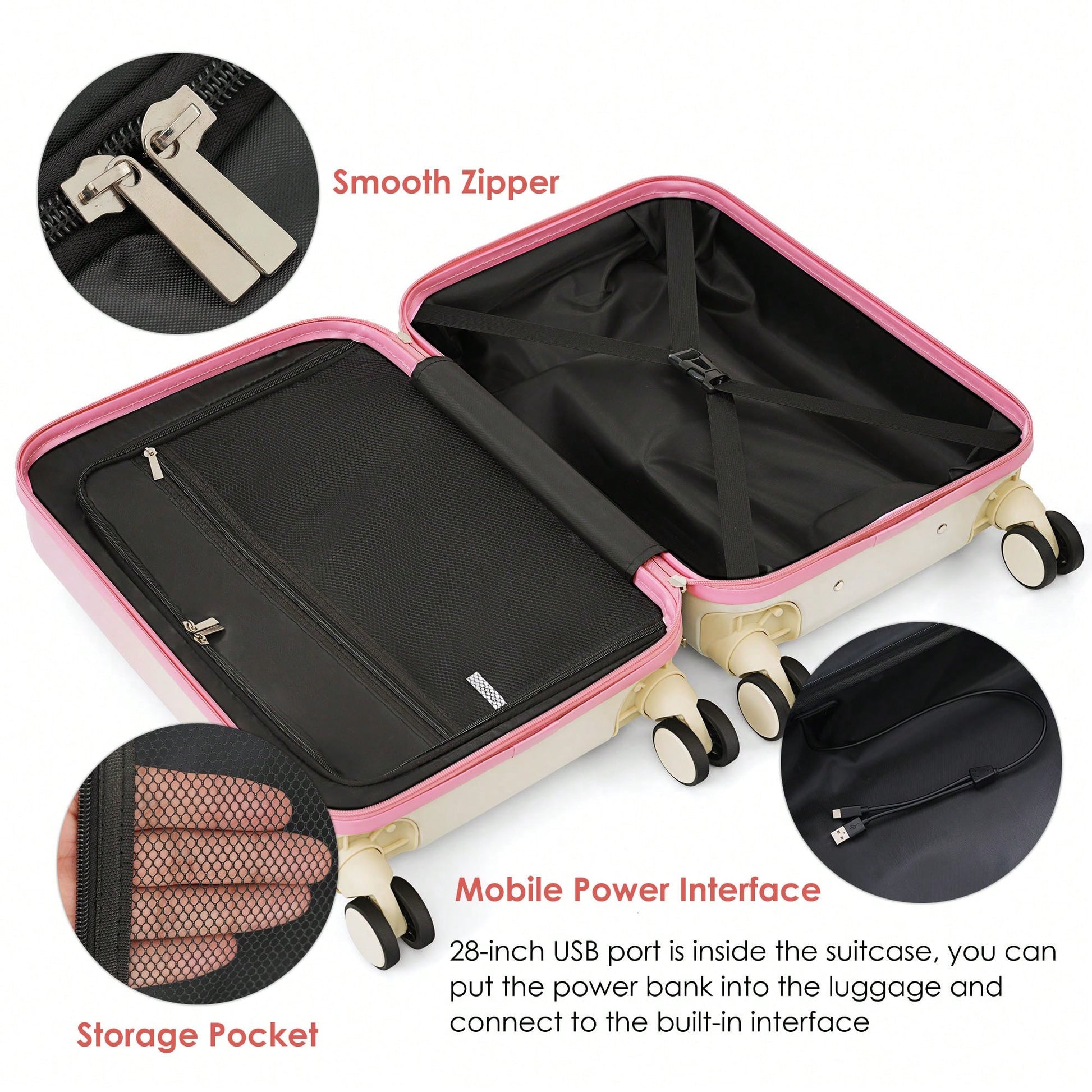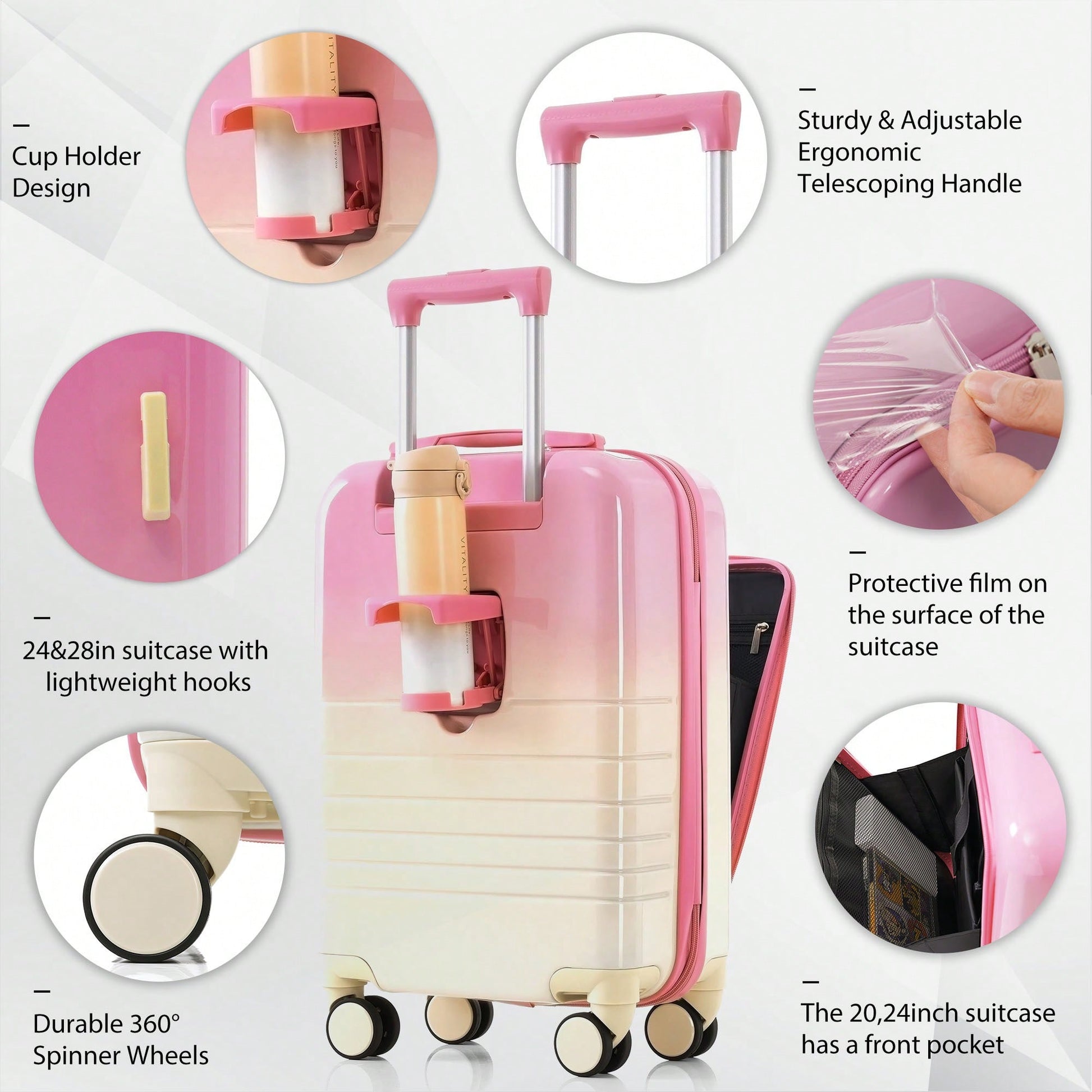 Experience effortless travel with this luggage set designed for the modern traveler. The 3-piece set includes 20, 24, and 28-inch suitcases, each featuring a front opening design that allows for easy access to your belongings. Navigate crowded airports and busy streets with ease, thanks to the smooth 360-degree rotating wheels. Stay connected while on the move with built-in USB ports for charging your devices. Thoughtful organization features, such as a hook for hanging bags and a cup holder, enhance your travel experience. Crafted from durable ABS+PC material, this luggage set ensures your belongings are well-protected. Additionally, the expandable weekender travel bag made of mild water-repellent polyester fabric offers multiple pockets for organized packing.