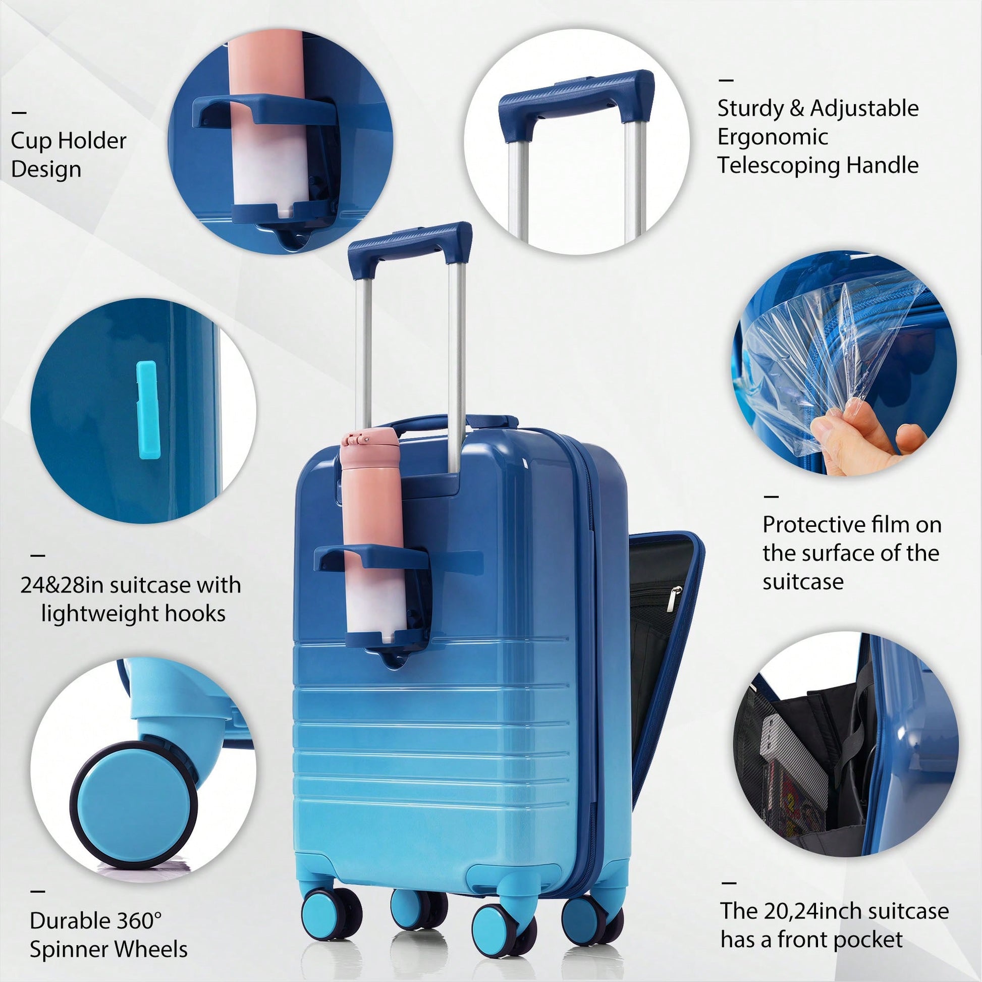 4-Piece Expandable Hard Shell Luggage Set with USB Port Front Opening Airline Approved Carry-On and Cup Holder in Blue
