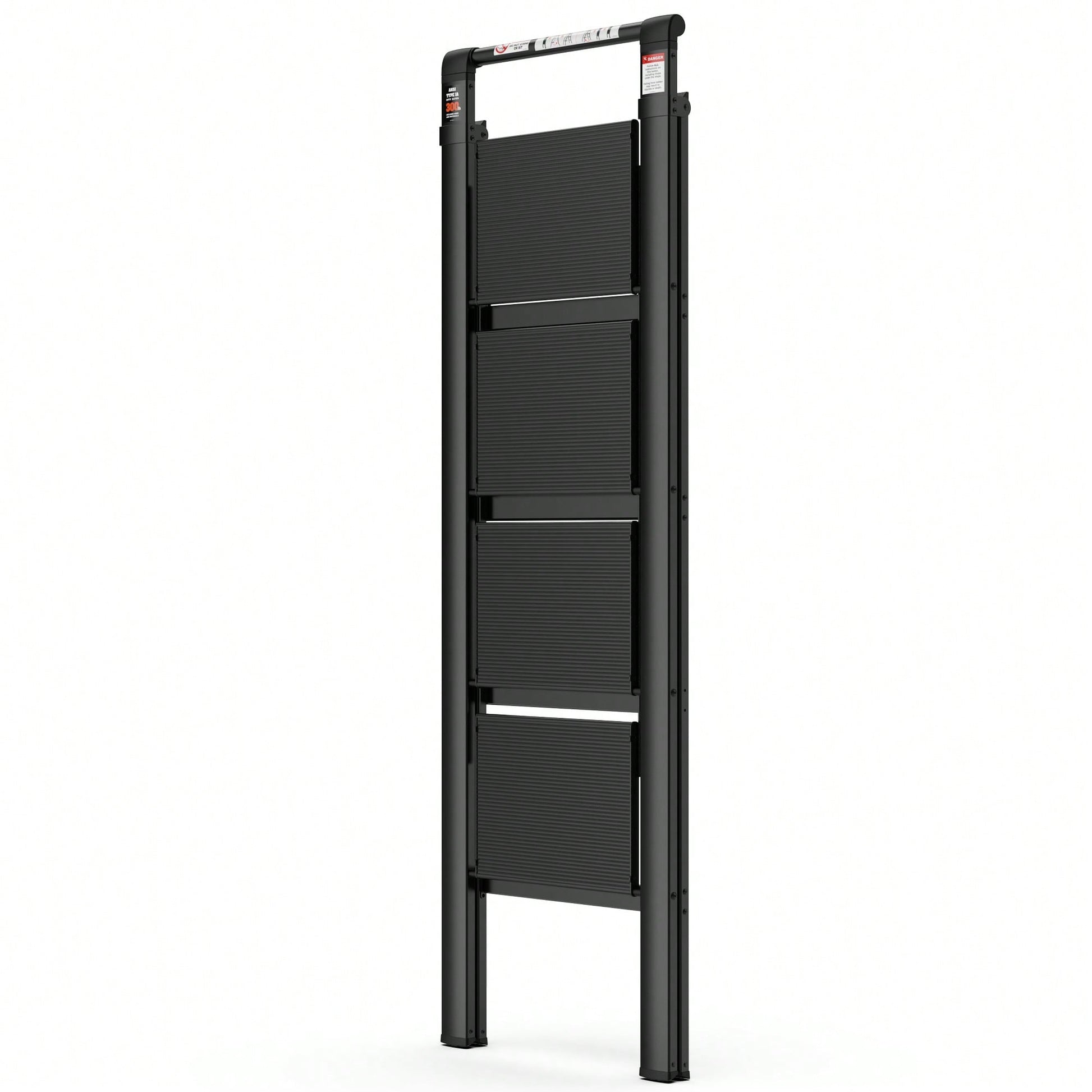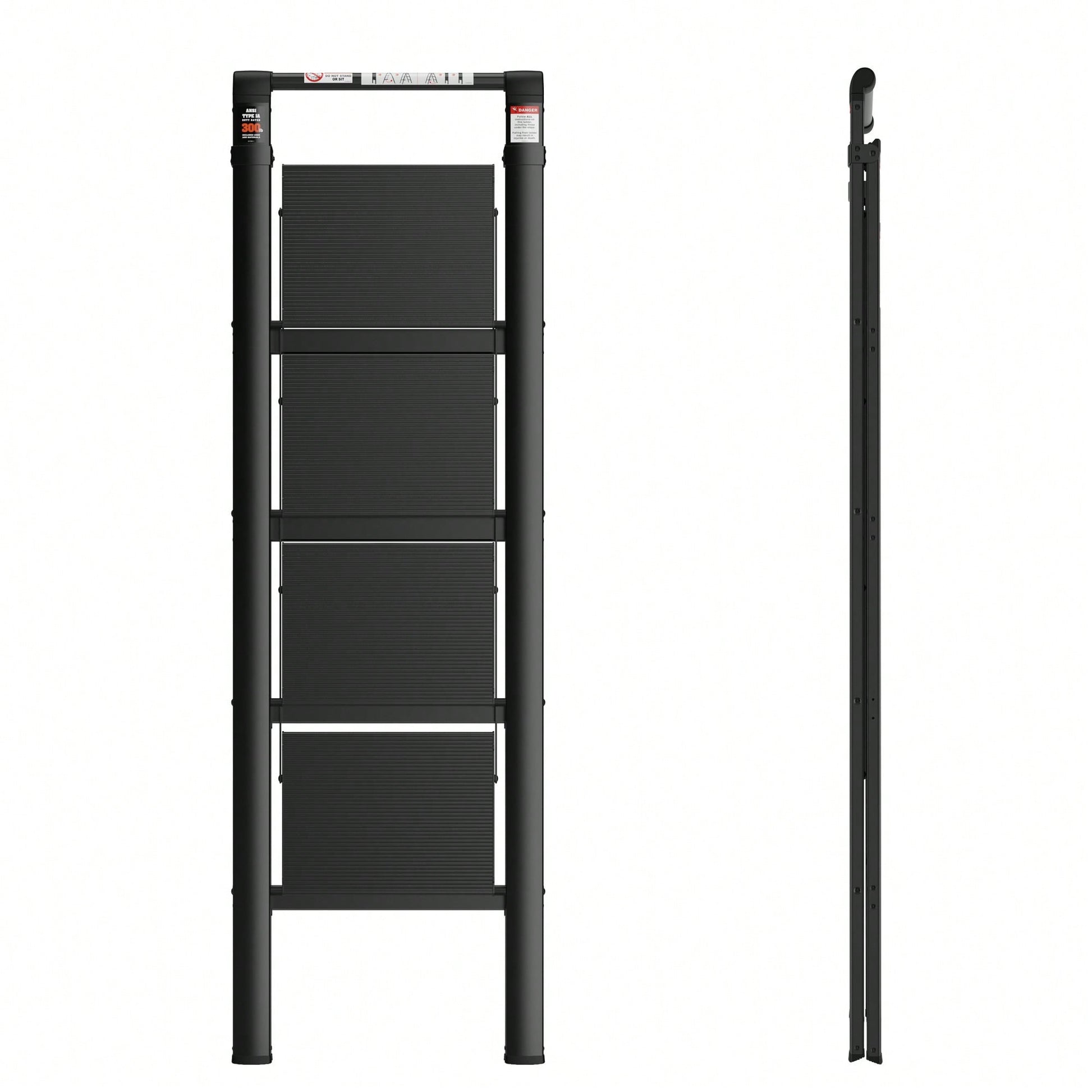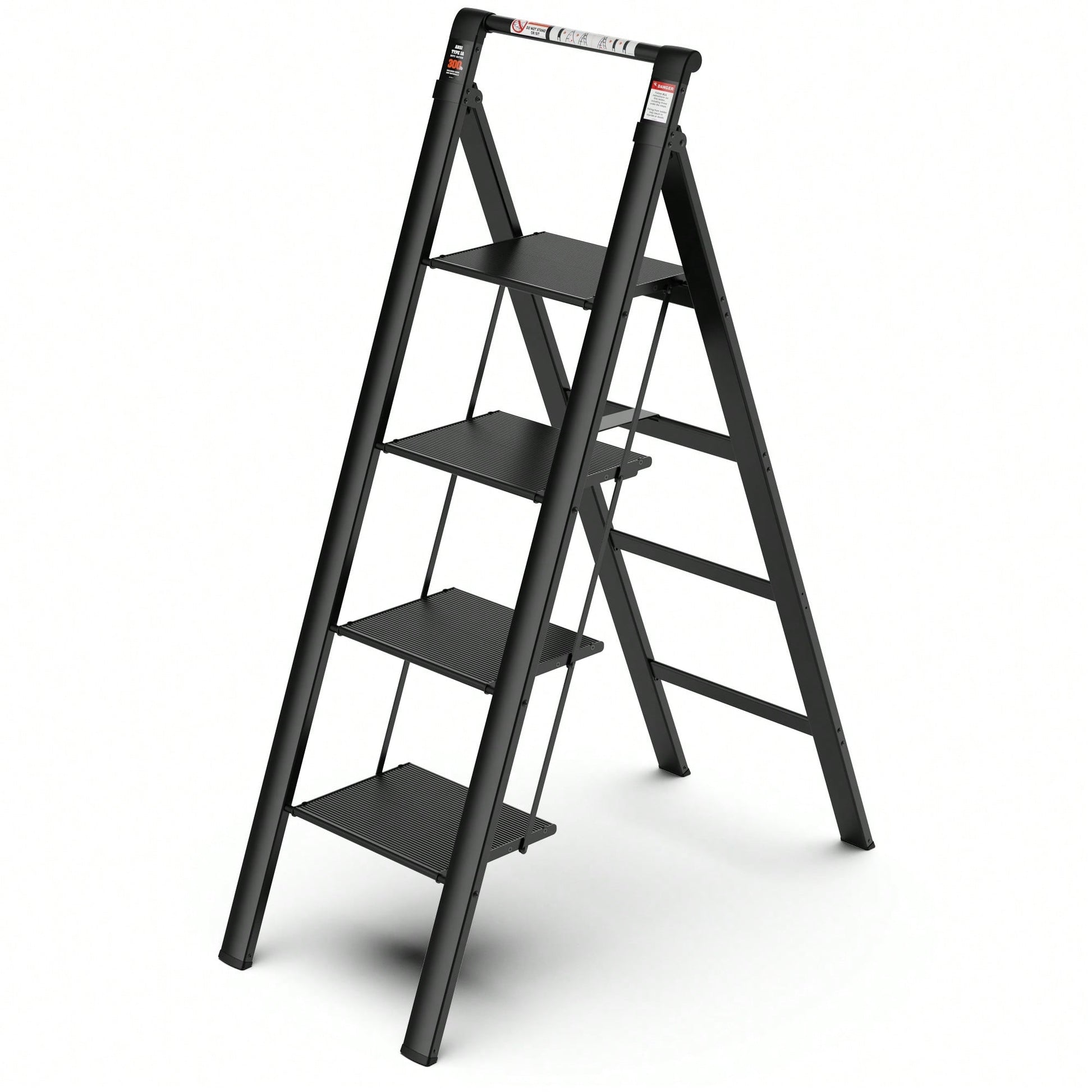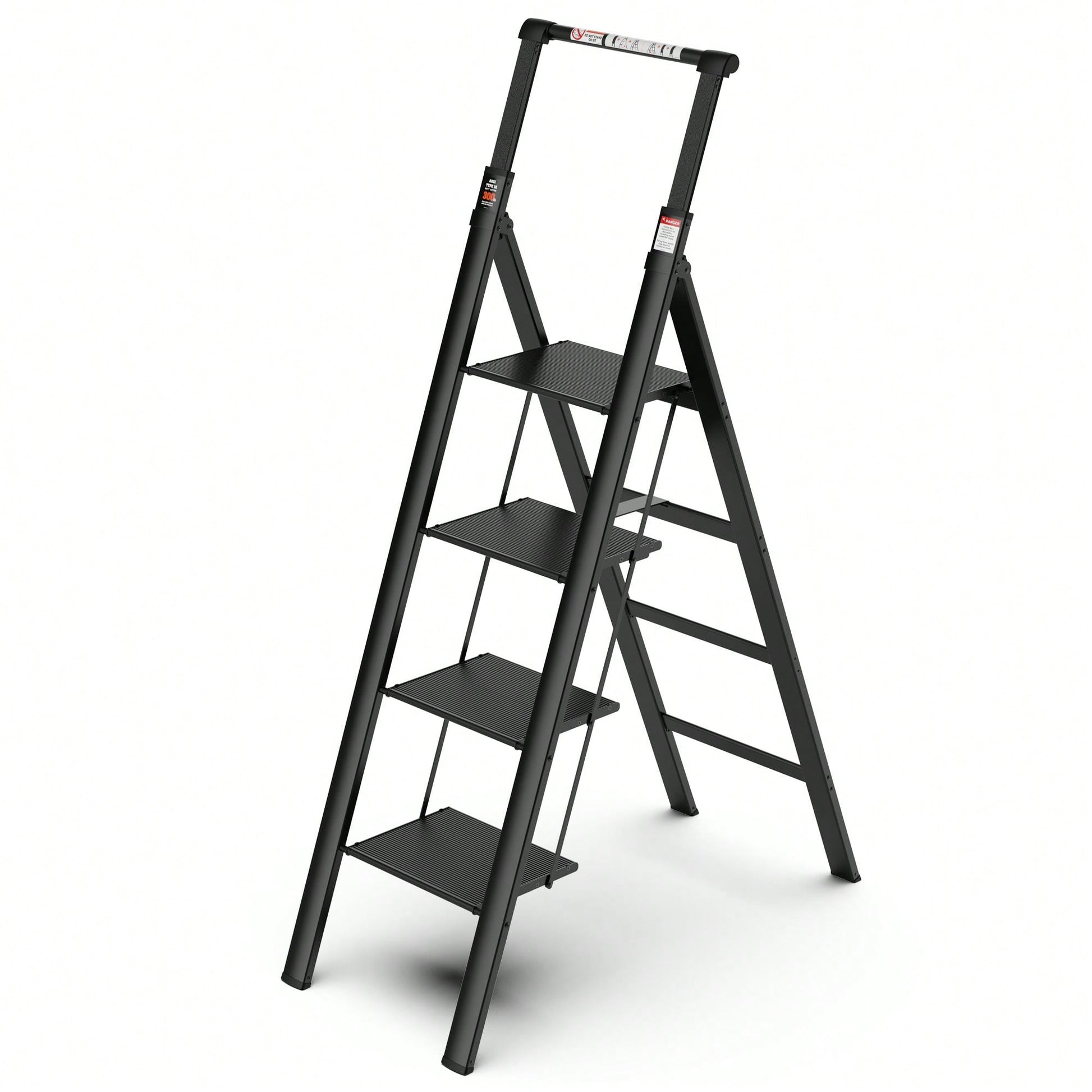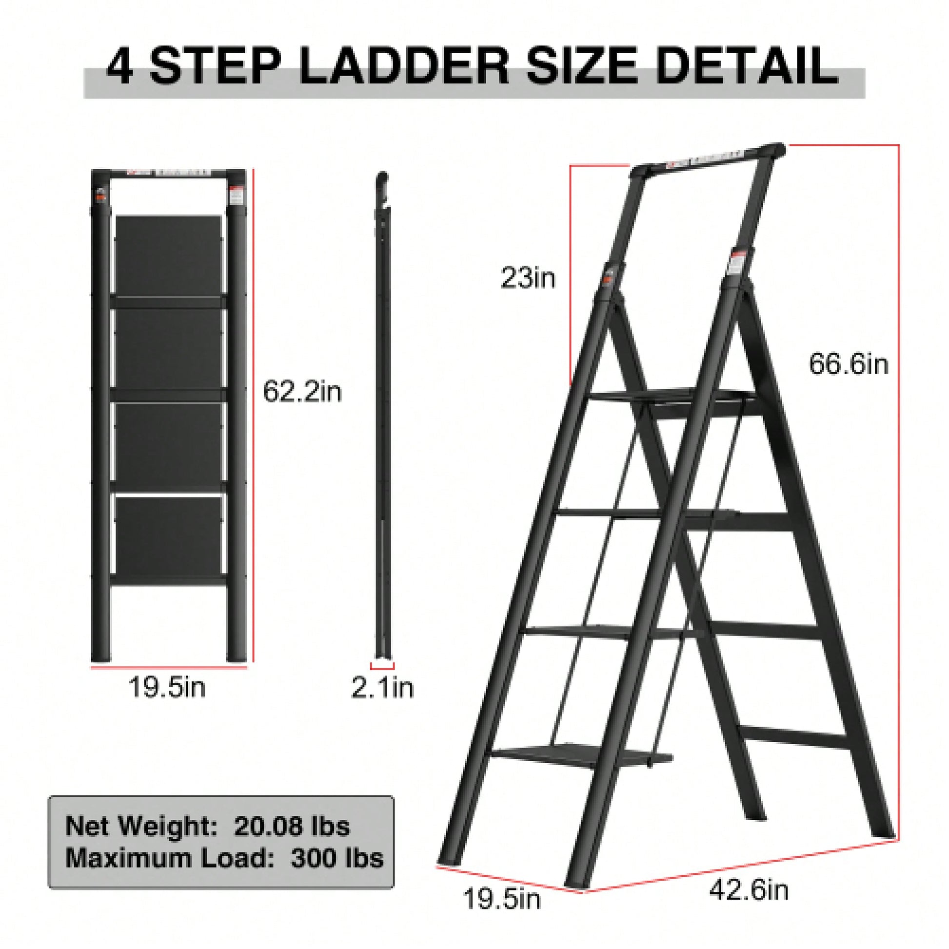 4-Step Folding Ladder With Retractable Handgrip And Anti-Slip Wide Pedal – Durable Aluminum Design, Supports 300lbs For Safe Household Use