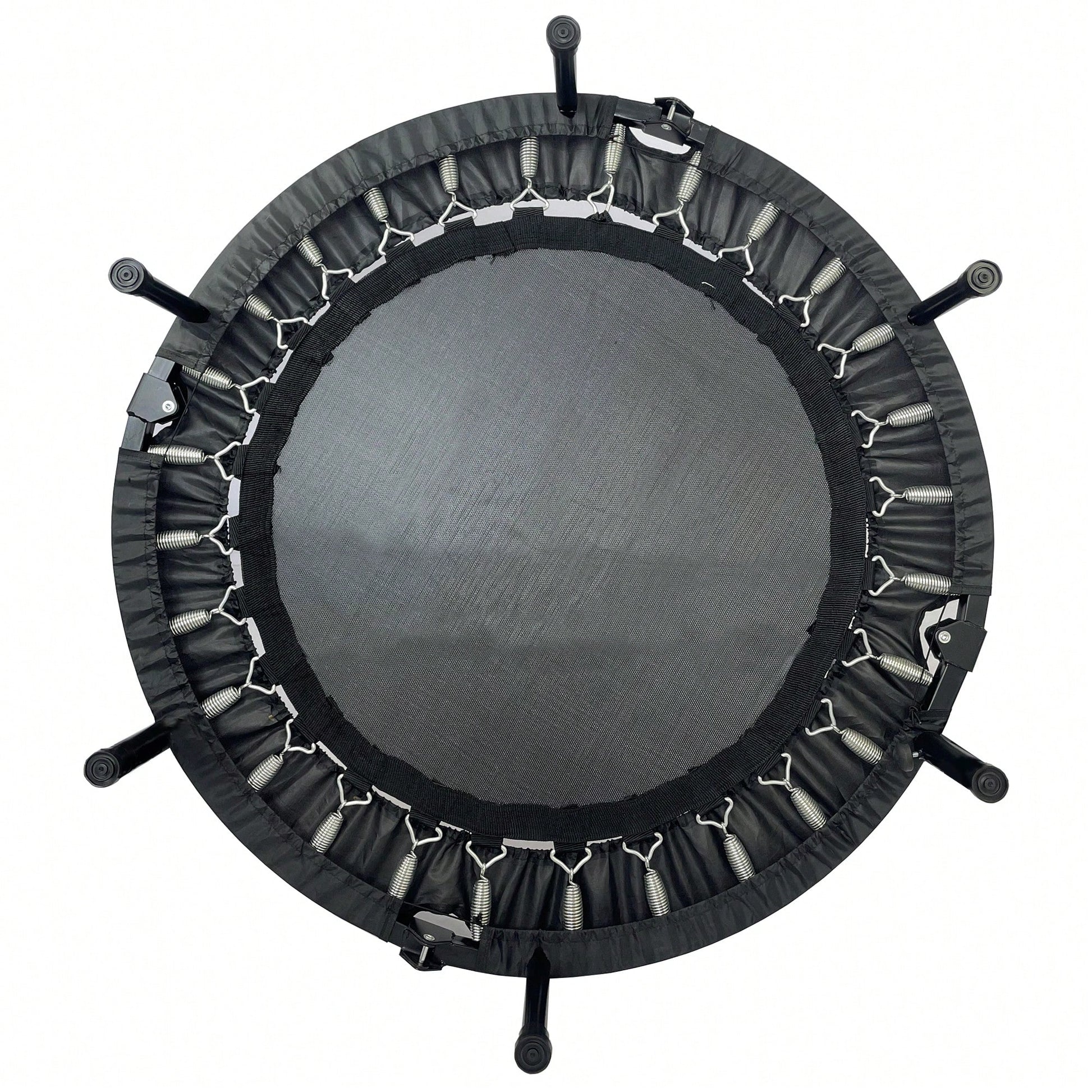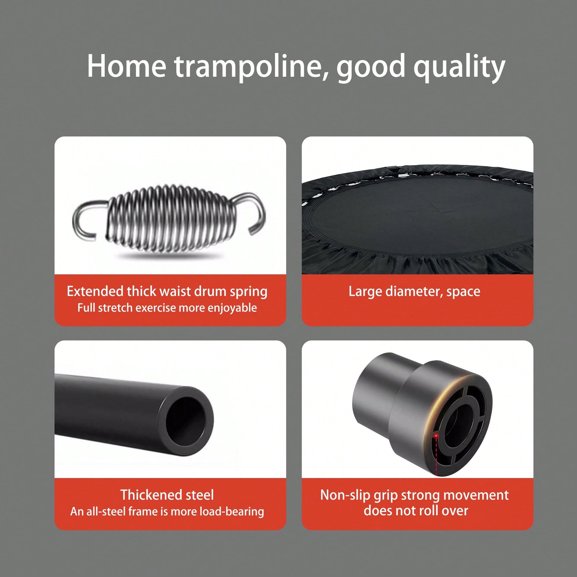 This mini exercise trampoline is ideal for both adults and kids looking to incorporate fun and fitness into their routines. With the ability to burn calories effectively, this trampoline is perfect for home use, fitness, and outdoor activities. It features an adjustable foam handle for support during workouts and is built with heavy-duty steel legs that come with anti-slip rubber sleeves for stability.
