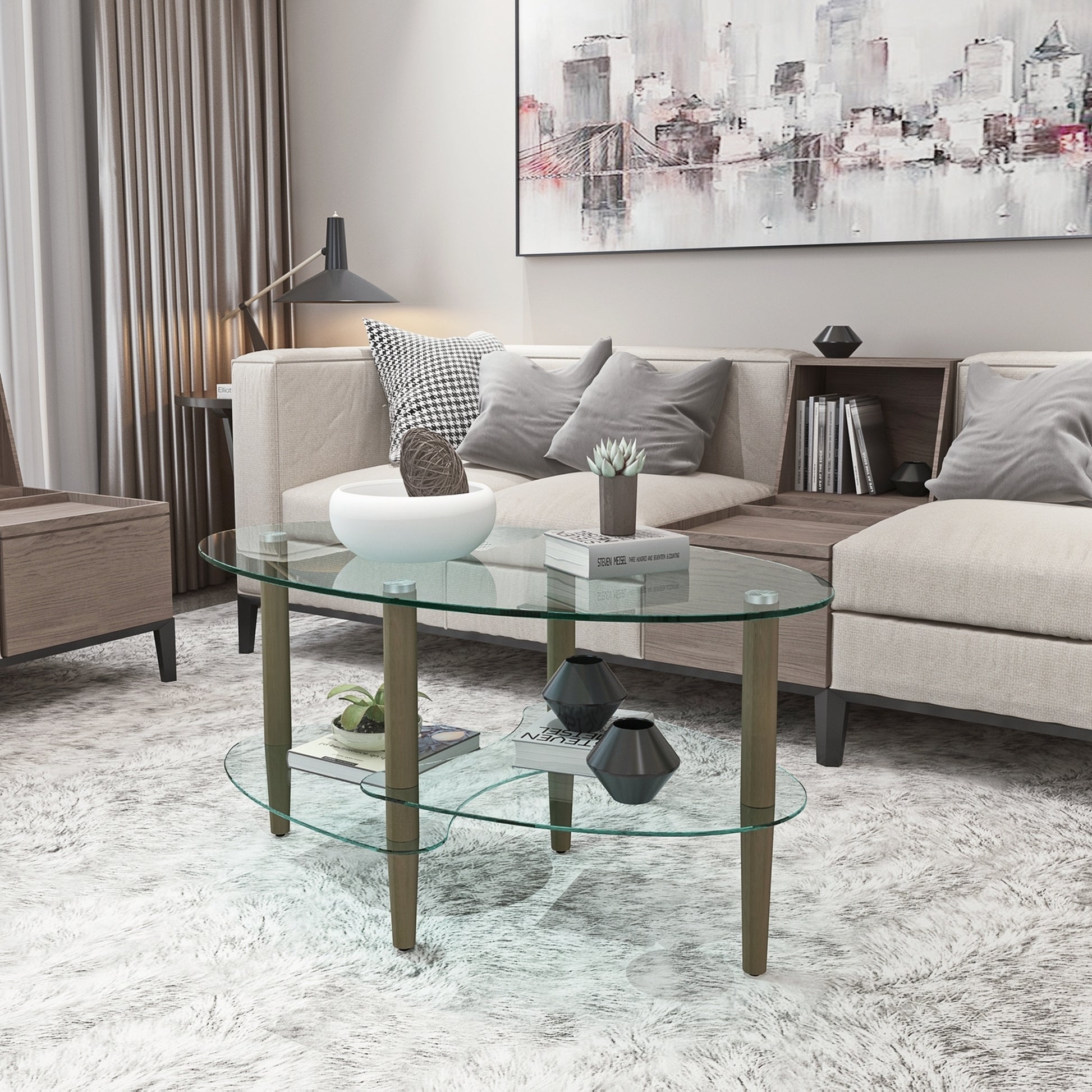 Transparent Oval Glass Coffee Table Modern Design Oak Wood Legs 3-Layer Living Room Tea Table
