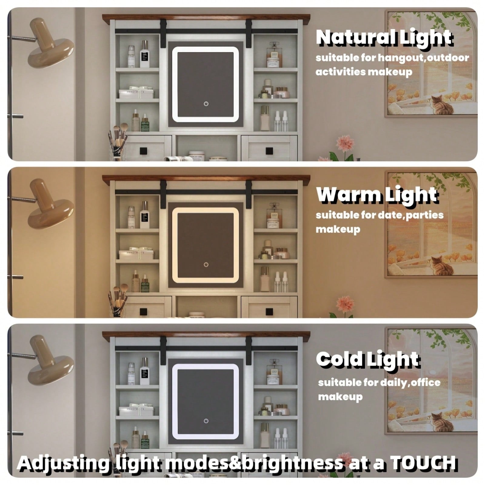 3.Adjustable touch screen mirror with three color modes (cool white, warm white, warm yellow) for perfect lighting to enhance your makeup application