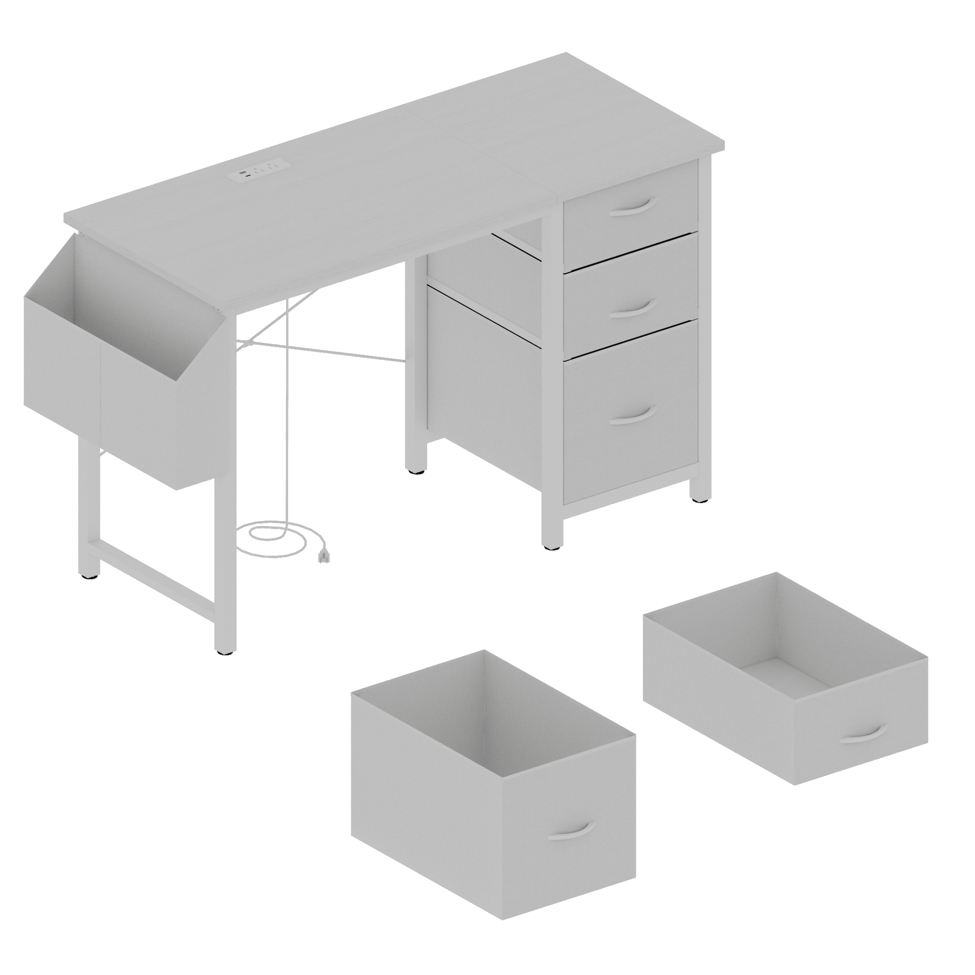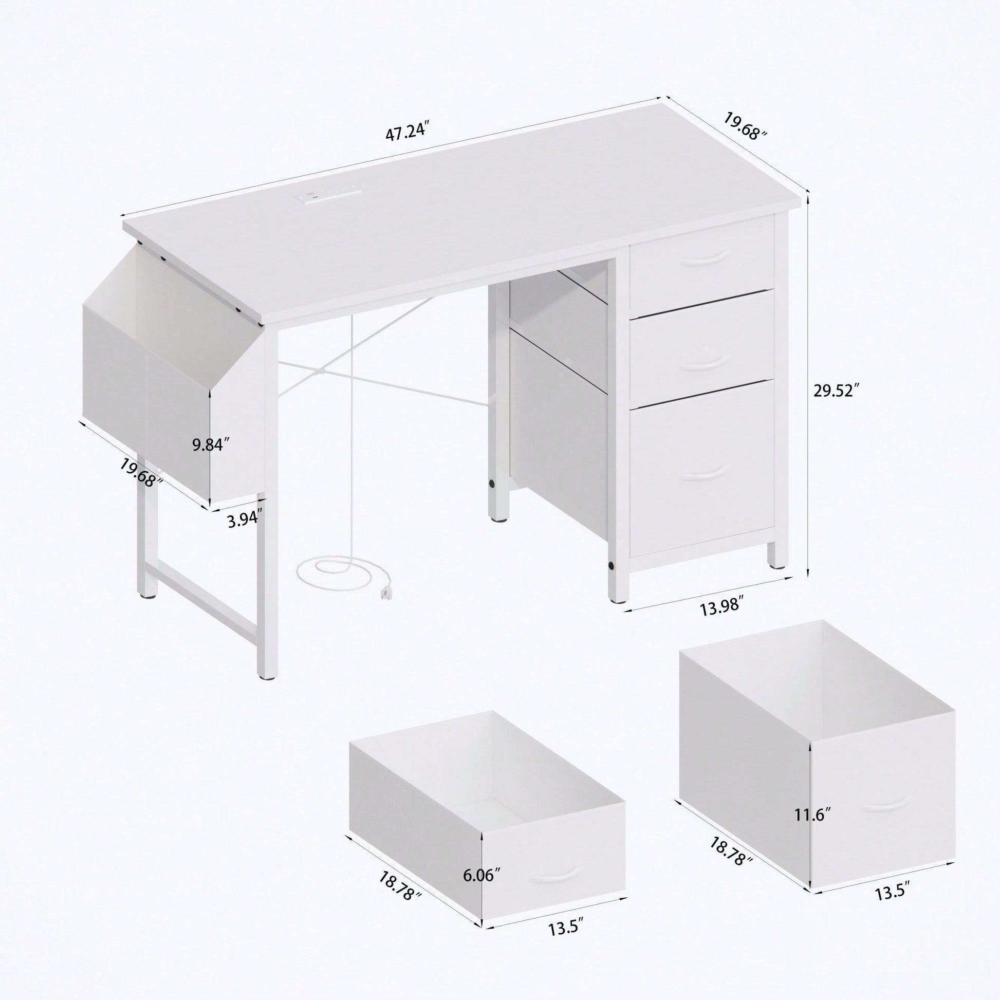 1. Features: - Multi-functional workbench with built-in power outlet - 3 foldable fabric drawers for ample storage - Adjustable and reversible design for customizable setup - Reinforced metal frame for enhanced stability - Steel adjustable foot pads for level surface and floor protection 2. Product Description: This 47-inch office desk is designed for versatility and convenience, featuring a multi-functional hidden power outlet with 2 standard outlets, 1 USB port, and 1 Type-C port to keep your workspace organized and free from clutter. The desk includes 3 fabric drawers, providing ample storage for documents, stationery, and personal items. The adjustable and reversible design allows you to customize the desk layout to fit your preferences. Its reinforced structural design ensures stability and durability, while the steel adjustable foot pads help maintain a level surface and protect your floors from scratches. Specifications: - Drawer dimensions: 2pcs at 18.8"D * 13.5"W * 6.1"H, 1pc at 18.8"D * 13.5"W * 12"H - Side pocket dimensions: 19"D * 12.2"W * 6.1"H
