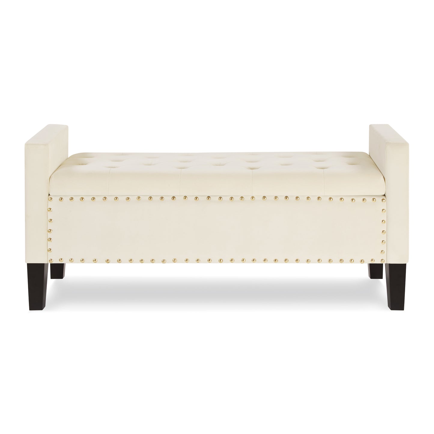Upholstered Tufted Button Storage Bench with Nail Trim Soft Padded Seat Armrest Entryway Living Room Cream Bed Bench