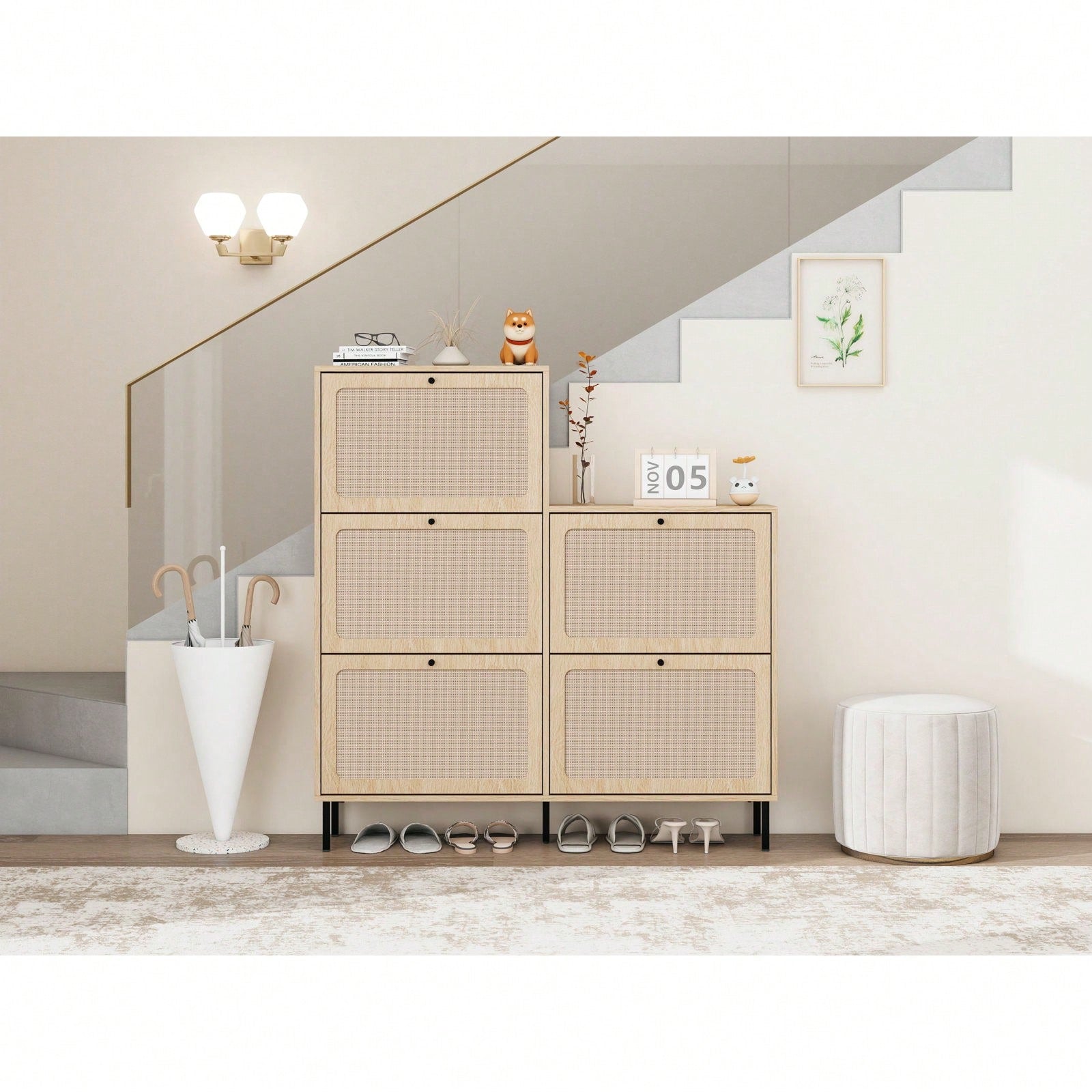 This freestanding modern shoe storage cabinet features a stylish design that complements any entryway. With five spacious doors, it offers ample storage for shoes while keeping them organized and easily accessible. The cabinet is constructed with engineered rattan, providing durability and moisture resistance. Its metal base includes five independent feet with anti-slip pads to protect your flooring and facilitate cleaning. Additionally, the black rounded handle ensures a comfortable grip for smooth opening and closing.