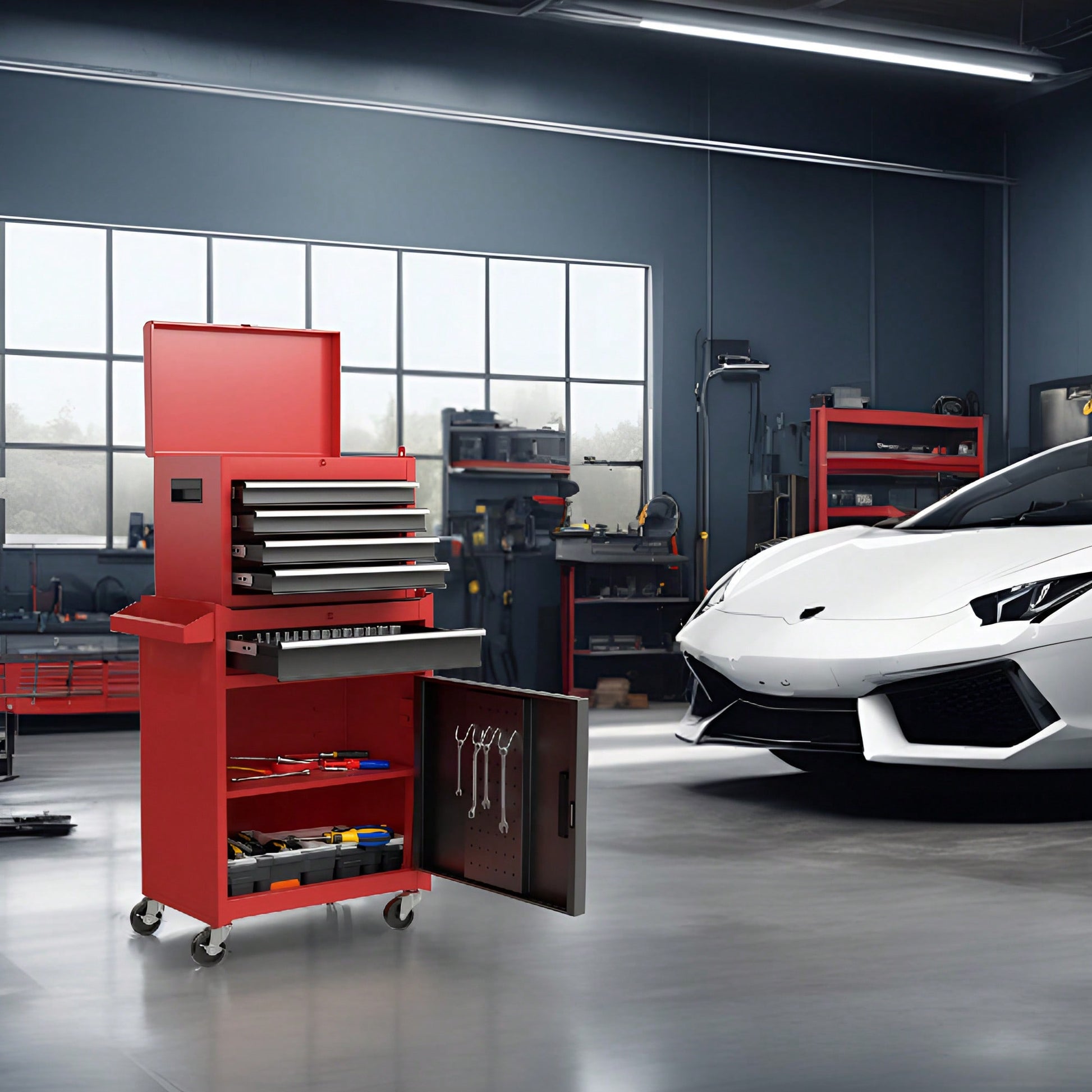 **Key Features:** - 5-drawer design with detachable top box for versatile storage options - Equipped with 4 universal wheels, including 2 with brakes for easy mobility and stability - Constructed from high-quality cold-rolled steel with anti-rust coating for durability - EVA padding in drawers for cushioning and heat insulation to protect tools - Side handle and hooks for easy transport and convenient tool organization **Product Description:** This 5-drawer rolling tool storage cabinet offers a practical solution for organizing tools in your garage or workshop. The top box features two handles for easy lifting, while the bottom cabinet includes hand bars for straightforward movement. The design allows the top box to be stored within the bottom cabinet, optimizing space. With four universal wheels, including two that lock, you can easily maneuver the tool chest and secure it in place. The cabinet is made from sturdy cold-rolled steel and coated with a high-quality anti-rust finish to prevent corrosion. The interior drawers are lined with EVA padding, providing excellent protection for your tools. Additionally, the toolbox includes detachable handles and hooks for added convenience, and the upper box is equipped with locks for enhanced security. **Specifications:** - Number of Drawers: 5 - Material: Cold-rolled steel - Wheel Type: Universal wheels (4 total, 2 with brakes) - Features: Detachable top box, EVA padding, locking mechanism, side hooks