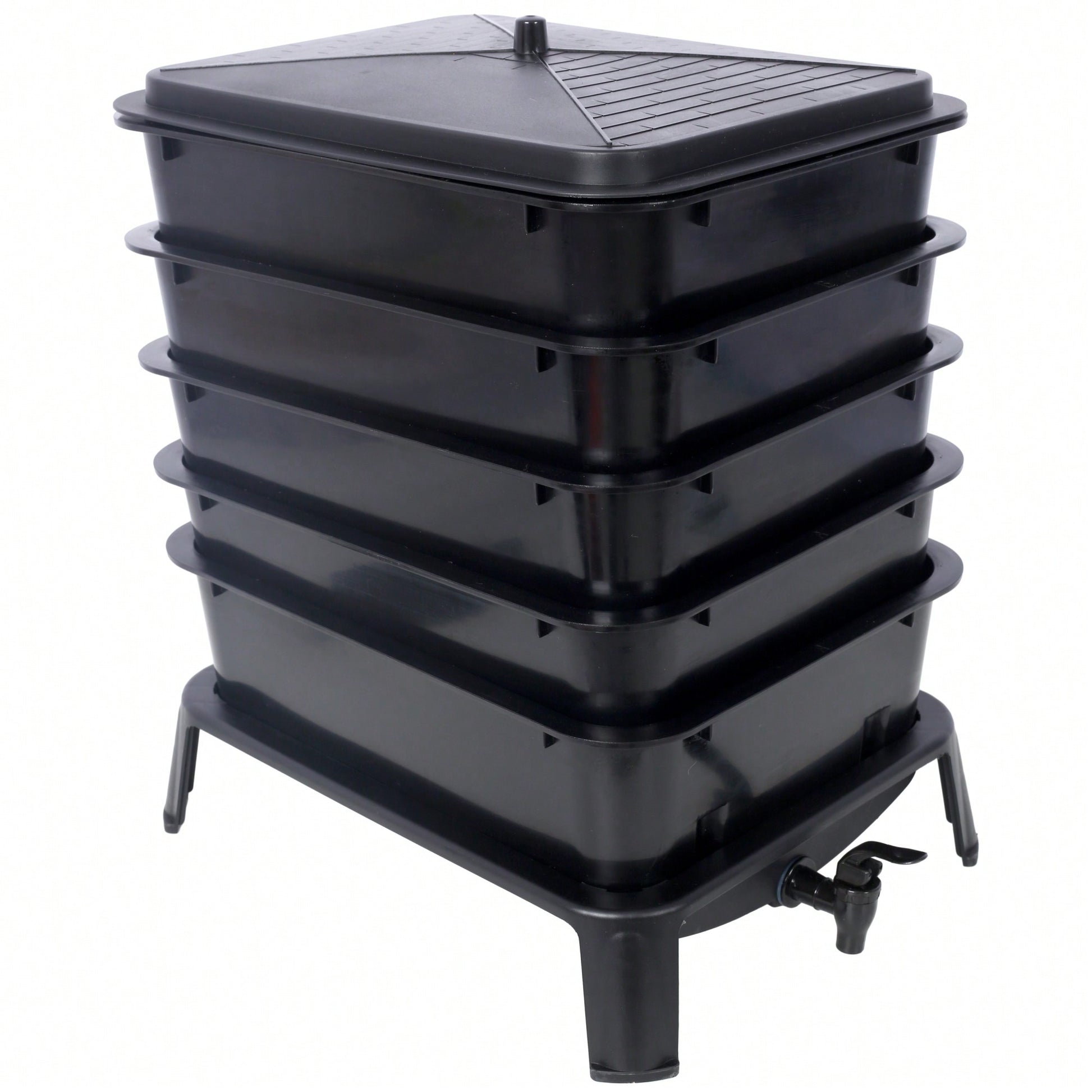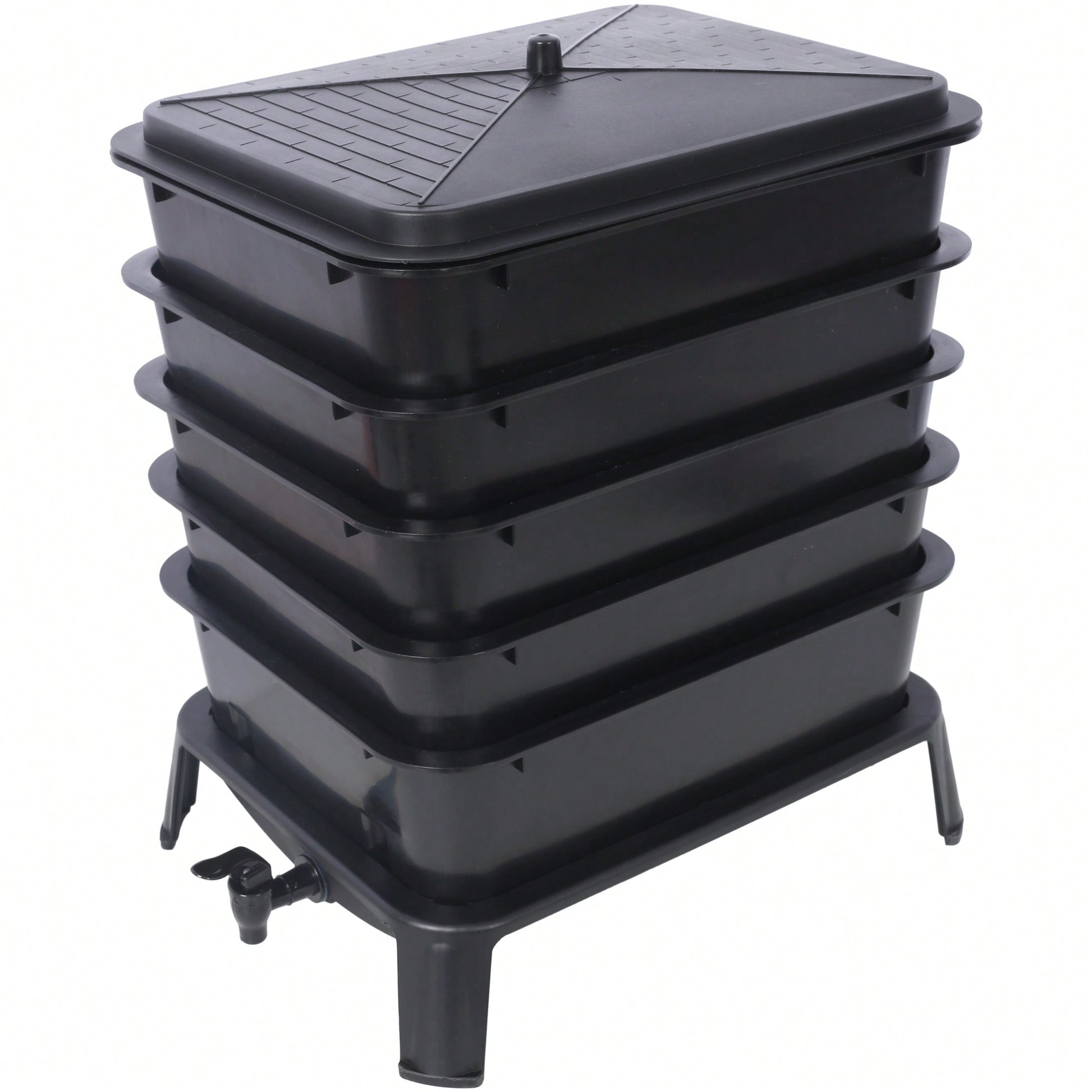 **Key Features:** - Efficient vermicomposting harnesses worms for accelerated decomposition and nutrient-rich compost production. - Large capacity of 50L (13 Gal) with a compact, stackable design suitable for kitchens, balconies, or gardens. - Excellent aeration and odor control through thoughtfully designed ventilation slits for optimal worm activity. - Easy setup in just 5 minutes with a user-friendly stackable system for waste addition and compost collection. - All-in-one starter kit includes essential accessories for efficient composting. **Product Description:** This 5-layer worm compost bin is designed to make vermicomposting simple and effective. With a generous capacity of 50L, it features a multi-layer structure that allows for efficient separation of compost materials while maintaining a space-saving footprint. The durable PP plastic construction ensures longevity, while the ventilation slits promote excellent airflow, preventing odors and supporting healthy worm growth. The kit is easy to assemble and includes a convenient spigot for collecting nutrient-rich worm tea. Additionally, it comes with a soil meter, coconut brick, shovel, rack, measuring cup, and non-woven fabrics, providing everything needed to start composting right away. **Specifications:** - Capacity: 50L (13 Gal) - Material: Durable PP plastic - Number of layers: 5 - Includes: Soil meter, coconut brick, shovel, rack, measuring cup, non-woven fabrics