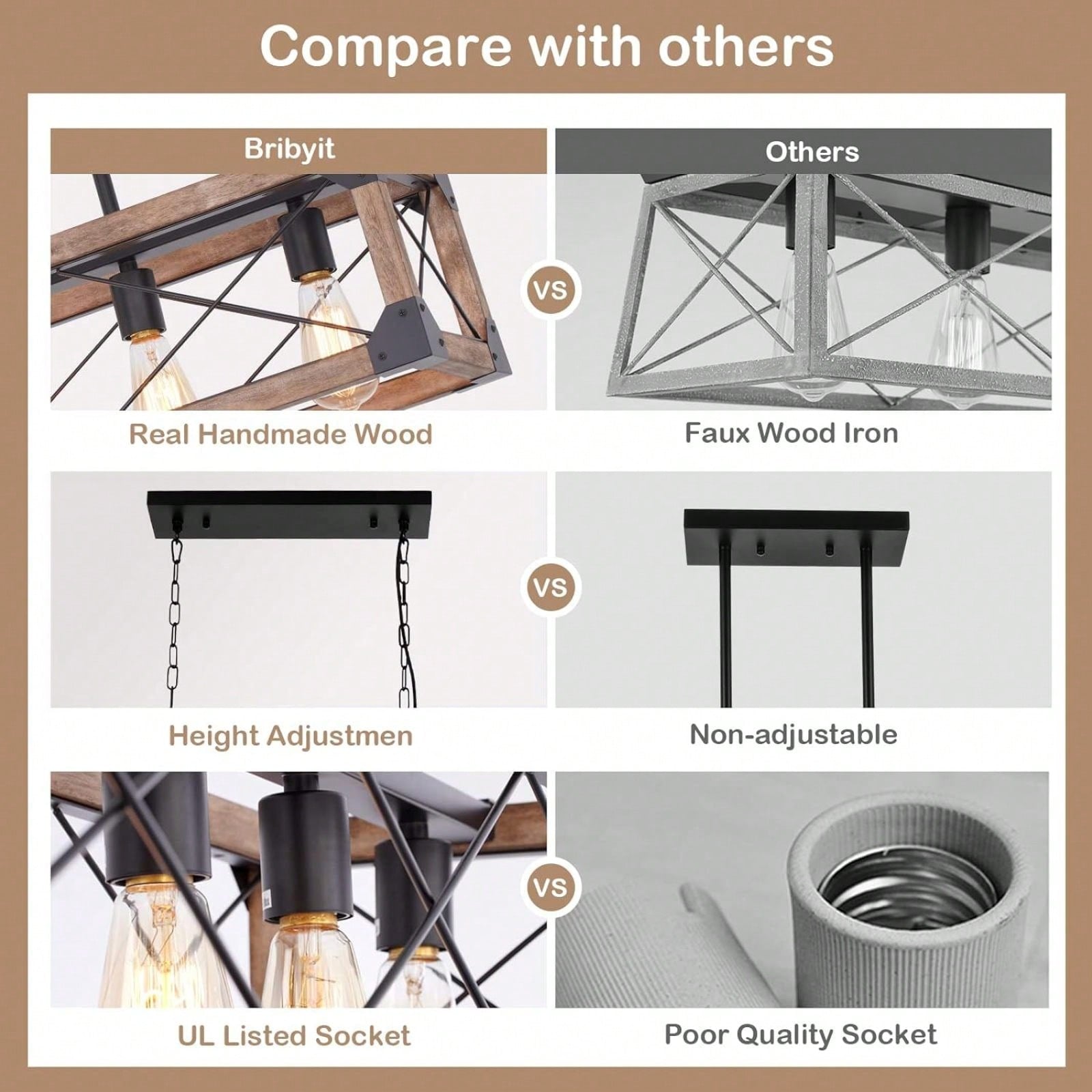 This elegant island light fixture brings a touch of farmhouse industrial style to any kitchen or dining area. The fixture features a sleek black metal canopy paired with a natural solid wood frame, accented by a slender black iron grille and eight iron corner guards. This light fixture is crafted with real, natural wood for an authentic look and feel. The adjustable height allows you to customize the look for your space, making it perfect for kitchen islands, dining tables, or bar areas.