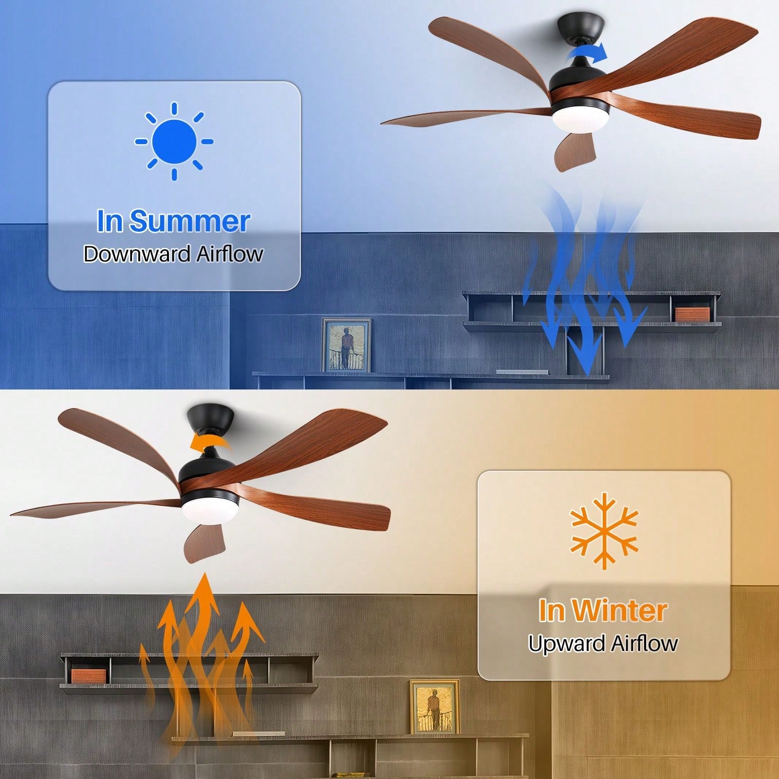1. Reversible DC Motor: Enjoy year-round comfort with a reversible ceiling fan that efficiently switches between downward airflow for summer and upward airflow for winter, ensuring even heat distribution throughout the room.
