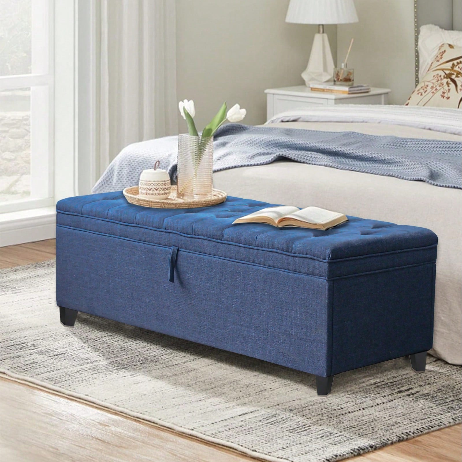 55 Inch Blue Linen Storage Ottoman Bench with Tufted Lid and Padded Seat for Entryway Living Room Bedroom