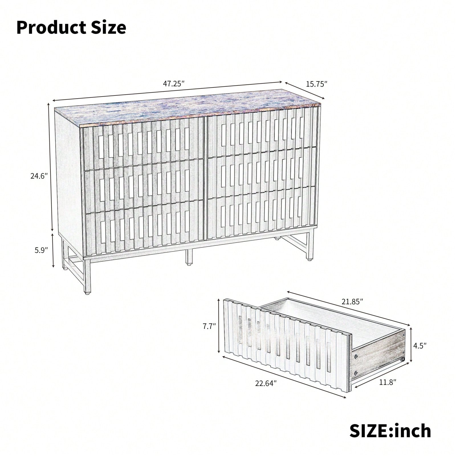 6 Drawer Double Dresser With Slatted Grille Striped Drawer, Modern Style Dresser, High-Quality MDF And Metal Leg