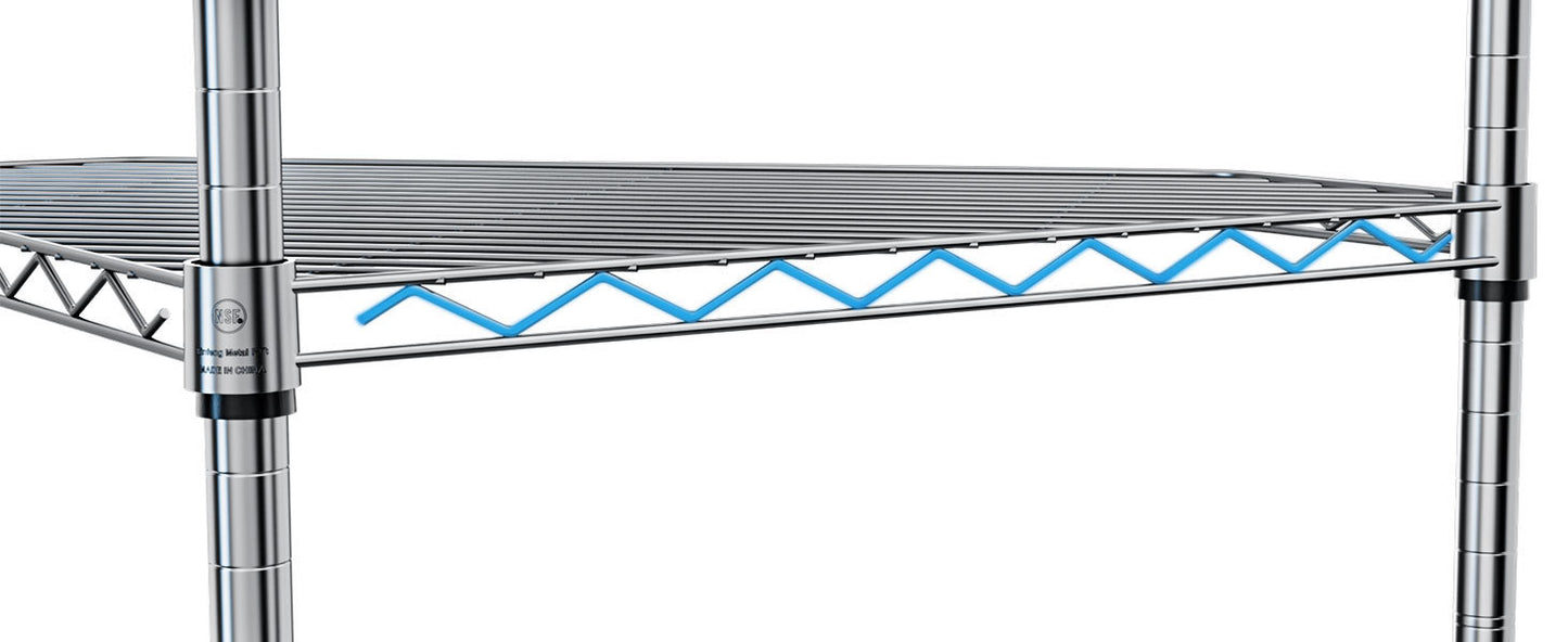 Product dimensions: Height: XX inches, Width: XX inches, Depth: XX inches. Maximum load capacity: 600 lbs. Each shelf capacity: 100 lbs (evenly distributed). Material: Heavy steel with chrome finish. Assembly: No tools required.