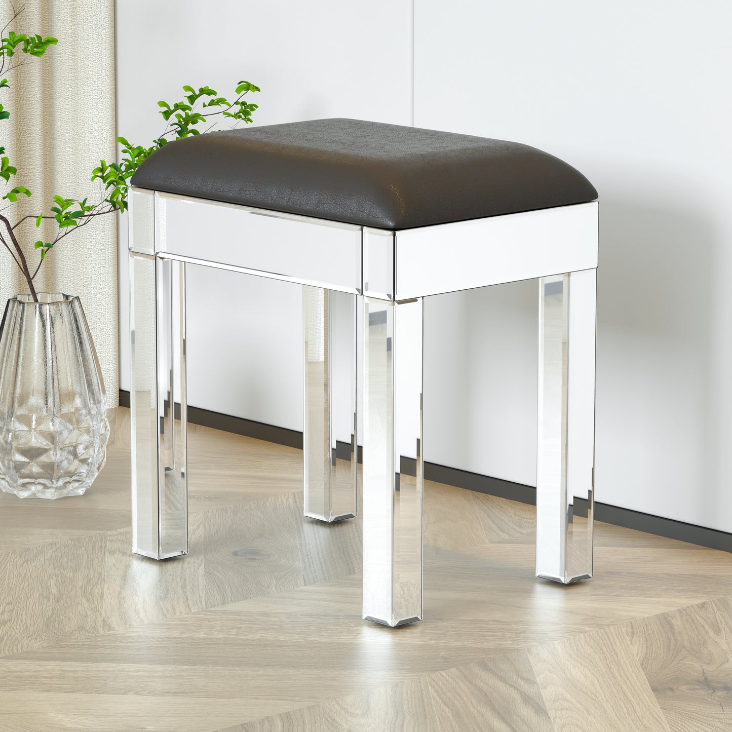 Mirrored vanity stool makeup bench with PU leather offers a modern touch to any space. With a cushioned seat designed for comfort, this versatile dressing chair is perfect for bedrooms, living rooms, or entryways. Its solid wood legs and durable MDF frame ensure stability, while the high-density foam filling provides lasting support. The elegant design is complemented by the sleek black PU leather upholstery, making it an ideal addition to your home decor.