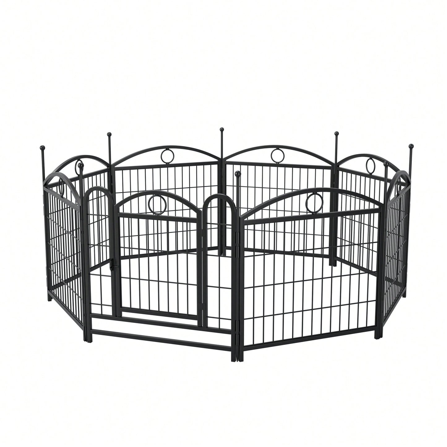 **Key Features:** - Spacious semi-open activity area for pets - Anti-rust and corrosion-resistant design with heavy-duty iron - Automatic gravity-actioned locking for safety - Easy to assemble and customizable shapes - Foldable and portable for travel and outdoor use **Product Description:** This dog playpen is designed to provide a safe and spacious environment for your pets, offering a semi-open area that allows them to play and exercise freely. Unlike traditional cages or kennels, this pen creates a secure kingdom for your beloved dog, allowing you to relax without worry. Made with advanced technology, the heavy-duty iron structure is coated with silver powder to ensure high resistance to rust, corrosion, and UV rays, enhancing durability for both indoor and outdoor use. The pen features an automatic locking mechanism to keep pets secure, while round ball tips on stakes prevent injuries. Assembly is quick and straightforward, taking less than five minutes, and the panels can be adjusted to create various shapes such as square, rectangle, or round, depending on your space. Additionally, the pen is foldable and can be compactly stored or easily transported, making it ideal for travel, camping, or outdoor play. Suitable for various pets, including dogs, rabbits, and cats, this playpen allows your pets to enjoy their freedom while keeping them safe from potential hazards. **Specifications:** - Height: 24 inches - Number of Panels: 8 - Material: Heavy-duty thickened iron - Coating: Silver powder-coated for rust and corrosion resistance - Locking Mechanism: Automatic gravity-actioned - Design: Customizable shapes (square, rectangle, round) - Foldable: Yes, for easy storage and transport