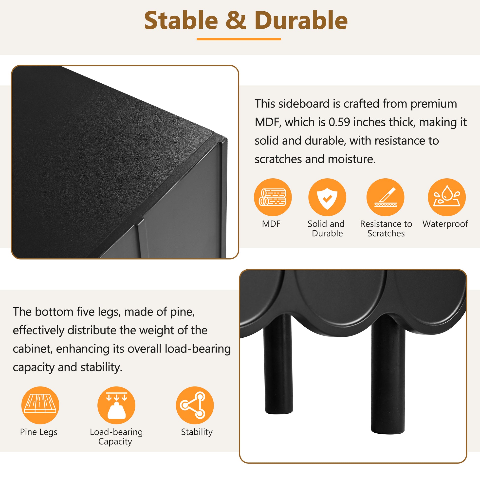 • This sideboard is crafted from premium MDF, which is 0.59 inches thick, making it solid and durable, with resistance to scratches and moisture. The bottom five legs, made of pine, effectively distribute the weight of the cabinet, enhancing its overall load-bearing capacity and stabilit