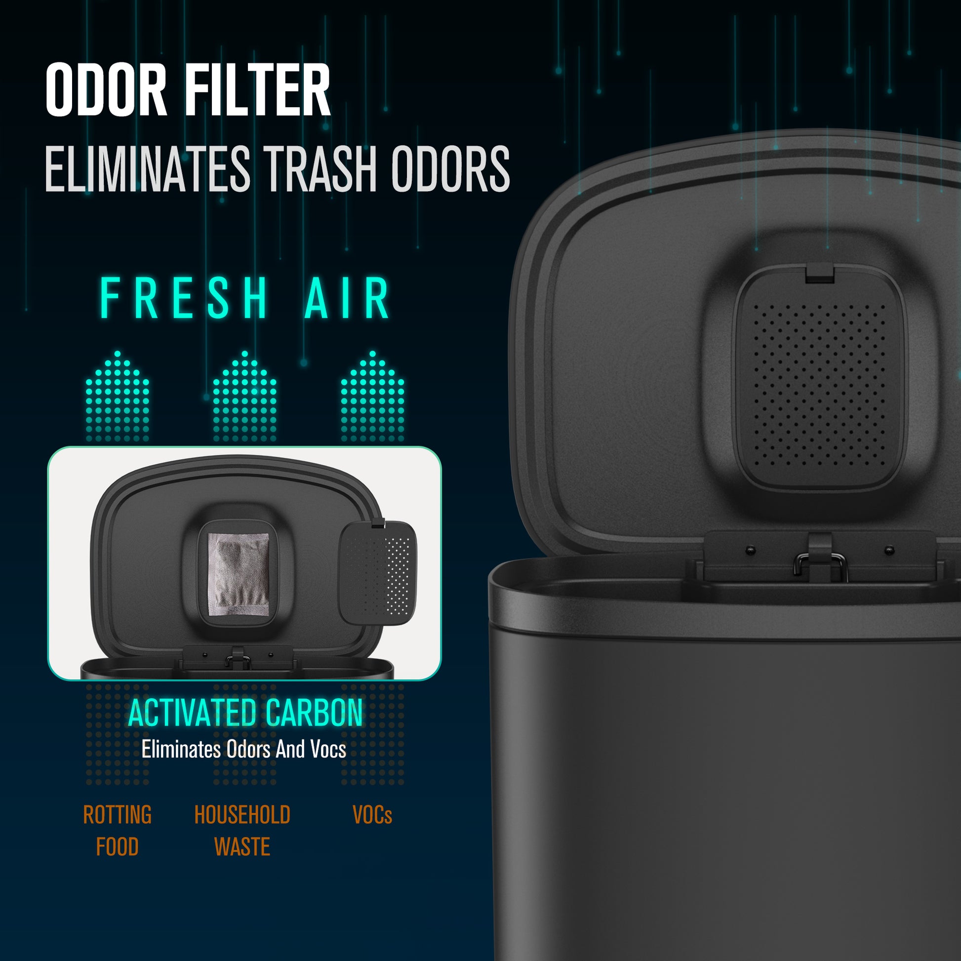 - Soft-close lid mechanism prevents loud slamming and seals in odors
