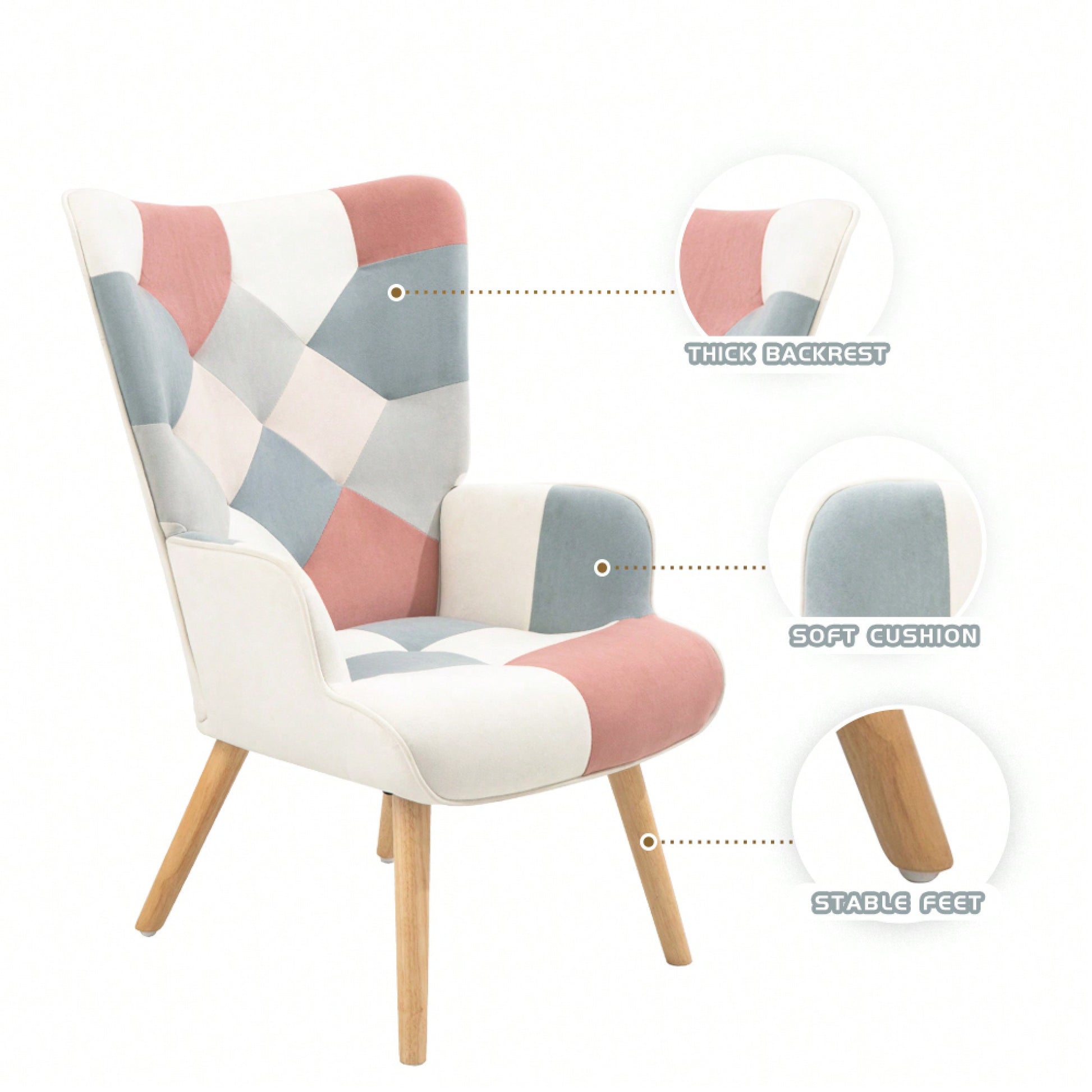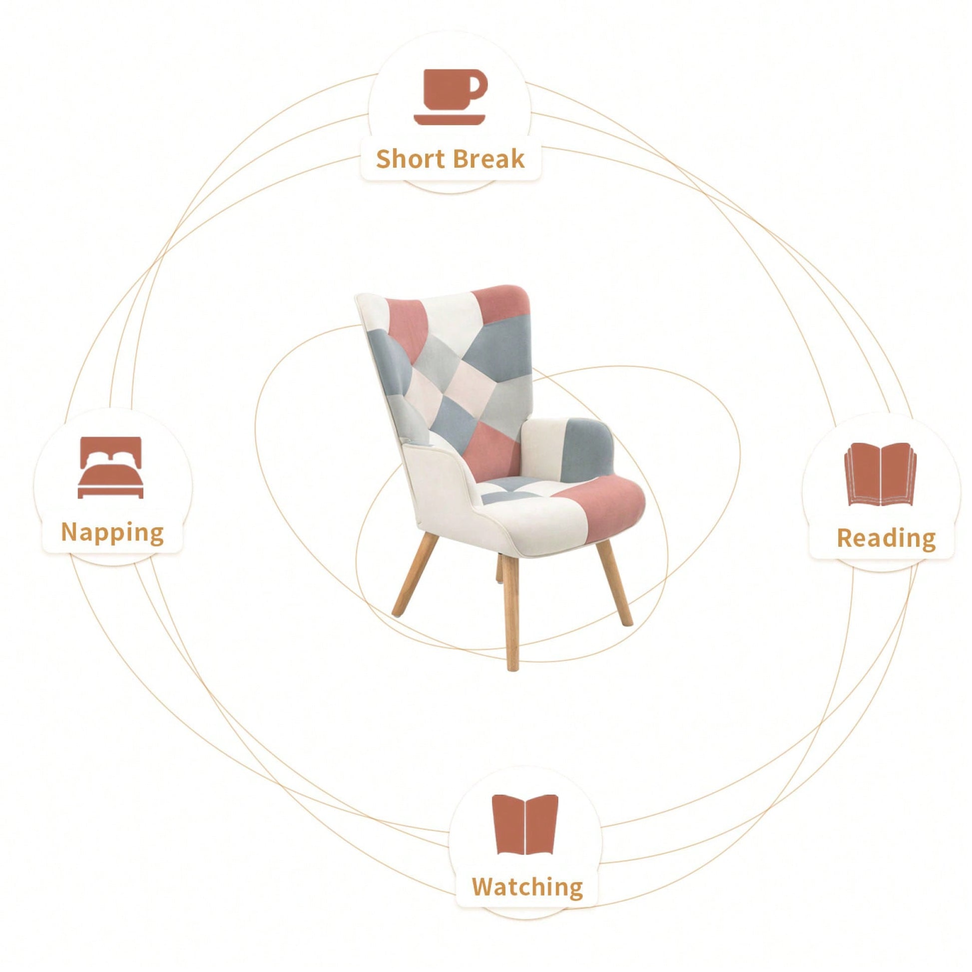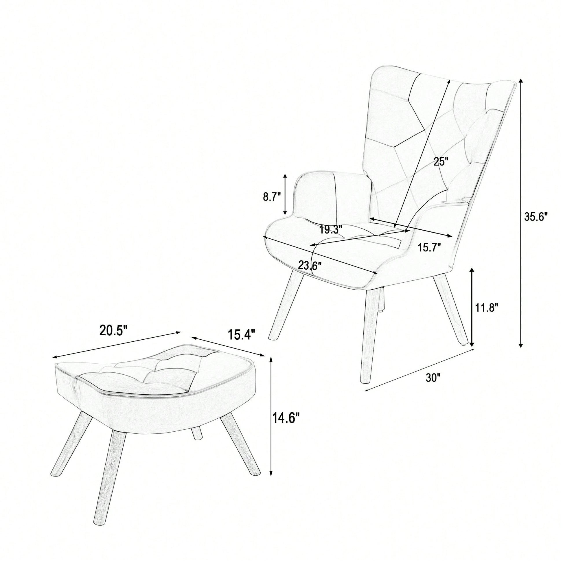 This accent chair with ottoman set features a unique splicing cloth surface and a stylish curved tall back, making it an eye-catching addition to any room. The armchair is designed not only for comfort but also as a decorative piece for your home. It is upholstered with high density sponge and soft linen fabric, ensuring a cozy seating experience. The sturdy solid wood frame guarantees stability, while the linen fabric cover ensures durability for long-term use. Installation is straightforward with included instructions, allowing you to easily assemble the chair and ottoman set.