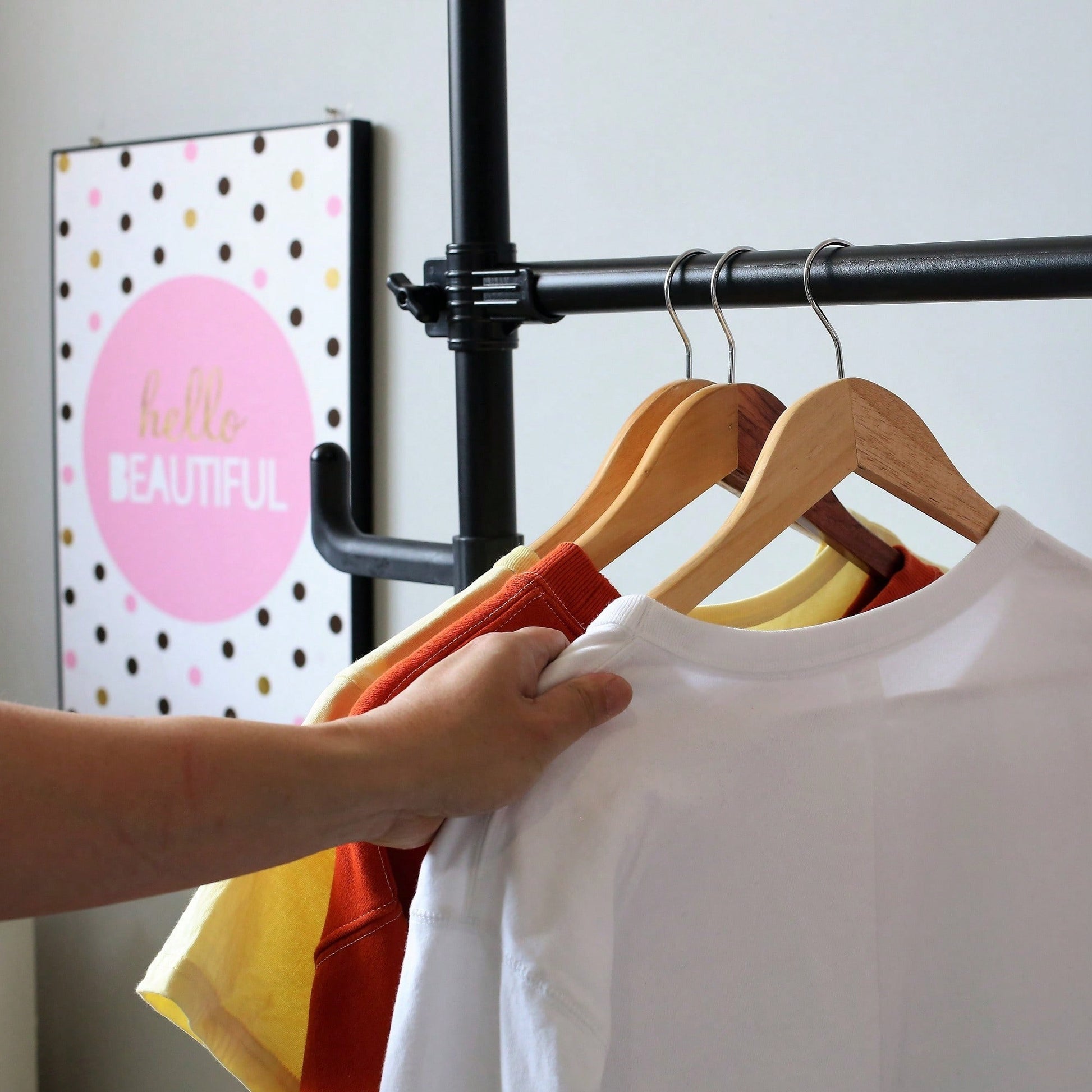 This adjustable garment rack is designed to offer a reliable and sturdy solution for organizing your clothing and accessories. The heavy-duty construction includes thicker vertical poles and hanger rods that provide enhanced stability. Featuring a double locking system on the vertical pole, you can trust that this rack will remain securely in place without any risk of collapsing.