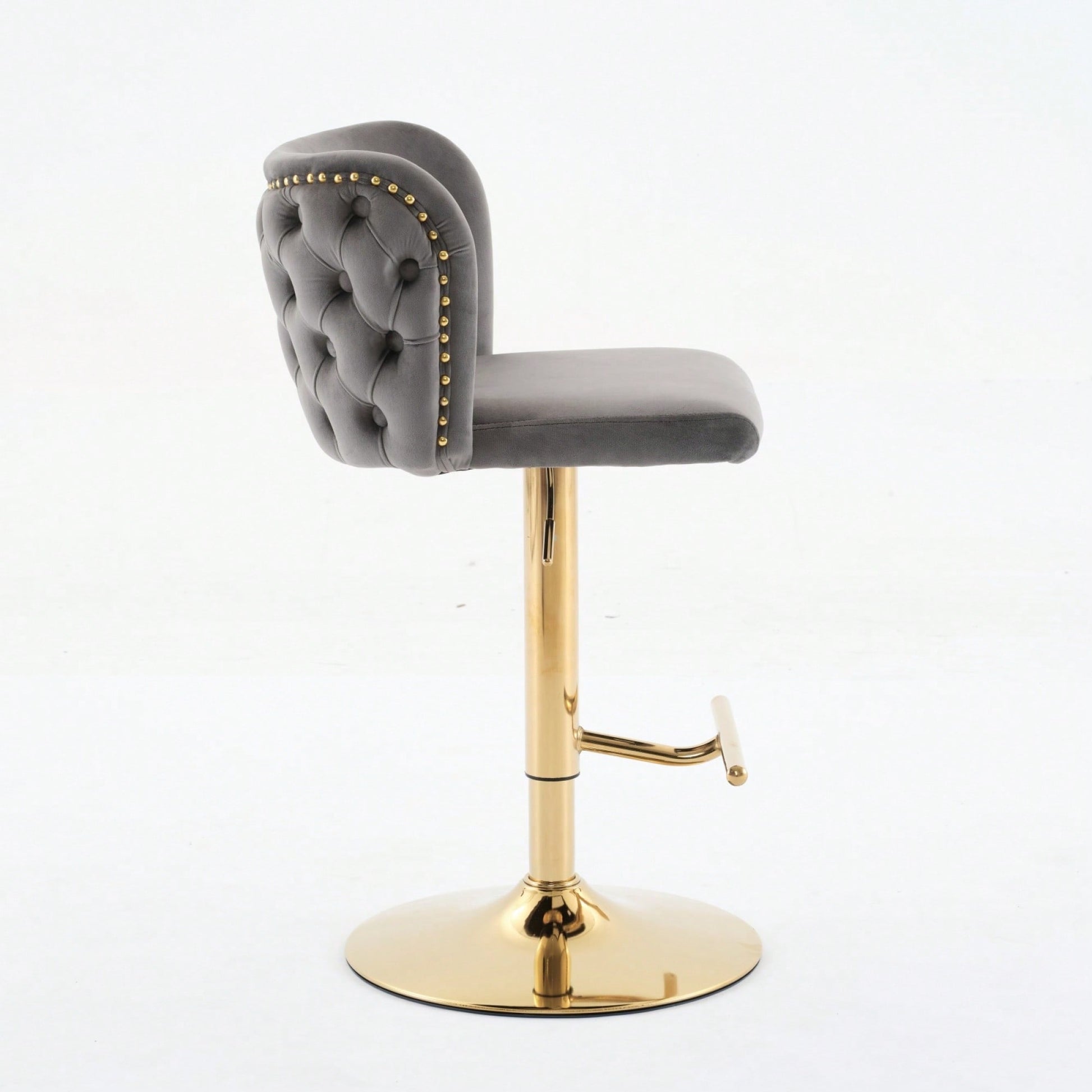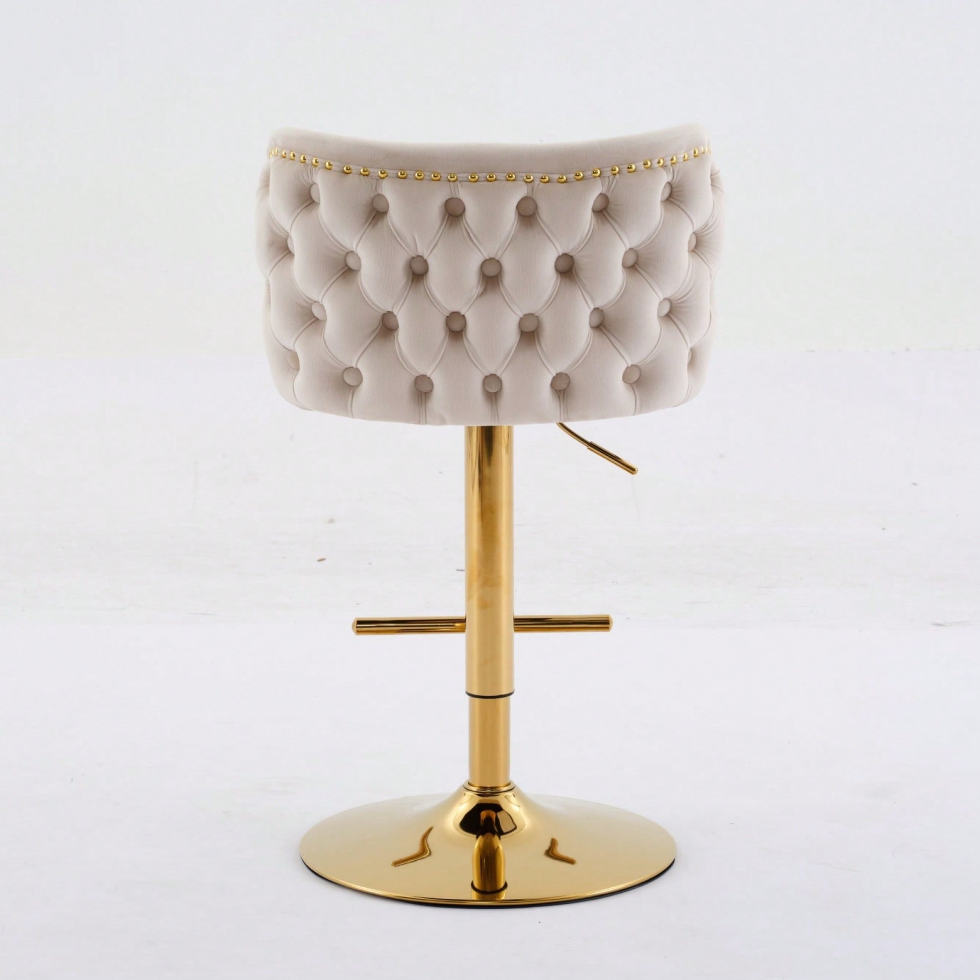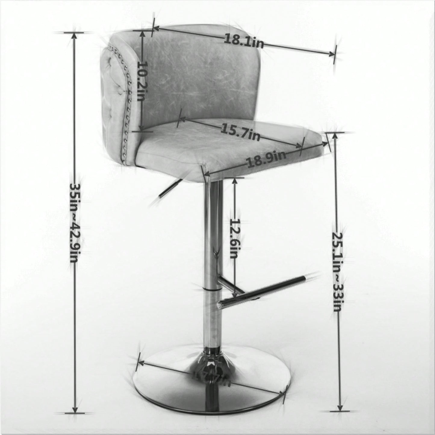 This sleek and elegant bar stool set combines style and functionality, making it a perfect addition to any home pub or kitchen island. The stools feature an ergonomic design that provides excellent support for your back and waist, ensuring comfort during prolonged seating. The seats are enhanced with exquisite hand-pulled buttons on the backrest, reflecting a sense of luxury, while the hand-hammered rivets add a decorative flair. The sturdy gold-plated base not only complements the sophisticated look but also provides a solid foundation that ensures the stability and durability of the stools. Adjusting the height from 25 to 33 inches makes these bar stools suitable for a variety of counter heights, and the 360° swivel capability allows for effortless movement.