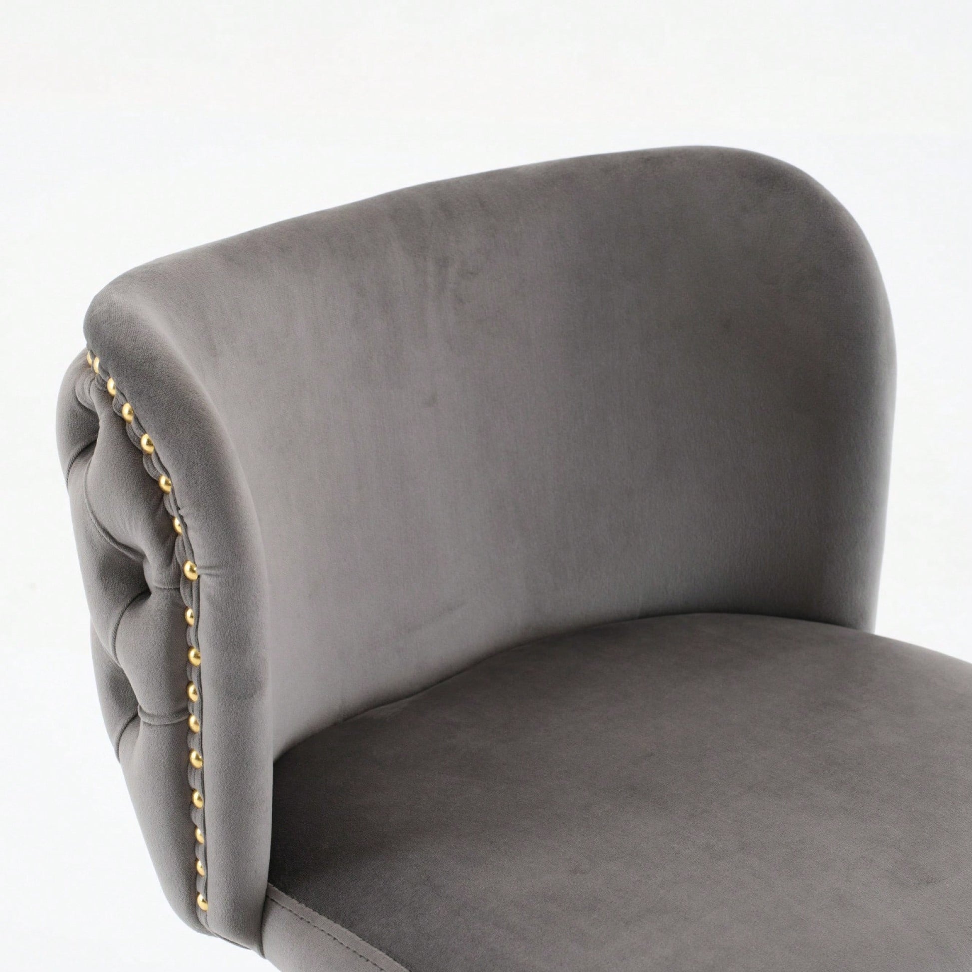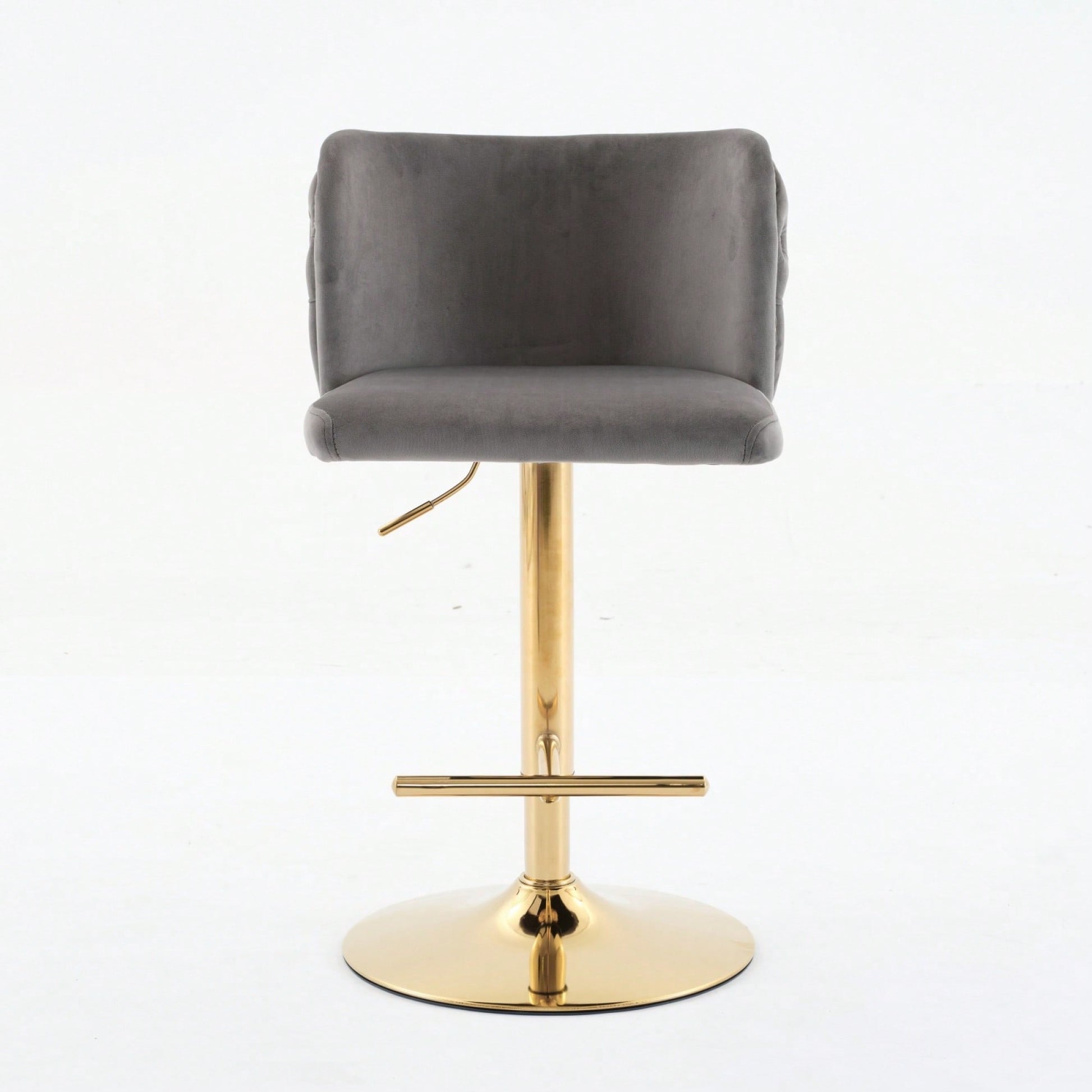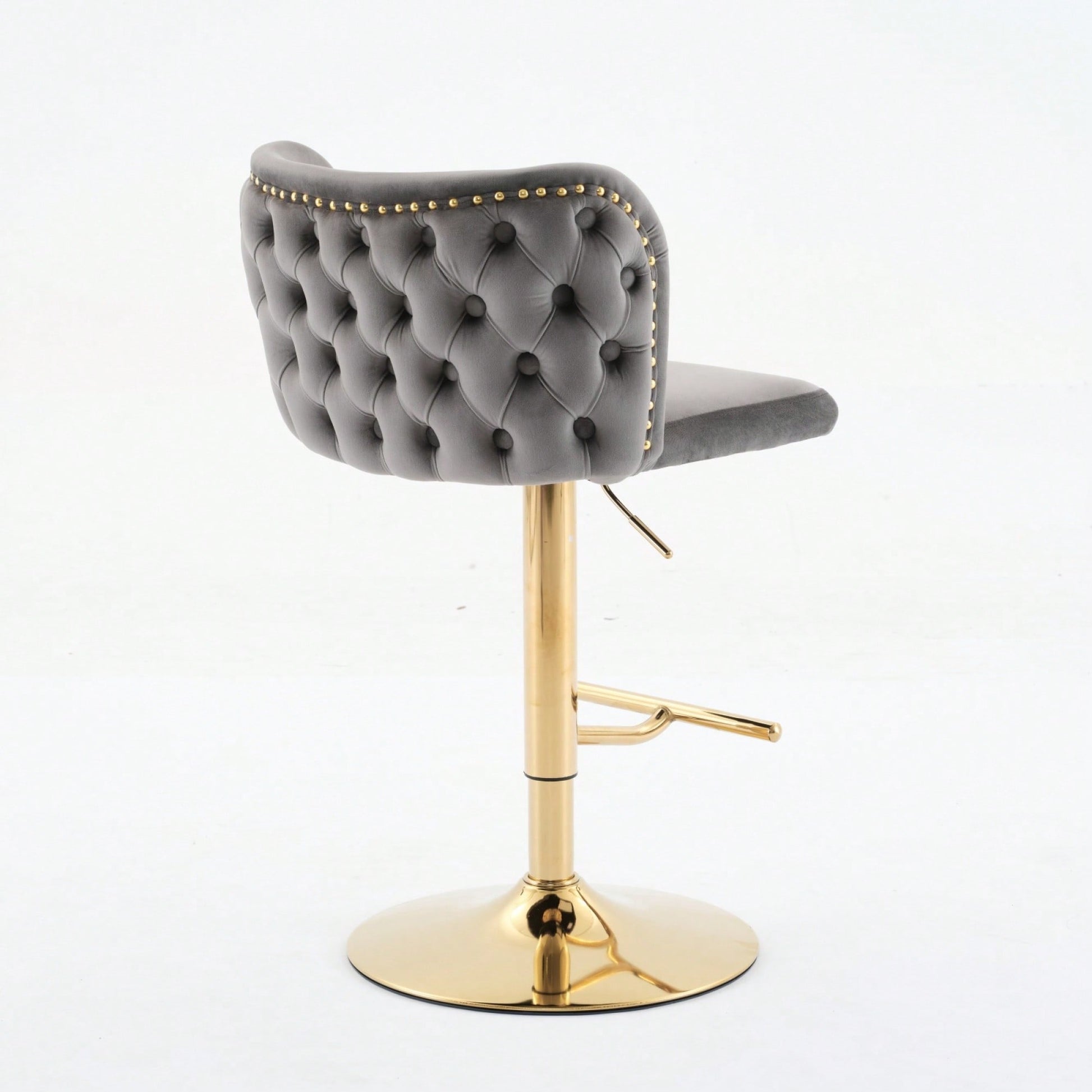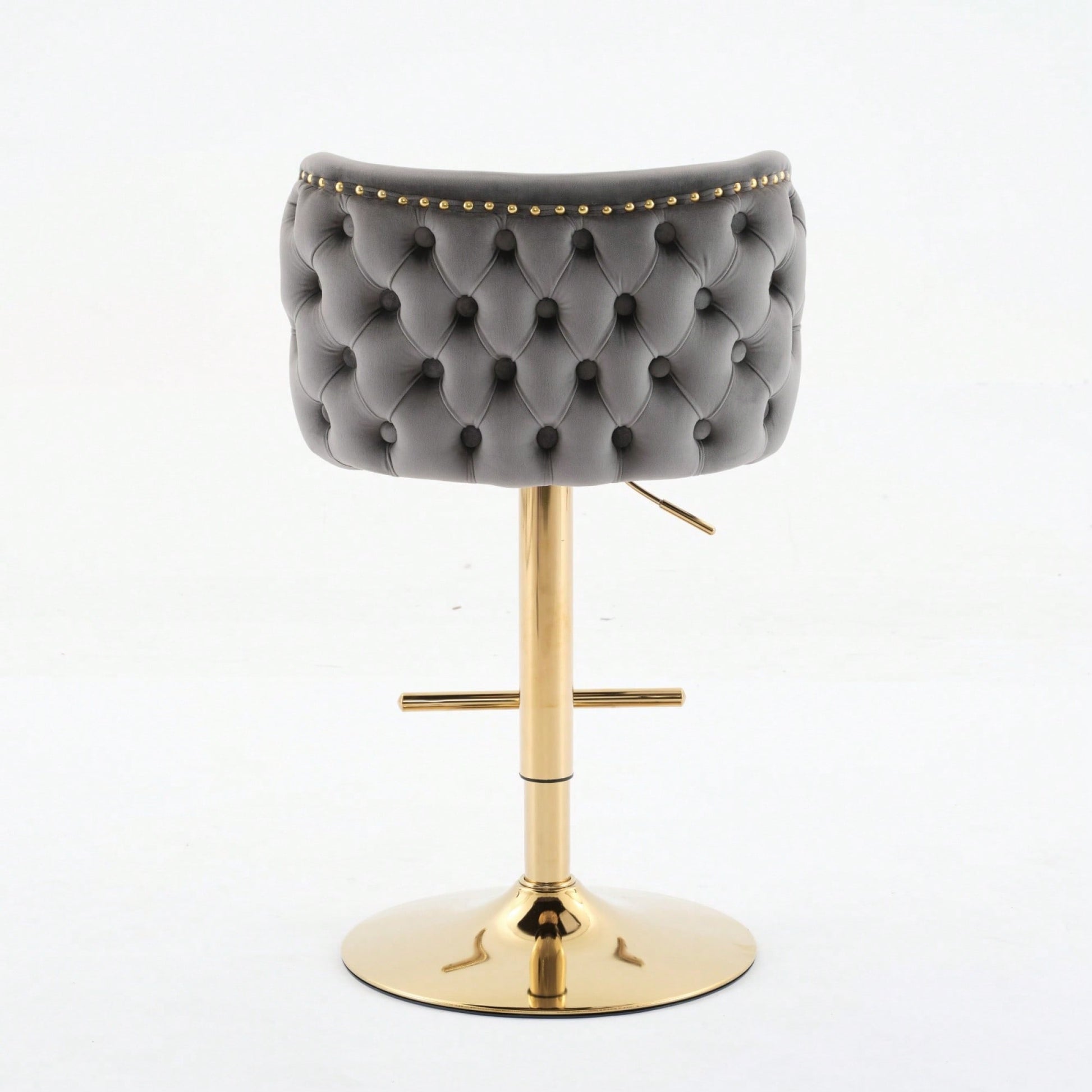 This sleek and elegant bar stool set combines style and functionality, making it a perfect addition to any home pub or kitchen island. The stools feature an ergonomic design that provides excellent support for your back and waist, ensuring comfort during prolonged seating. The seats are enhanced with exquisite hand-pulled buttons on the backrest, reflecting a sense of luxury, while the hand-hammered rivets add a decorative flair. The sturdy gold-plated base not only complements the sophisticated look but also provides a solid foundation that ensures the stability and durability of the stools. Adjusting the height from 25 to 33 inches makes these bar stools suitable for a variety of counter heights, and the 360° swivel capability allows for effortless movement.