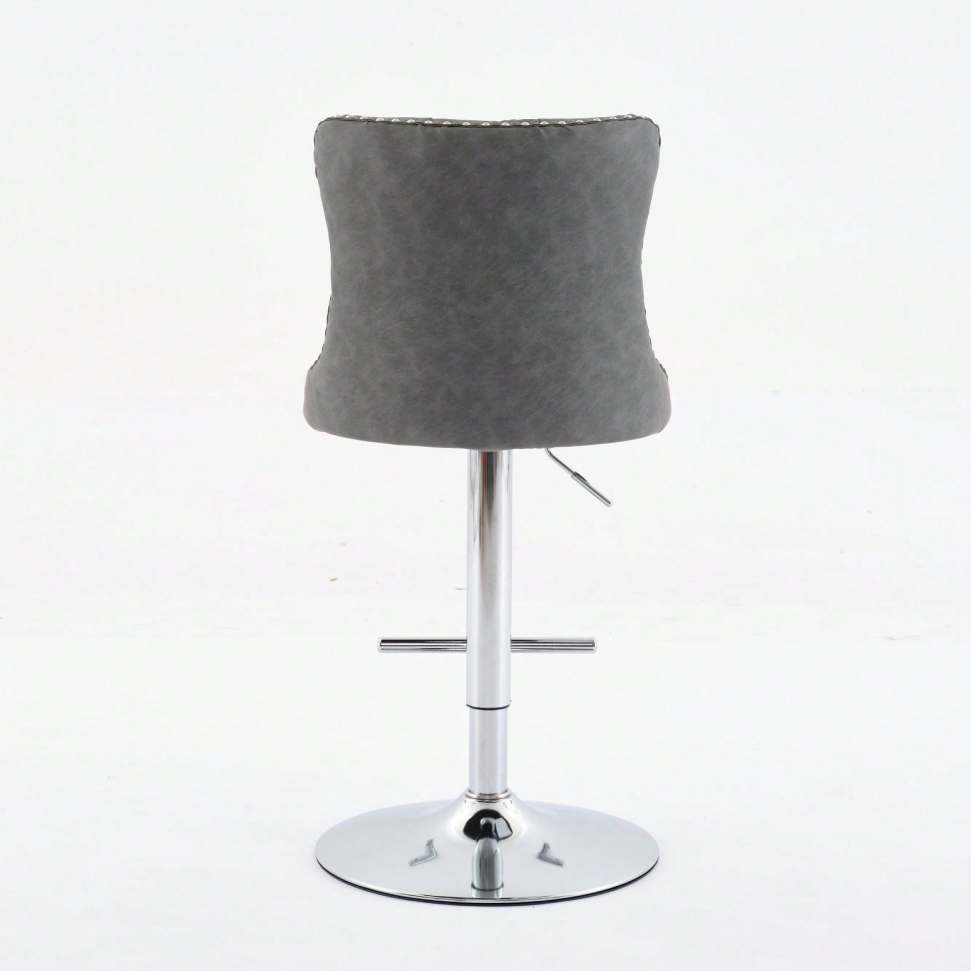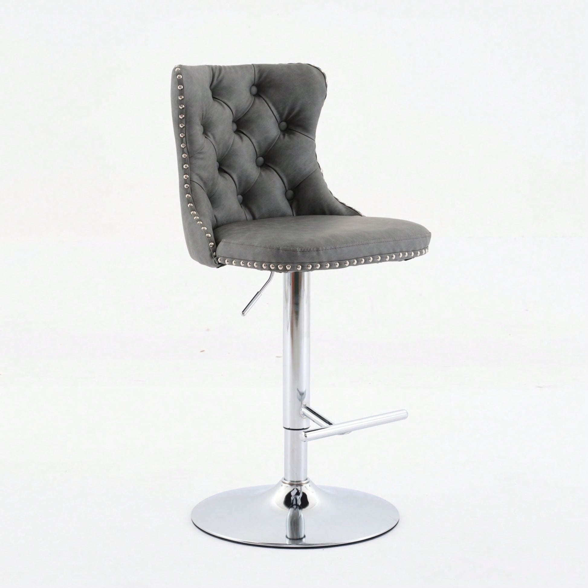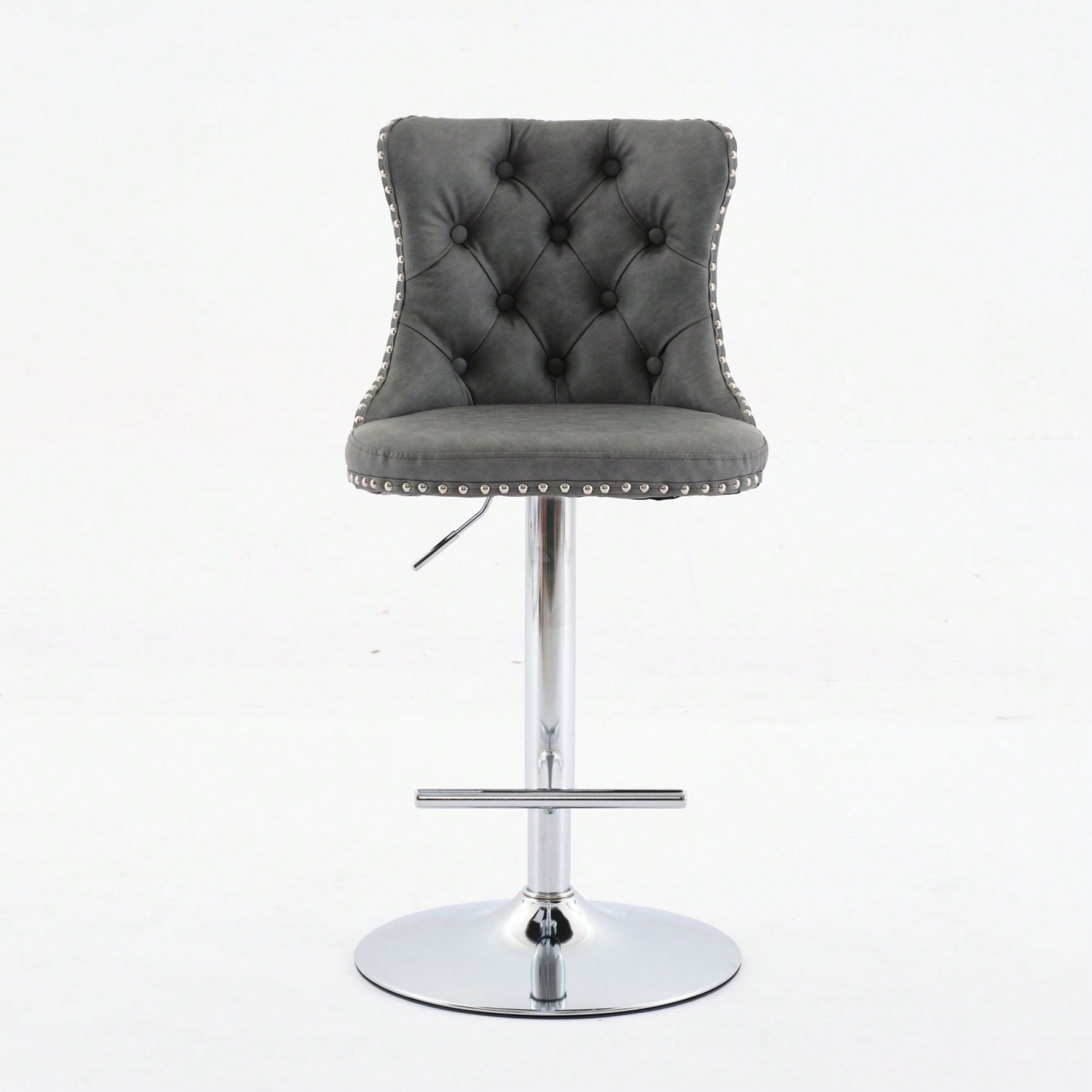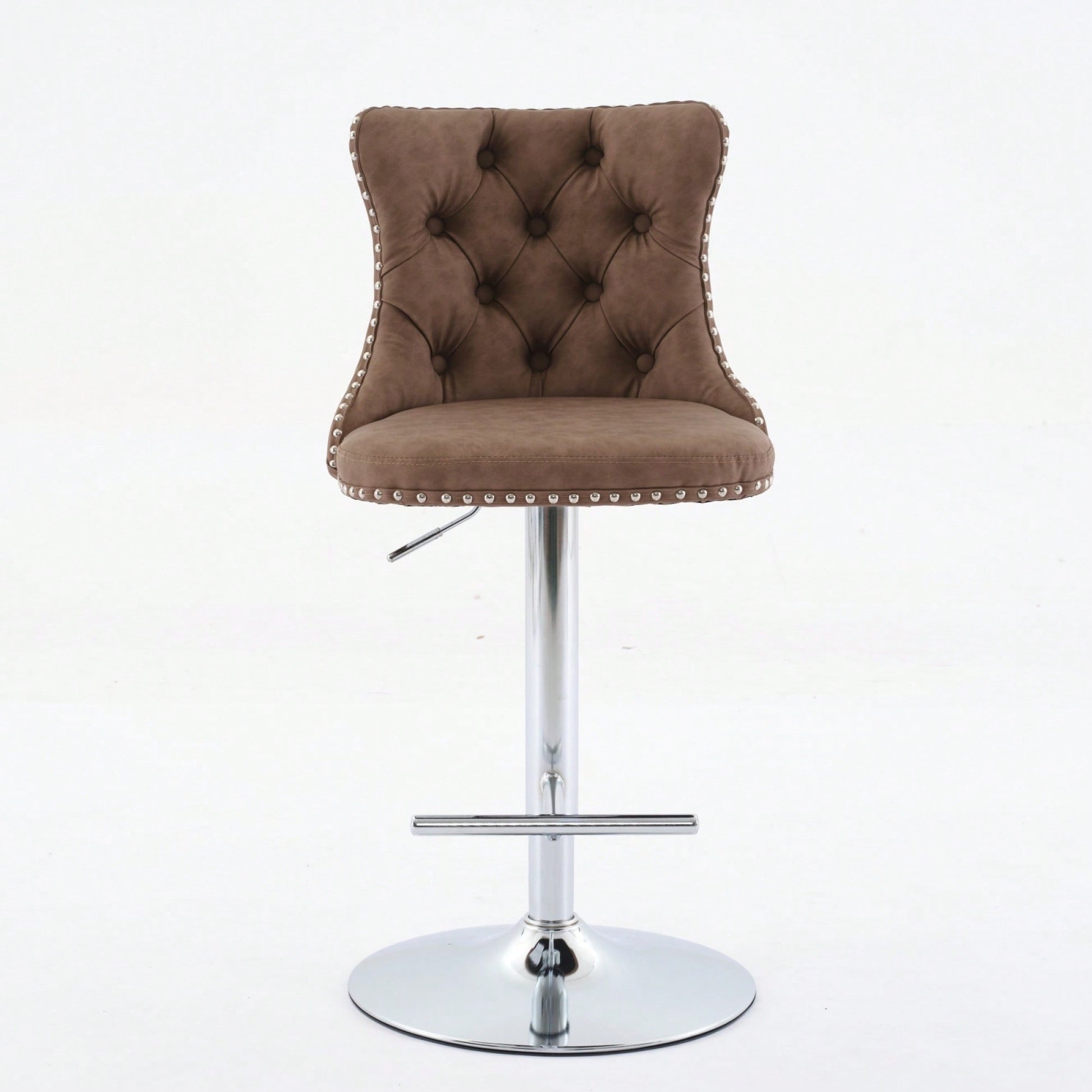 Elevate your home, pub, or kitchen island with these sophisticated barstools. Featuring a comfortable design with an adjustable seat height, they accommodate a range of seating preferences while ensuring maximum comfort. The stools are built with a sturdy chrome base that provides exceptional stability, allowing you to enjoy a secure seating experience. Additionally, the ergonomic seat promotes good posture, with waist support and hand-pulled buttons that add a touch of luxury. The decorative hand-hammered rivets enhance the overall aesthetic, making these barstools a stylish addition to your decor.
