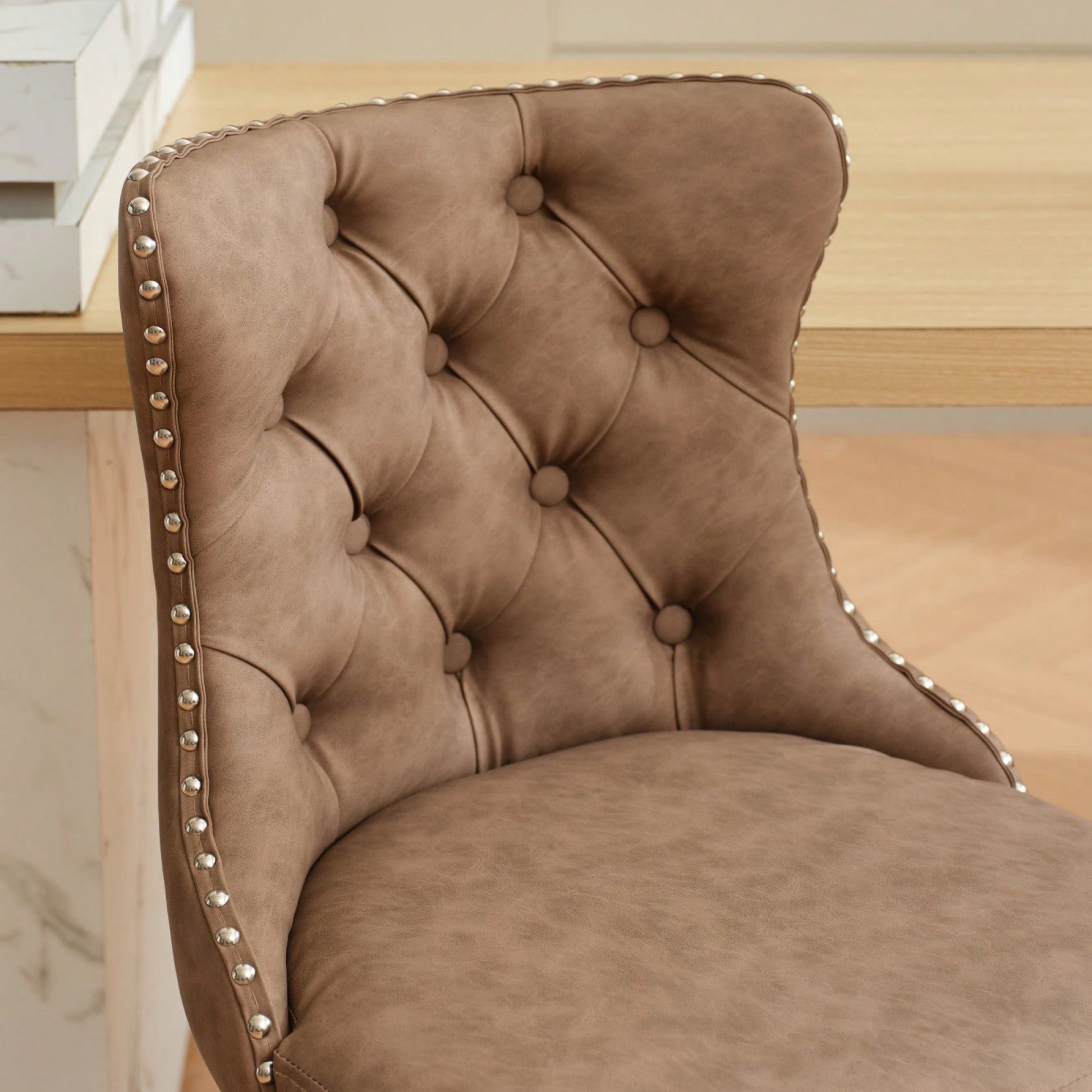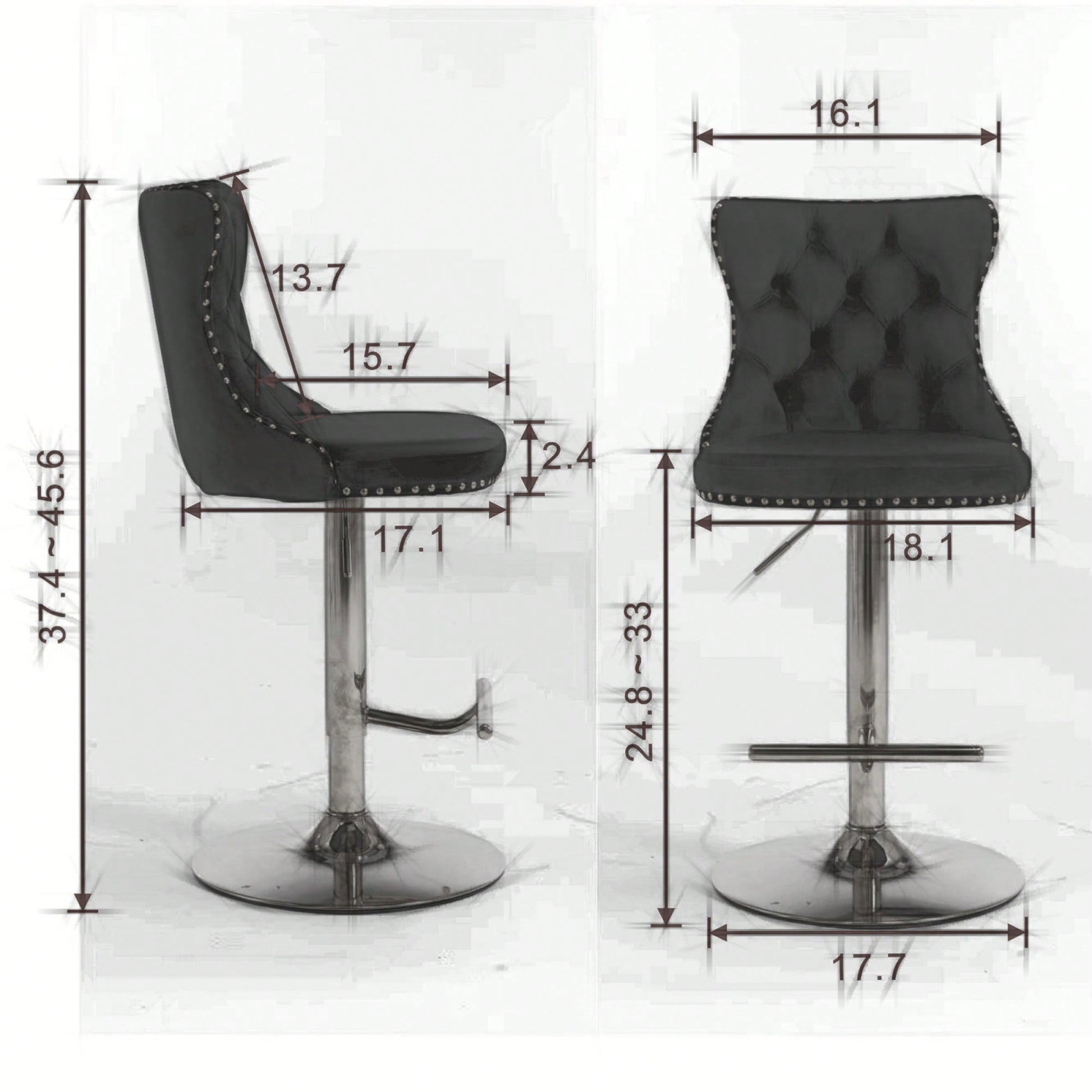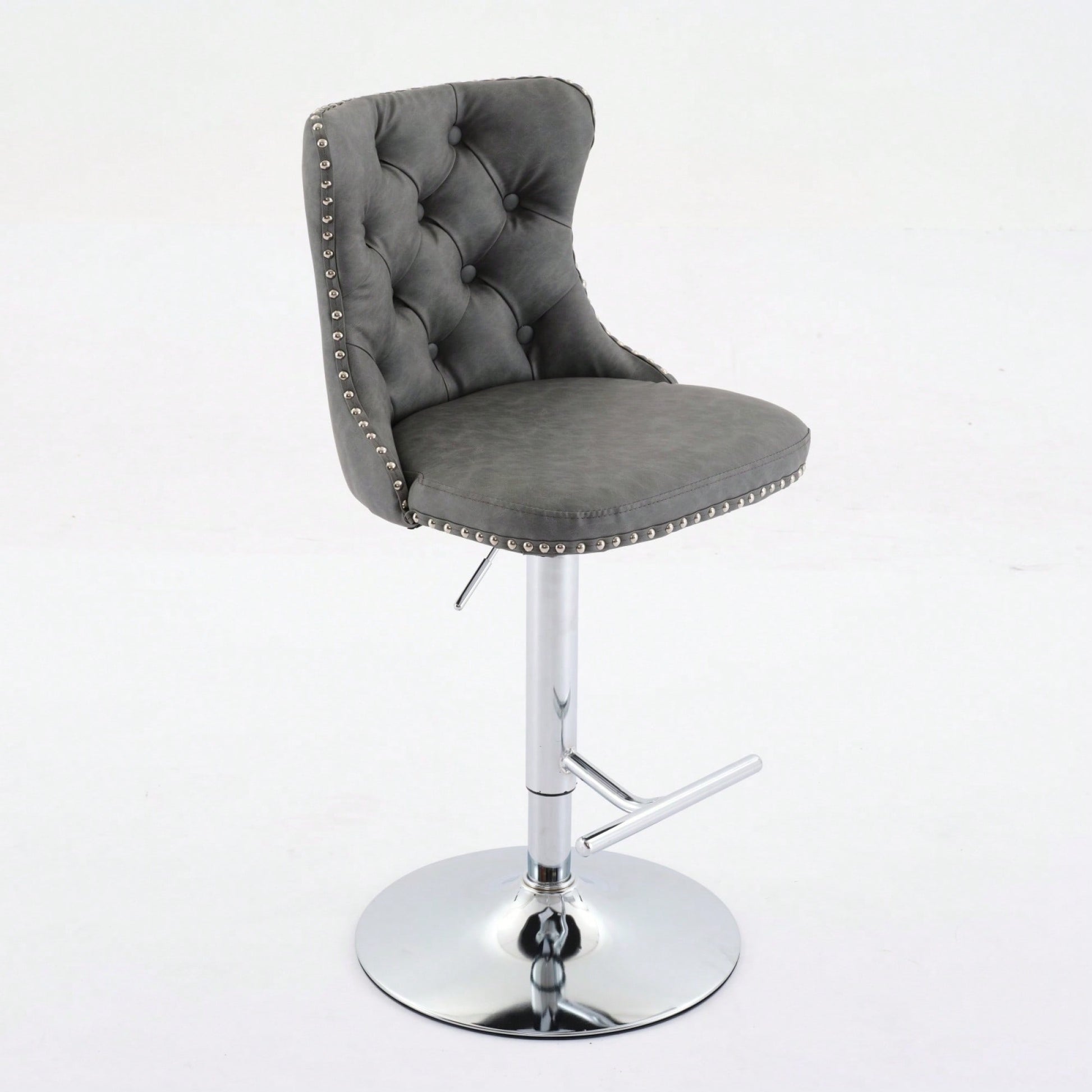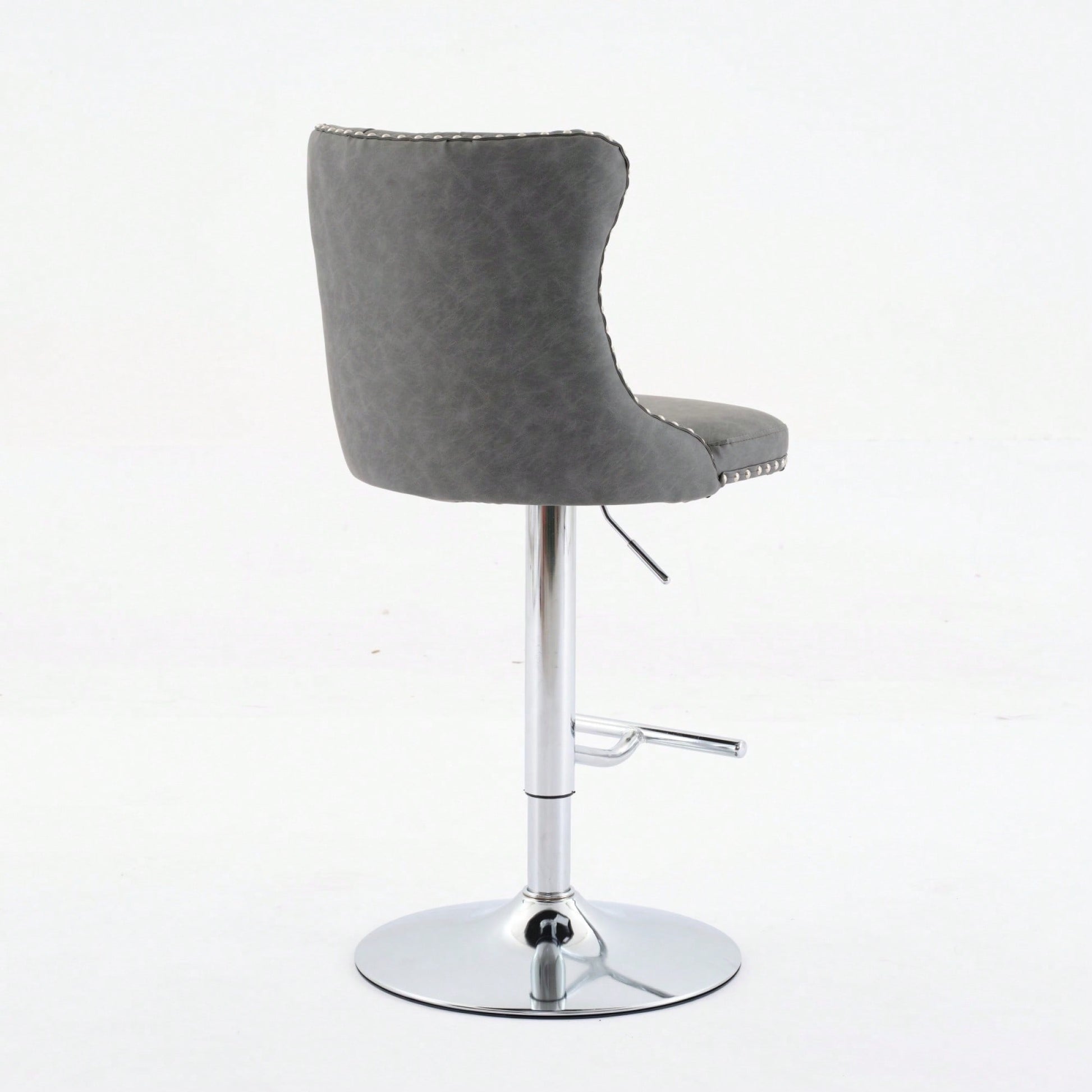 Elevate your home, pub, or kitchen island with these sophisticated barstools. Featuring a comfortable design with an adjustable seat height, they accommodate a range of seating preferences while ensuring maximum comfort. The stools are built with a sturdy chrome base that provides exceptional stability, allowing you to enjoy a secure seating experience. Additionally, the ergonomic seat promotes good posture, with waist support and hand-pulled buttons that add a touch of luxury. The decorative hand-hammered rivets enhance the overall aesthetic, making these barstools a stylish addition to your decor.