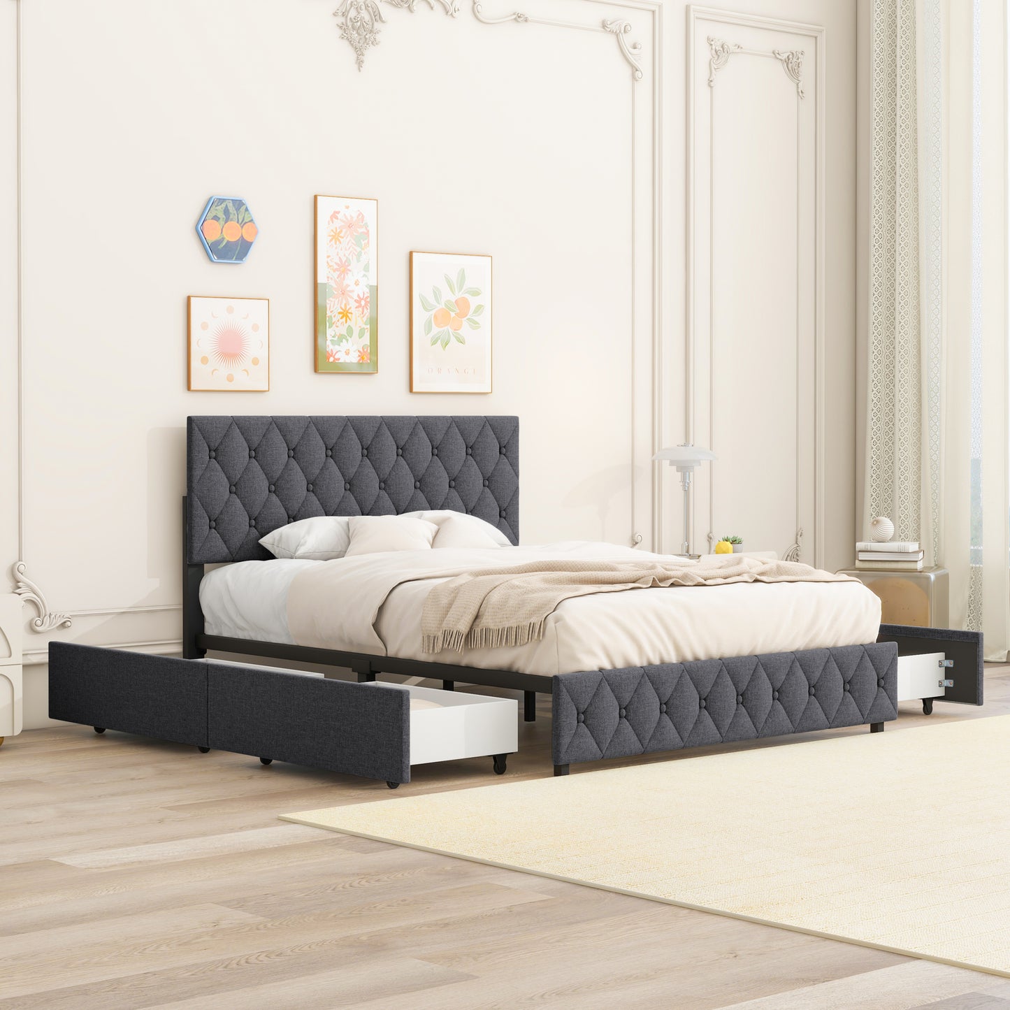 Full Size Upholstered Platform Bed Frame with Adjustable Headboard and 4 Storage Drawers Grey