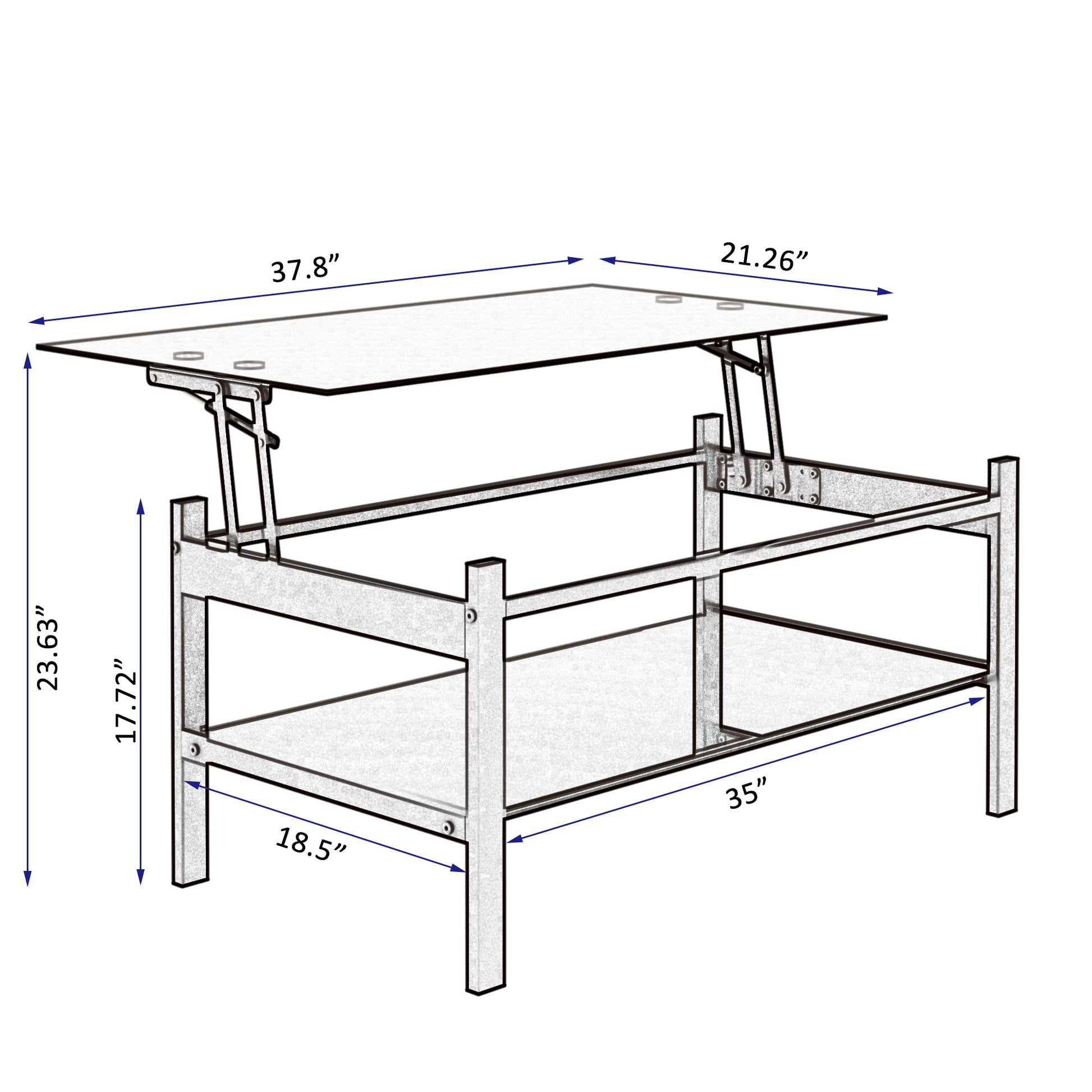 This modern glass lift top coffee table features a sleek design that enhances any living space. With a tempered glass surface, it serves multiple purposes beyond just a coffee table, making it ideal for use as a computer table or makeup station. The innovative lift-top design allows for easy access to daily items or laptops, while the lower open shelf provides ample storage for books, magazines, and other miscellaneous items. Constructed with sturdy metal tubes, this table is built to last and is easy to clean, making it a practical addition to your home.