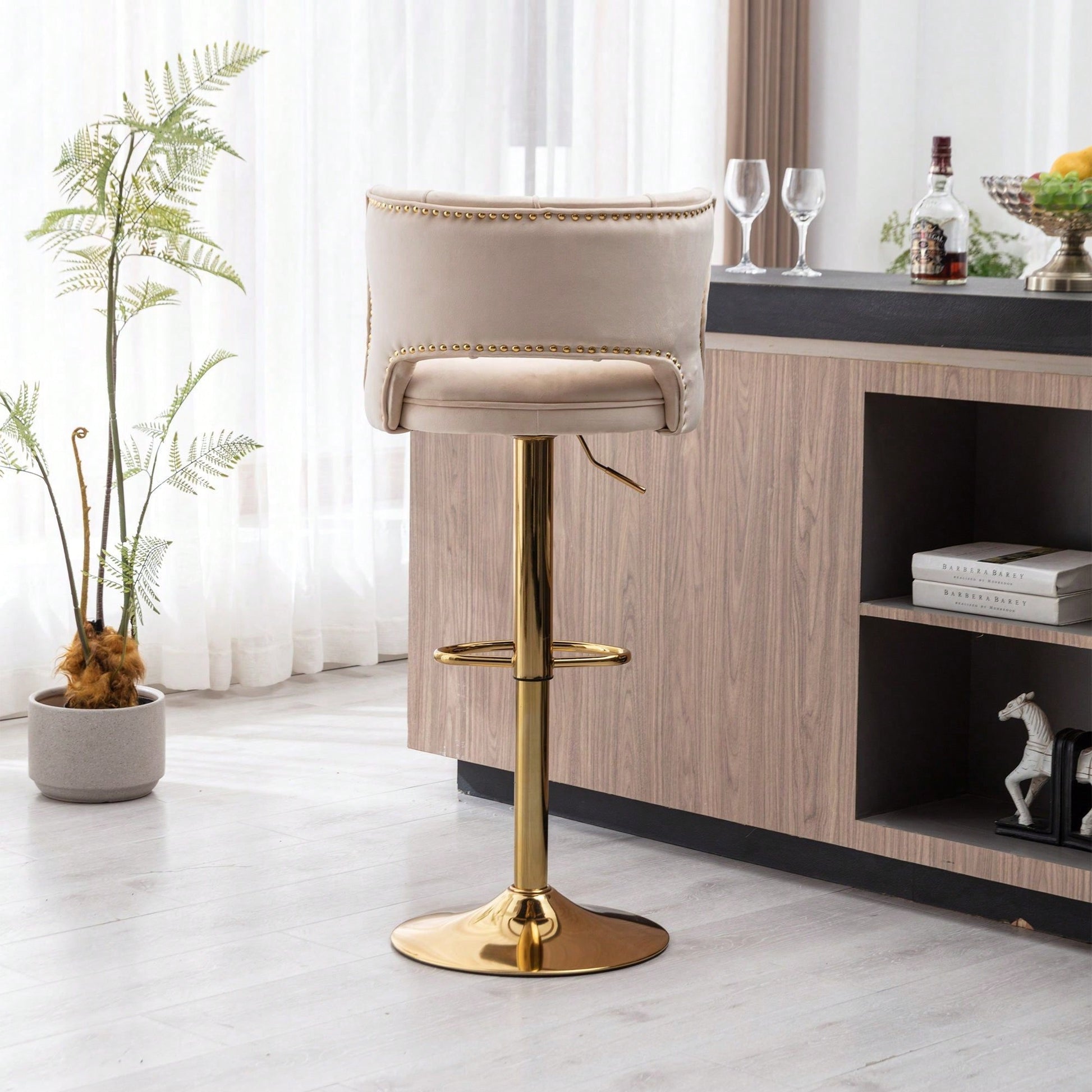 1. The counter stool is made of steel with a gold chrome finish, and it stands on a pedestal-style base with a built-in footrest bar.