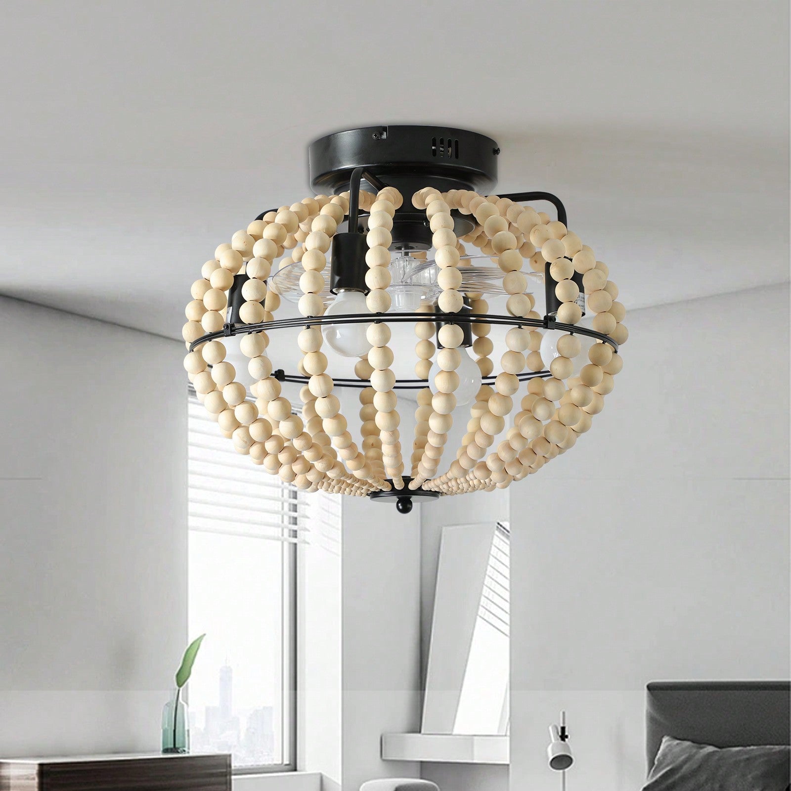 Product description: This boho chandelier combines a simple and modern style with an antique design, making it a versatile piece that can be used with a variety of decoration styles. The high-quality log-colored beads and durable black metal chassis give it a rustic charm, while the unique lamp body style design adds a touch of elegance. The beaded pendant light provides a warm and comfortable atmosphere, making it perfect for interior spaces like entryways, bedrooms, kitchens, and more. With 6 wind speed adjustments and a timing function, this chandelier with a built-in fan is not only stylish but also functional. The semi-flush mount ceiling light fixture is made to last, with anti-corrosion and anti-rust properties.