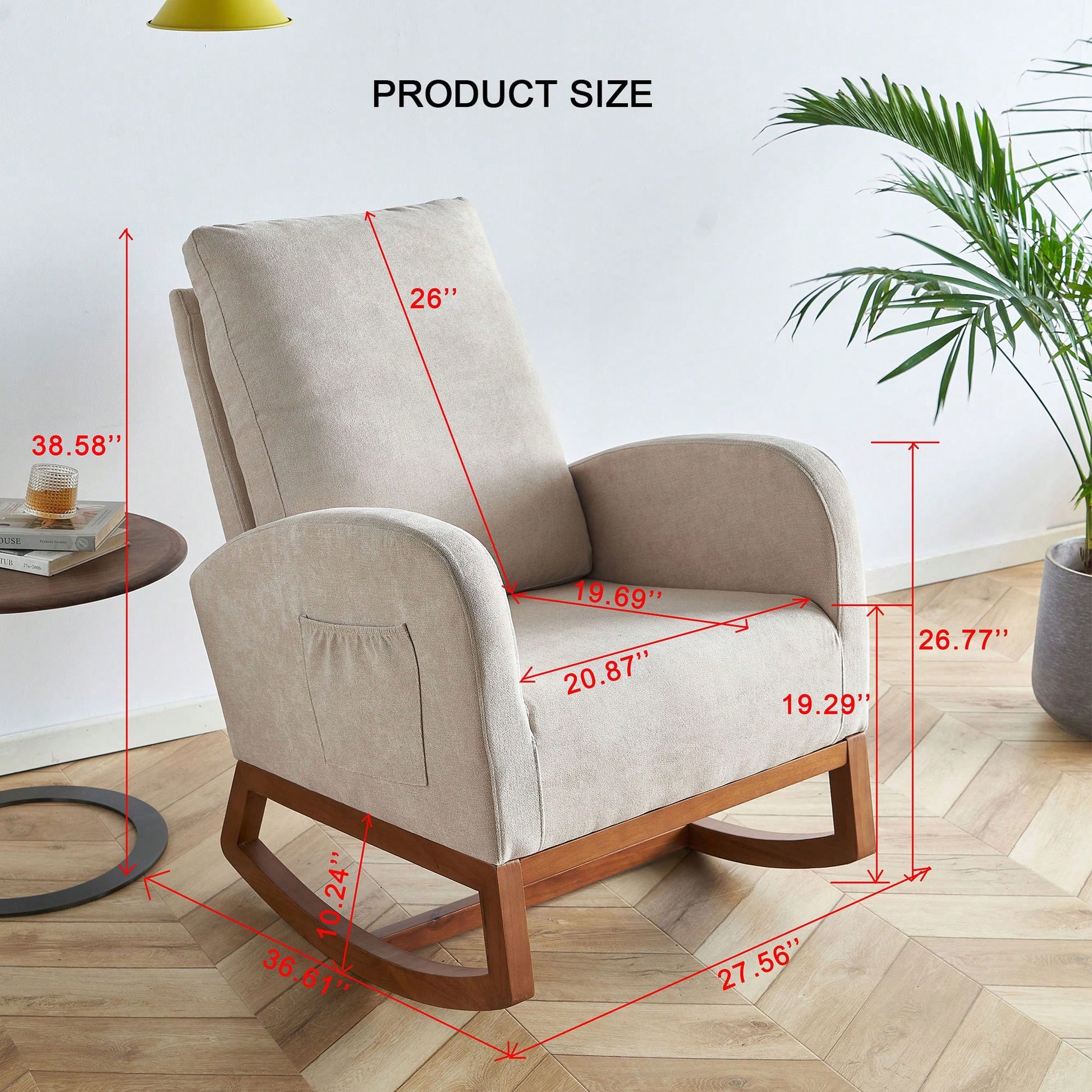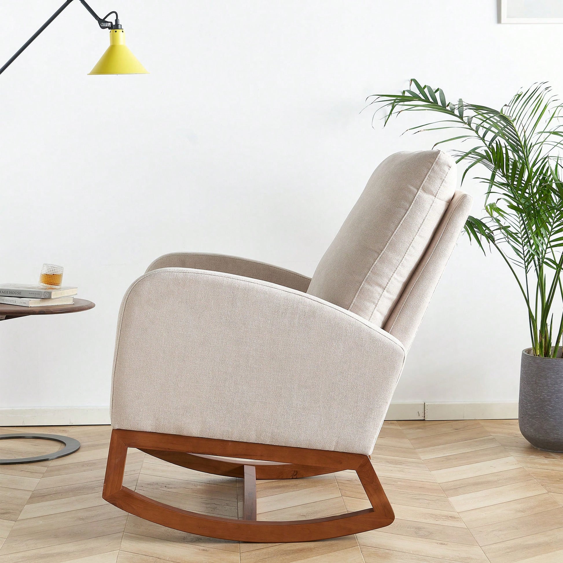 This 27.56'' wide linen rocking chair in beige is the perfect addition to any nursery, living room, or shared space. The solid wood frame provides strong support, while the high backrest and ergonomic arm height ensure comfort and safety. The chair is designed to reduce fatigue, allowing you to relax in style. Its modern look and contoured design make it a charming piece for any décor.