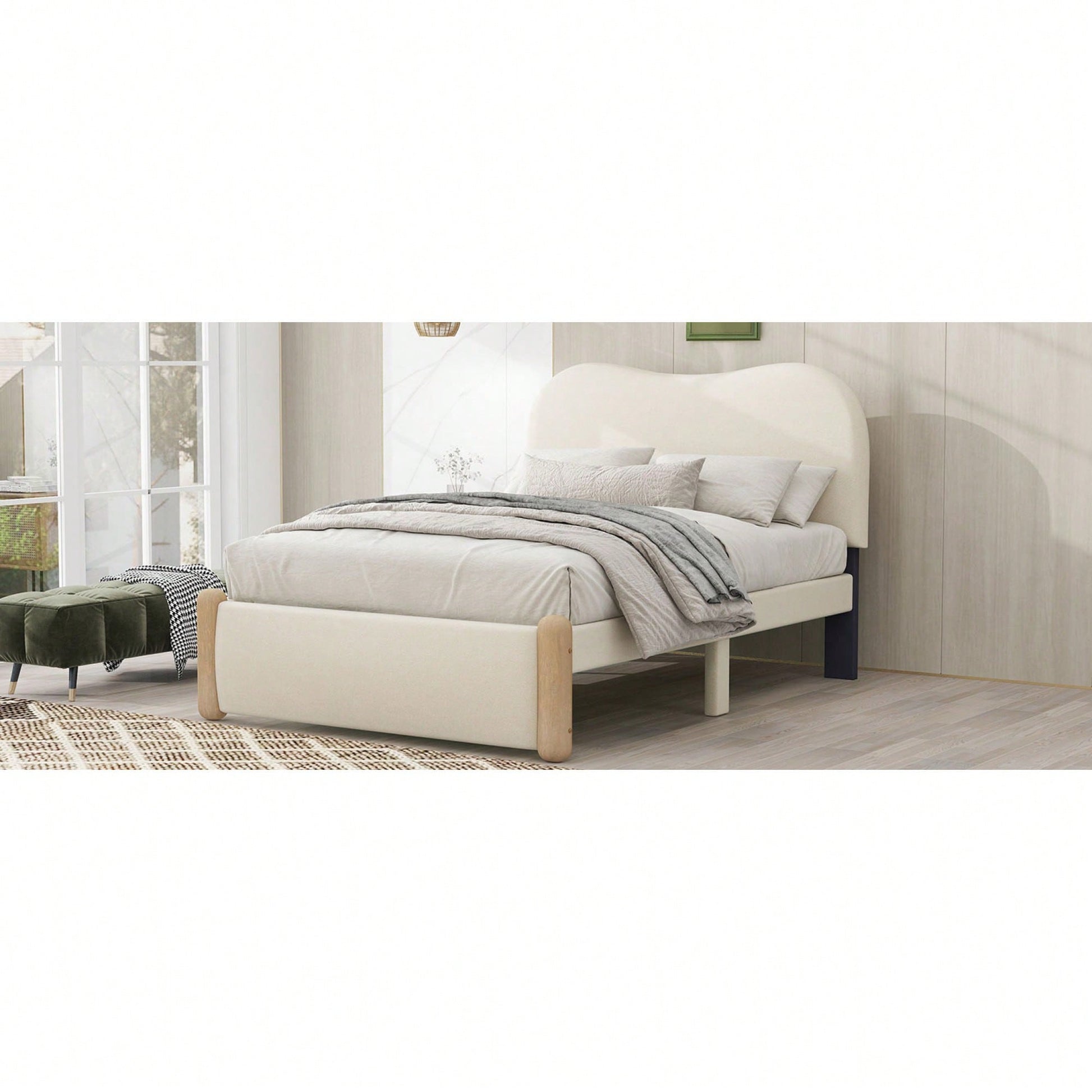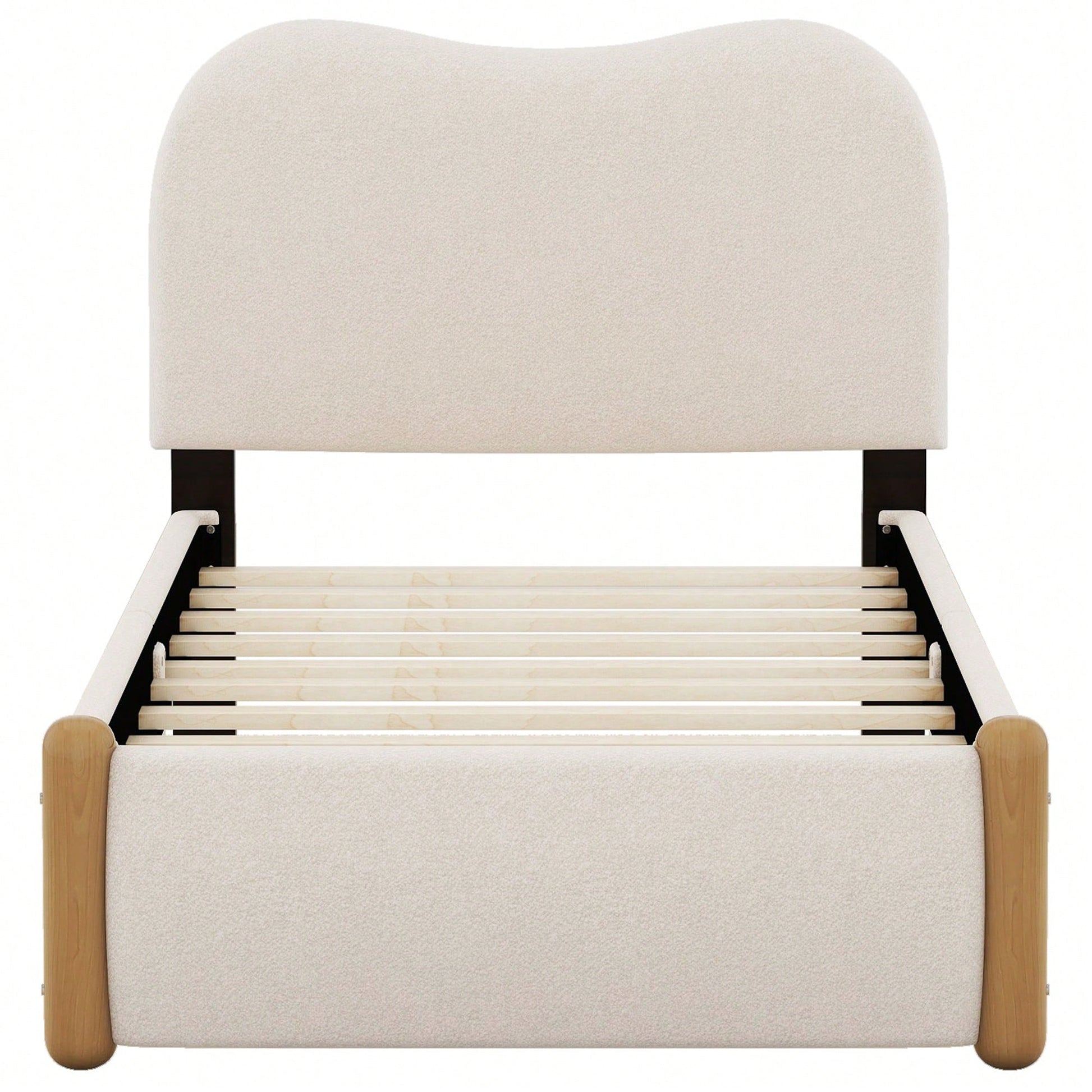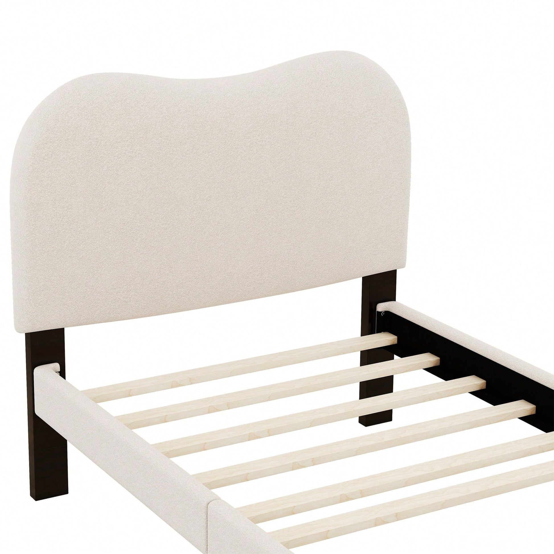 This platform bed features a gracefully arc-shaped headboard that enhances the warmth of your bedroom space. The upholstery is done in a beige Berber fleece, providing a cozy and inviting aesthetic that blends seamlessly with various home styles. With a sturdy construction made from solid pine wood and MDF, this bed ensures durability and can support a substantial weight capacity. The unique design eliminates the need for a box spring, thanks to its reliable wooden slat support system that keeps the mattress secure and prolongs its life. Assembly is straightforward, with all parts clearly labeled and an easy-to-follow manual provided, making it possible to set up the bed with minimal effort.