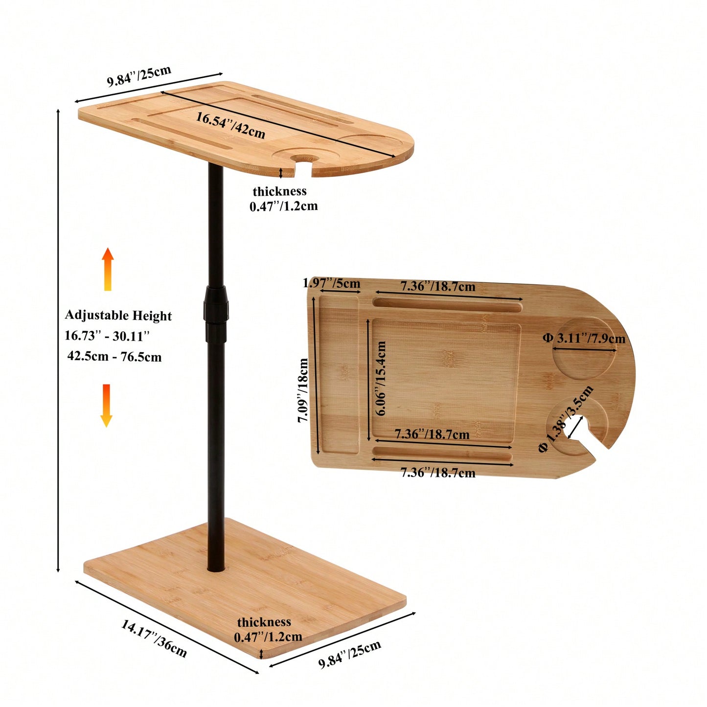 Introducing a versatile C-shaped side table designed for ultimate convenience. This table fits snugly under sofas, chairs, or beds, providing easy access to snacks, drinks, and devices. Its compact size makes it perfect for small spaces, while the innovative design includes an extra storage shelf for books and personal items. The height-adjustable feature allows for use by both kids and adults, making it suitable for various activities. Crafted from bamboo and metal, it combines a modern aesthetic with durability and easy maintenance.