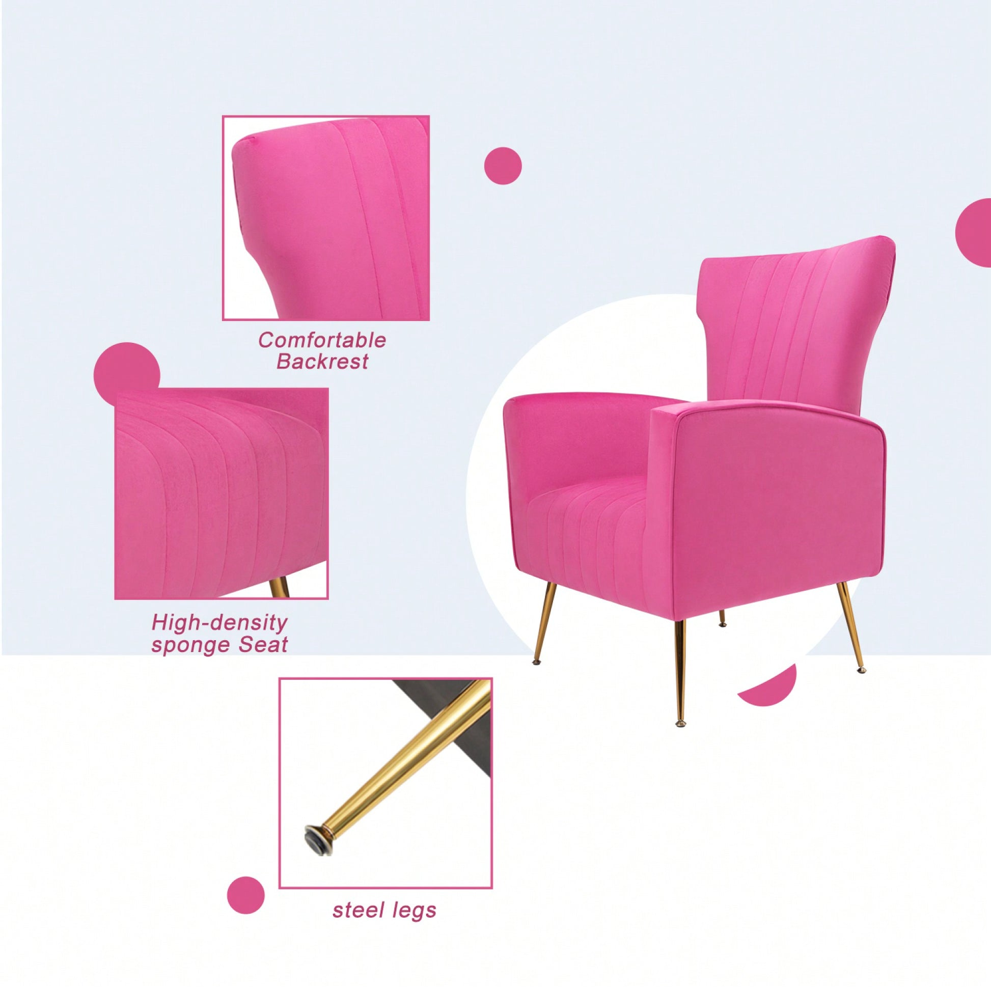 This accent chair features a stylish wingback design that adds sophistication to any room. Upholstered in rich velvet fabric, it exudes luxury and comfort, making it an excellent addition to your living room, bedroom, or dining area. The high-density sponge filling provides great support, ensuring relaxation whether you're sitting or leaning back. The chair's durable metal frame not only guarantees stability with a weight capacity of 300 lbs but also enhances its chic appearance with its elegant gold finish. Non-slip pads on the legs protect your flooring and provide added safety. Assembly is simple and straightforward, requiring no tools-just follow the six easy steps to set it up in no time.