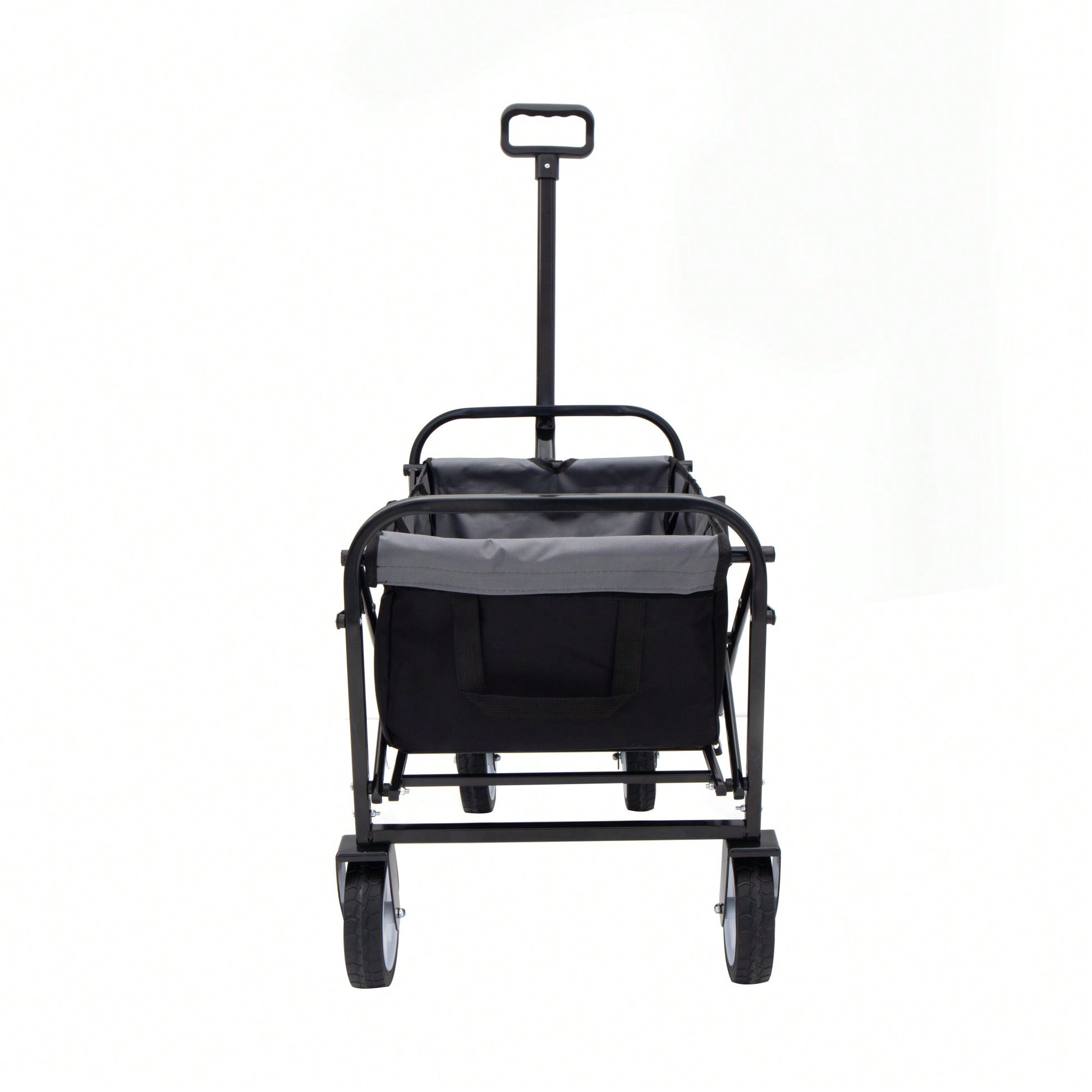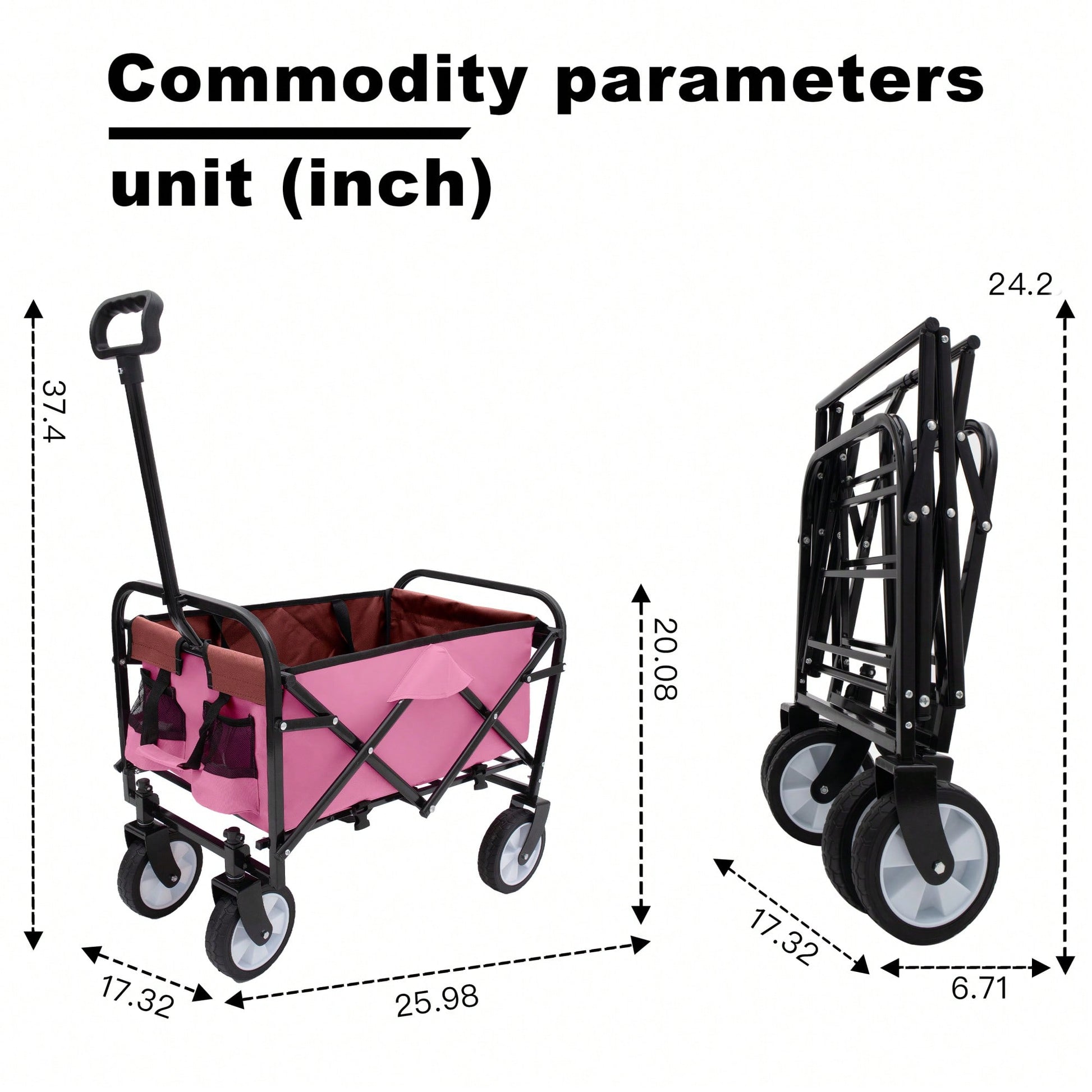 This collapsible foldable wagon cart is perfect for a variety of activities, including camping, shopping, gardening, and beach outings. Its unique strapping system allows for secure transport of taller or longer items, enhancing versatility and stability. Weighing only 13.5 lbs, it is lightweight and easy to carry. When folded, it measures 17.0" x 6.69" x 24.8", making storage and travel effortless. The heavy-duty frame ensures durability, while the all-terrain 360-degree swivel wheels make it easy to navigate various surfaces. This wagon is designed to meet your utility needs while adding a touch of modern style.