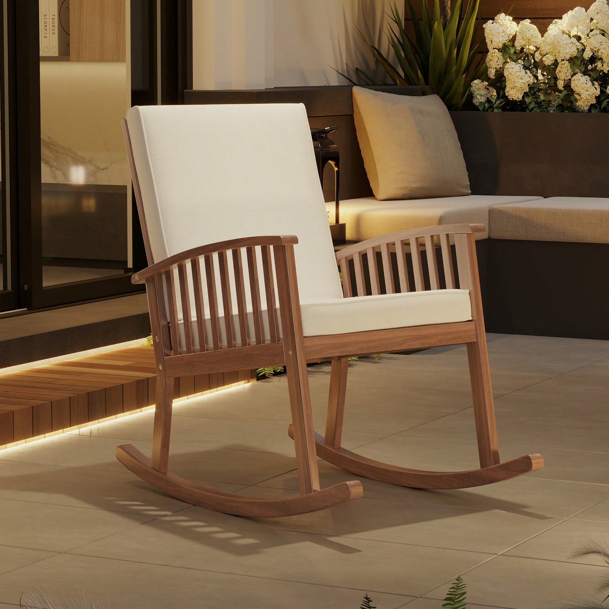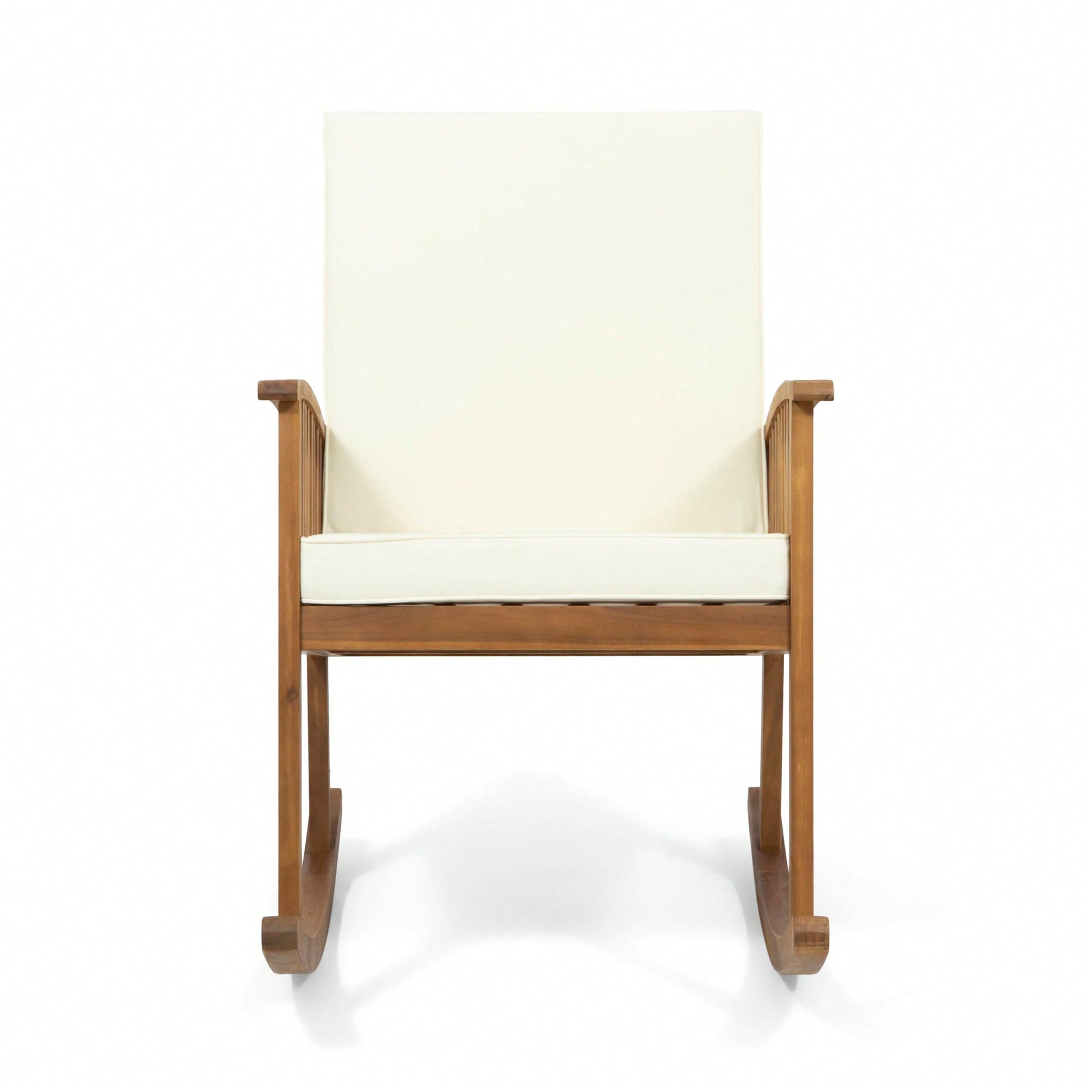 Soak in the summer sun with the CASA ACACIA ROCKING CHAIR, designed for comfort and relaxation in your porch or backyard. The chair features a stunning acacia wood frame paired with plush back and seat cushions, offering both style and coziness. Its gentle rocking design allows for a soothing experience, making it the perfect spot to unwind outdoors. The acacia wood is resilient against outdoor elements and maintains its beauty over time. The water-resistant cushions ensure easy maintenance, letting you enjoy your summer lounging without worry. Assembly is required, with all necessary tools and instructions included.