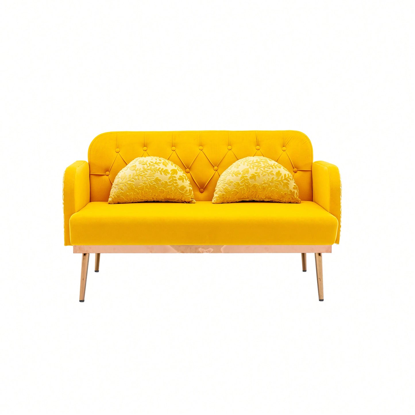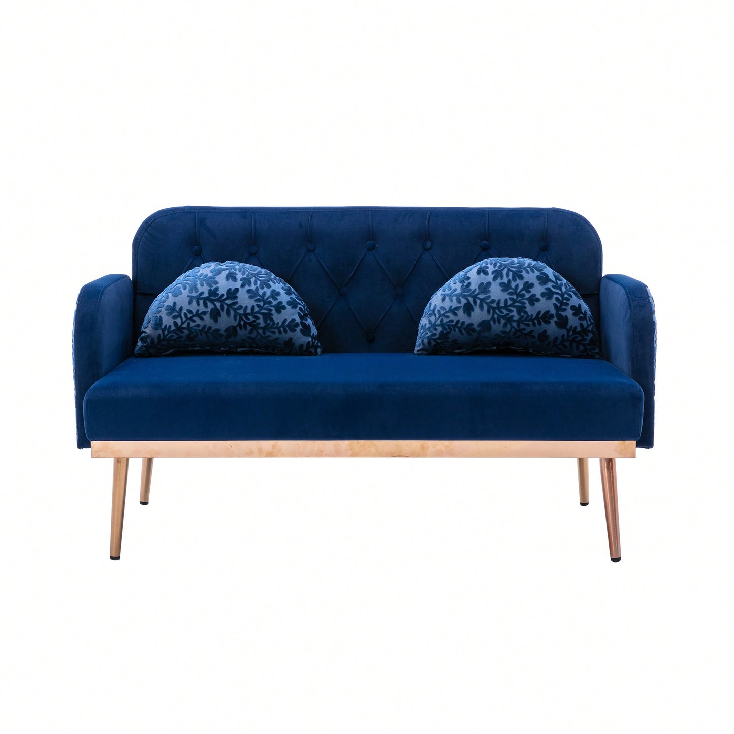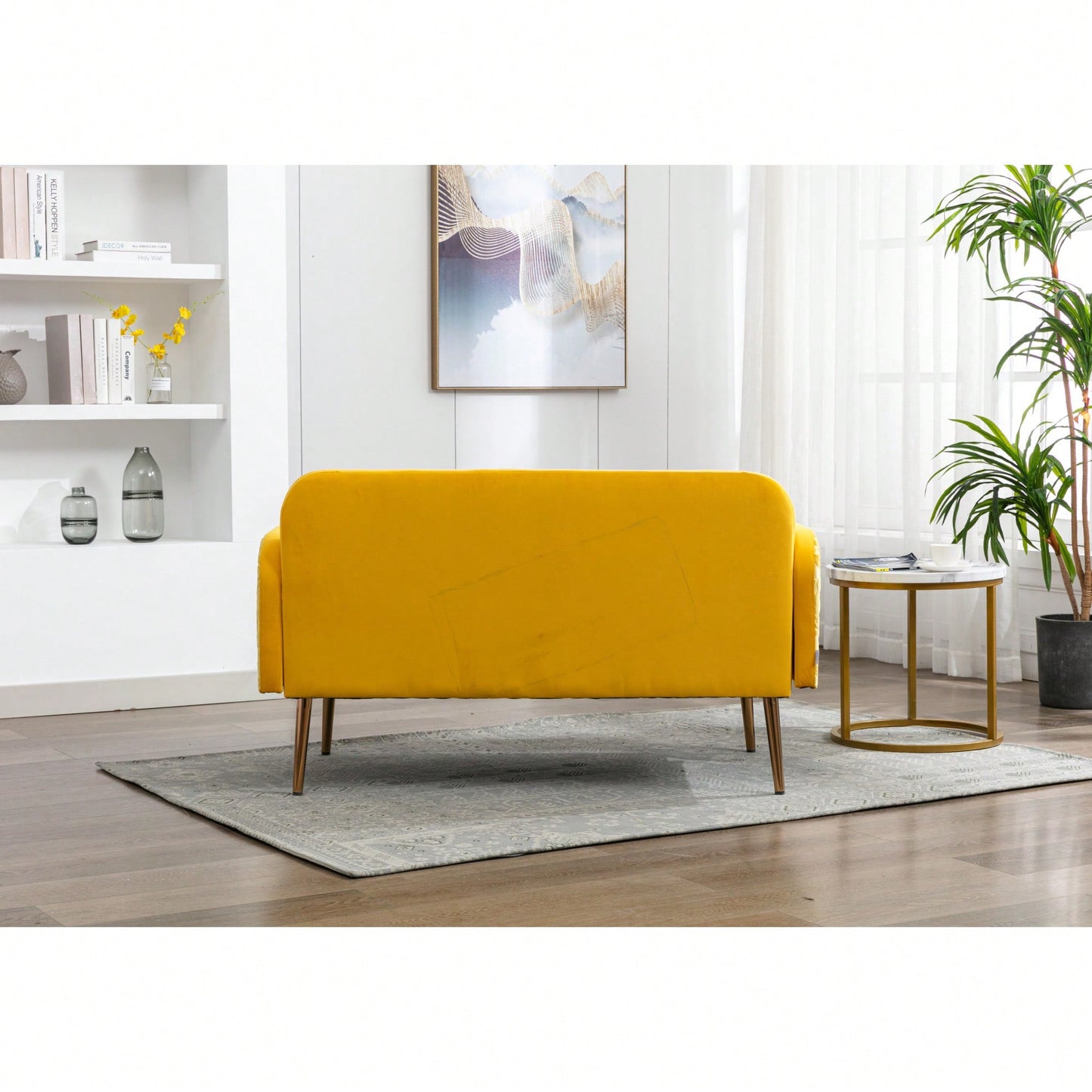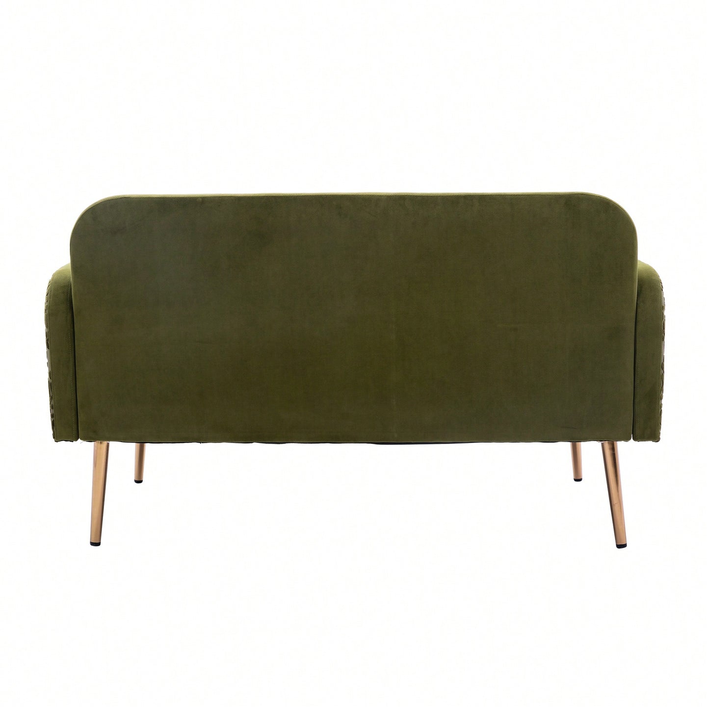 **Key Features:** - Compact design ideal for small spaces - Perfect for relaxing and entertaining - High-density foam seat and backrest for maximum comfort - Sturdy wood frame supports up to 600 pounds - Gold metal legs for enhanced stability and durability **Product Description:** This modern velvet loveseat sofa is an elegant addition to any living room, bedroom, or leisure area. Its compact size makes it suitable for limited spaces, while the luxurious velvet upholstery offers a stylish look. The high-density foam filling ensures comfort whether you're unwinding after a long day or hosting guests. The robust wood frame and quality springs provide impressive support, accommodating up to 600 pounds. The gold metal legs not only add a touch of sophistication but also enhance the overall durability of the sofa. Assembly is straightforward with clear instructions and all necessary parts included, making setup quick and easy. **Specifications:** - Weight capacity: 600 pounds - Material: Velvet upholstery, wood frame, high-density foam - Leg material: Gold metal - Assembly required: Yes