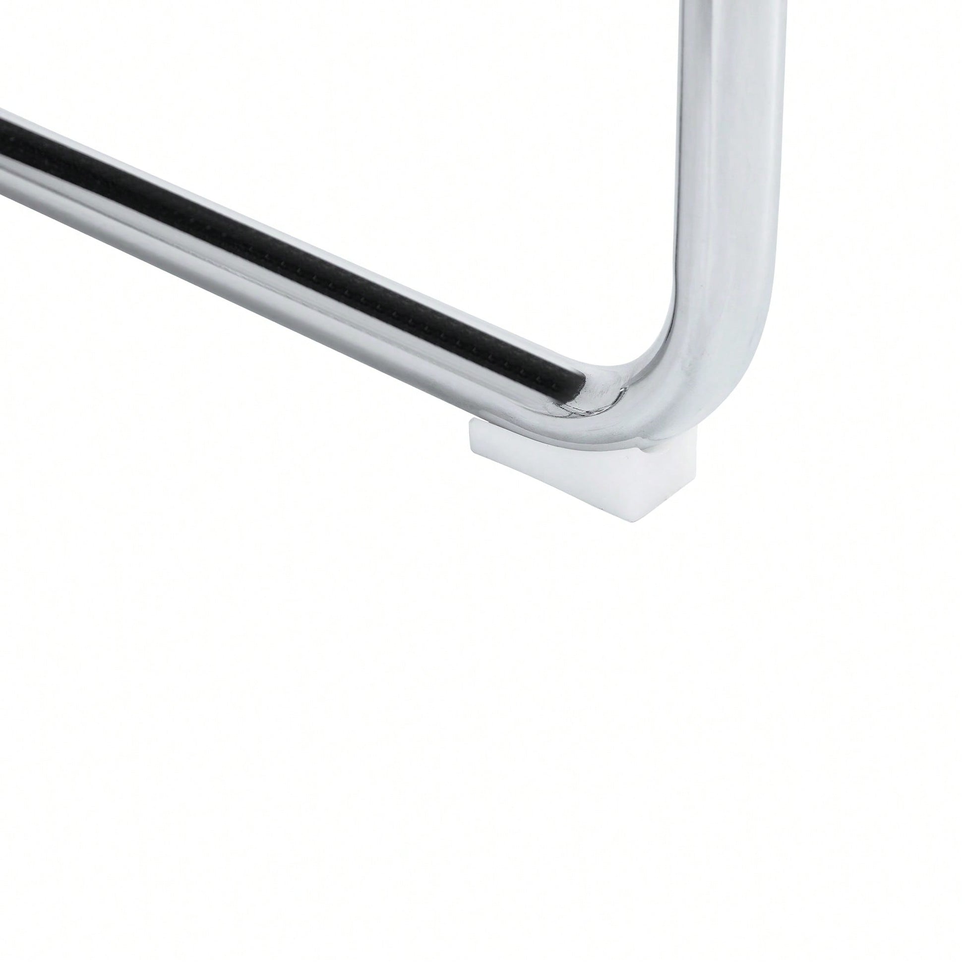 This 51.5" decorative contemporary bench features a striking black faux leather top that beautifully contrasts with its sleek silver metal base. Ideal for any setting, it can serve as a dining bench, a shoe-changing stool, or a bed end stool. The bench is crafted with a robust metal frame and covered in durable PU leather, providing both style and comfort. The soft foam filling in the seat and backrest ensures a pleasant seating experience. Additionally, protective pads at the bottom help prevent accidental sliding and protect your floors from scratches. Assembly is straightforward with detailed instructions included.