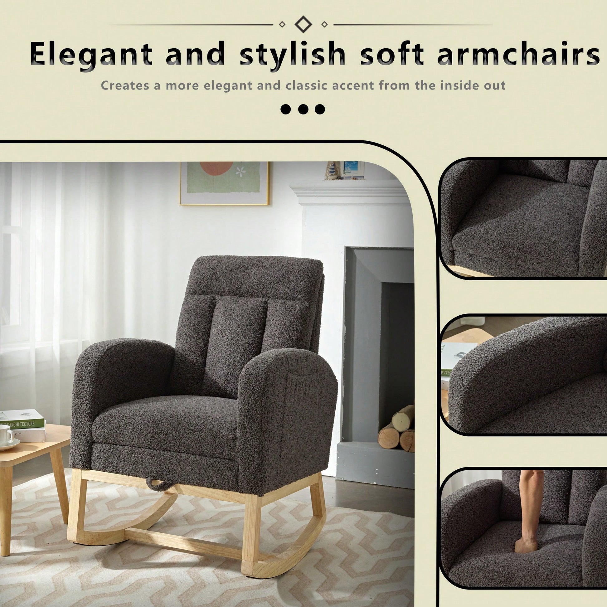 This modern accent rocking chair features a gentle rocking design that promotes relaxation, making it ideal for nurseries or living rooms. The chair is equipped with high-density sponge filling in both the backrest and seat cushion, ensuring lasting comfort and support even during extended use. Its sturdy construction includes a solid plywood frame and a thickened rubber wood base, providing stability with a weight capacity of up to 300 lbs. The breathable polyester fabric is easy to maintain, while the stylish design adds a chic touch to any space. Additionally, a practical side pocket offers convenient storage for magazines and remotes, enhancing the chair's functionality.